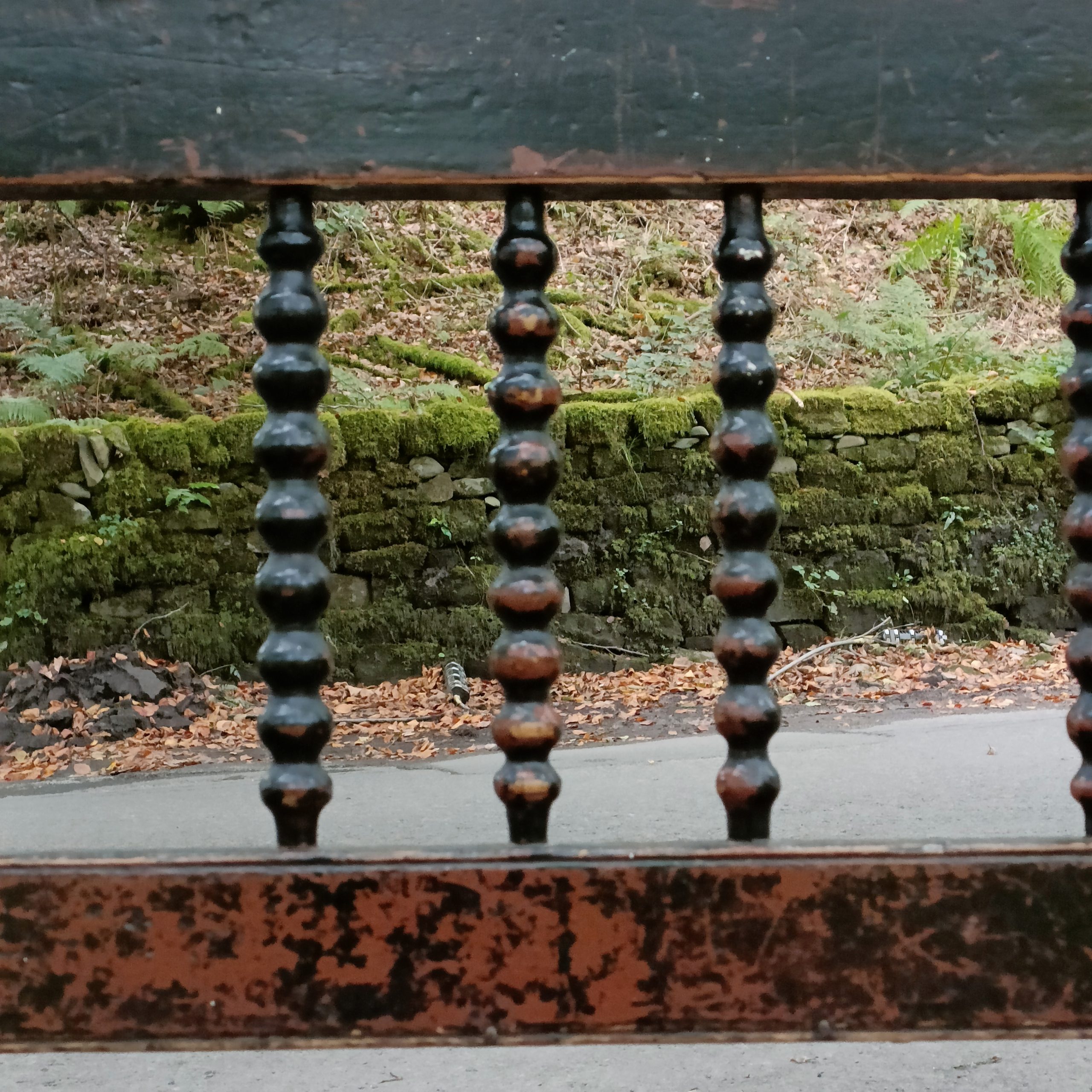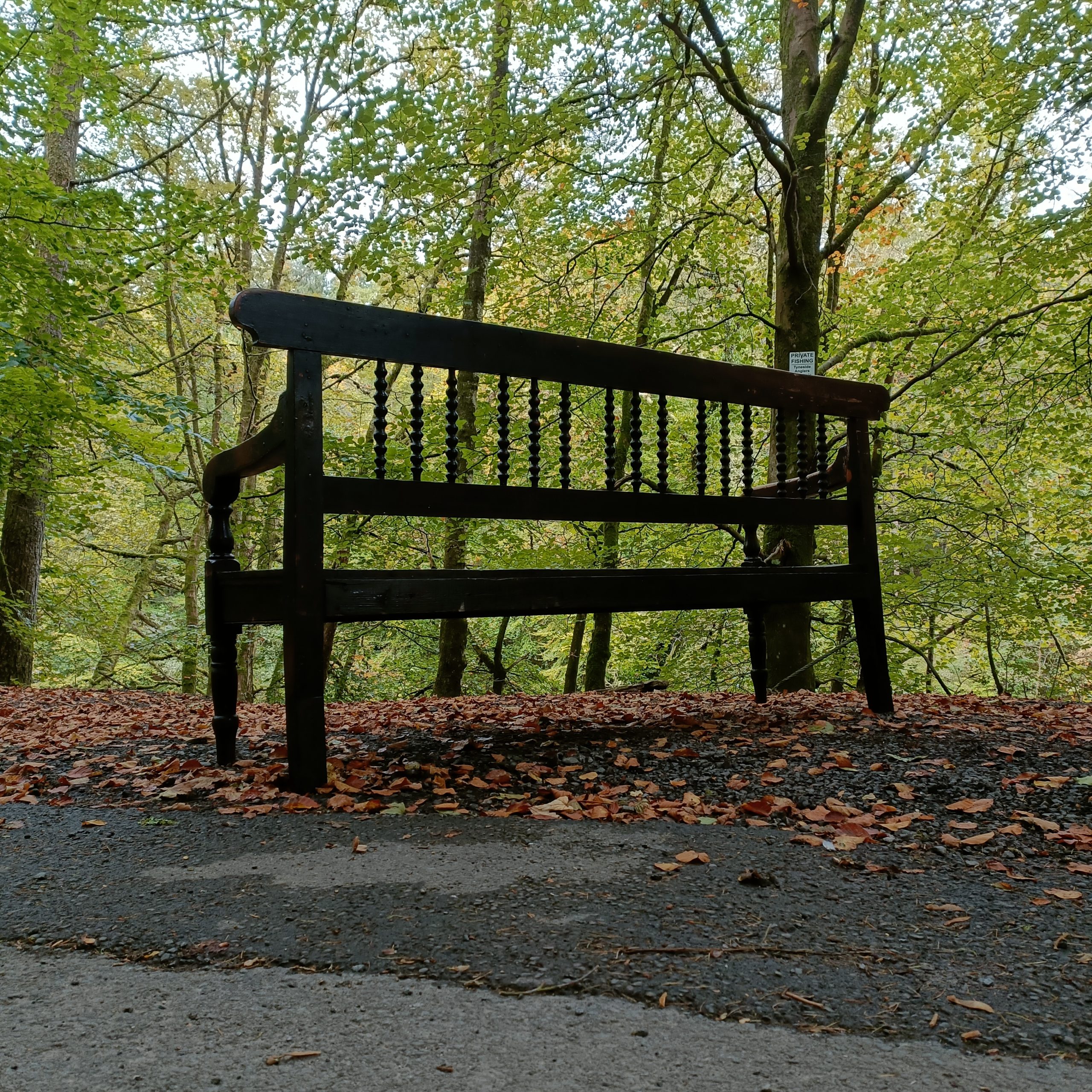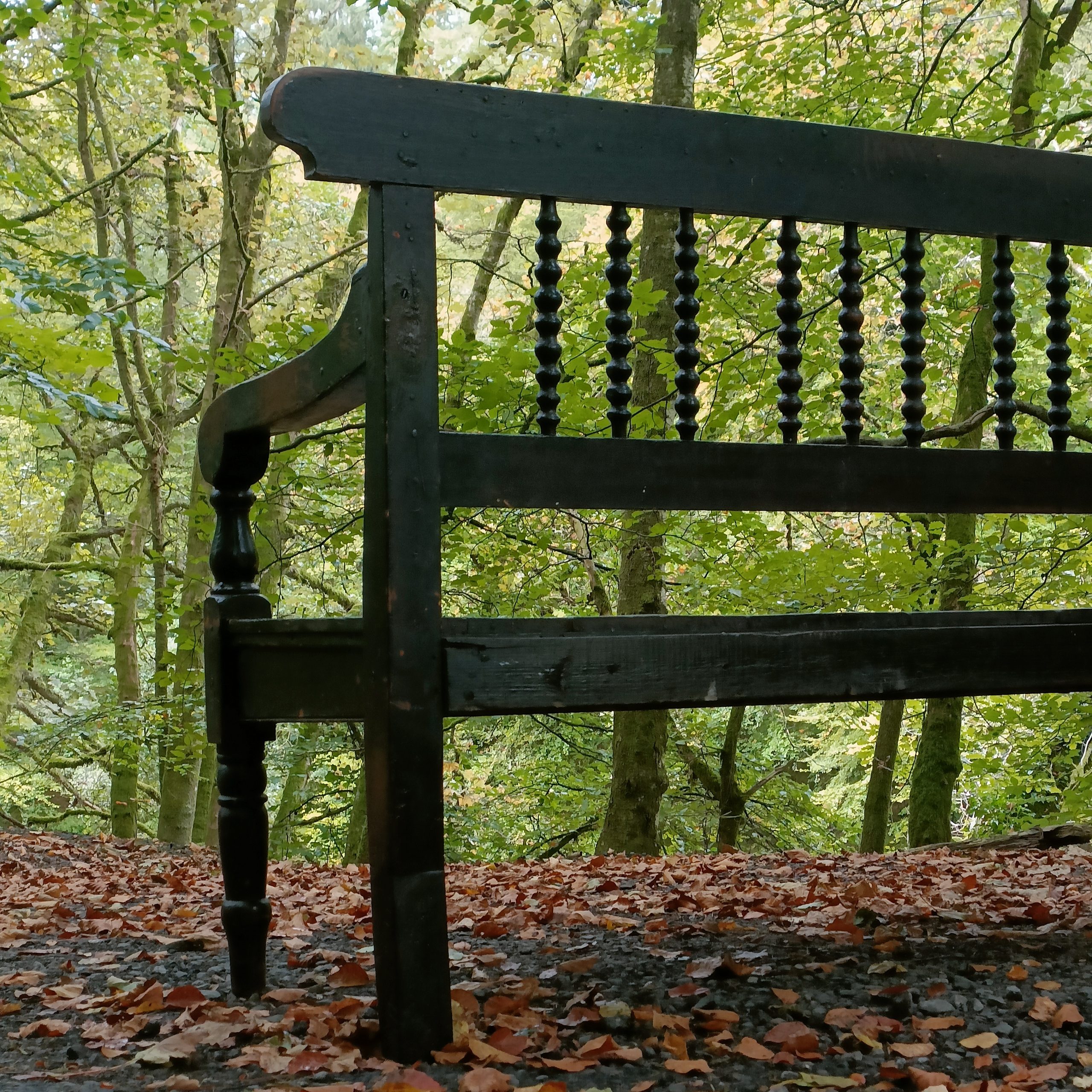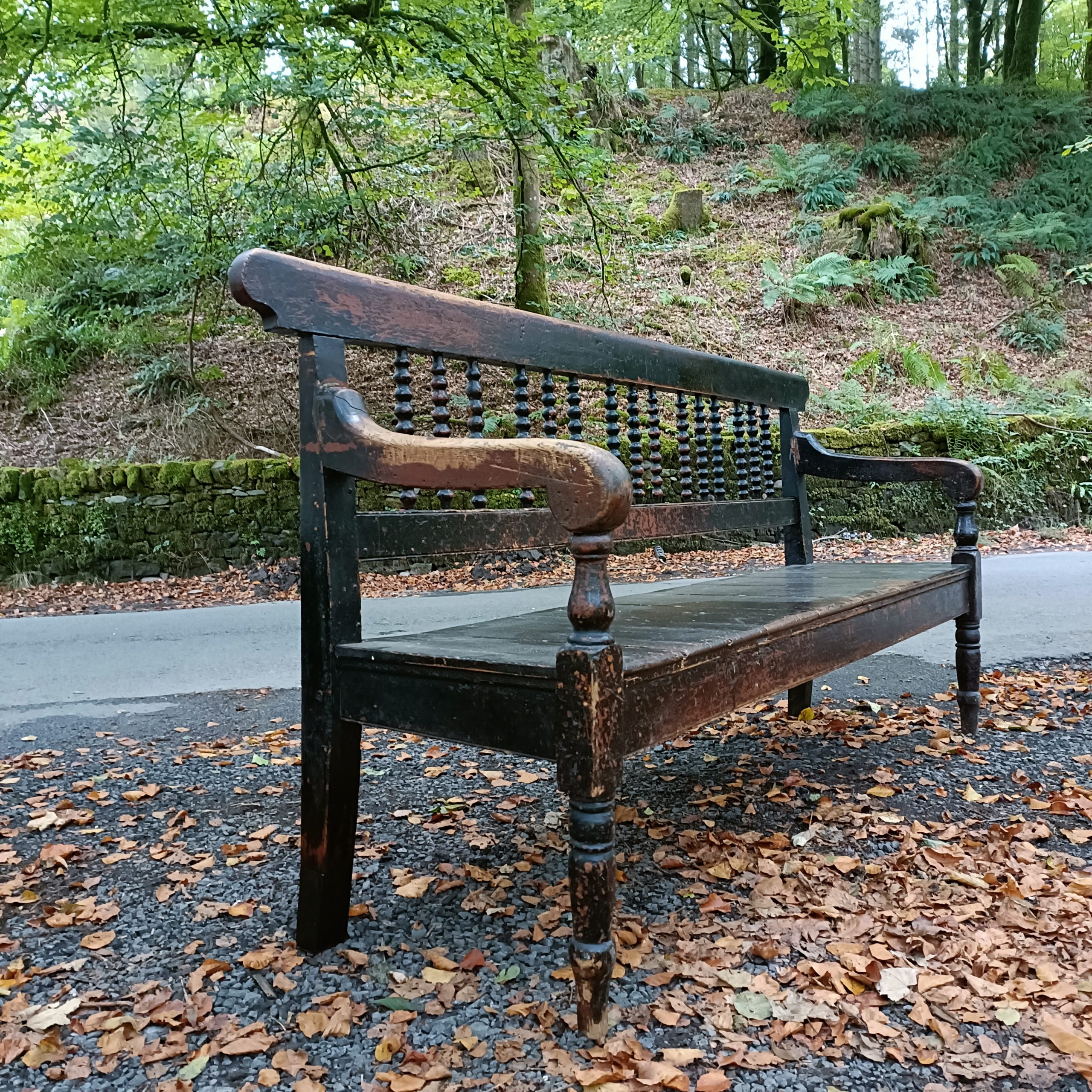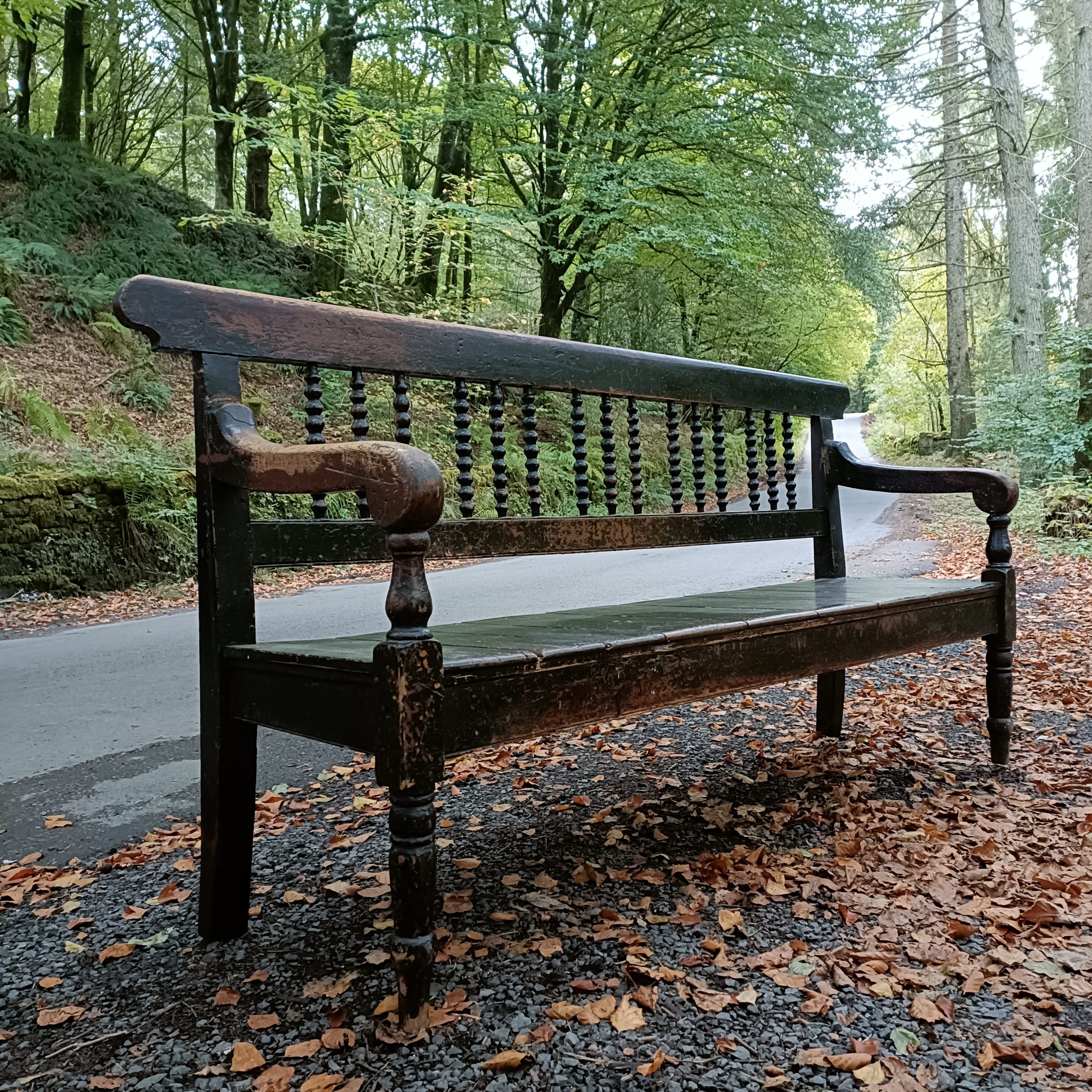 Bobbin turned backrest with a planked seat above two front turned legs.