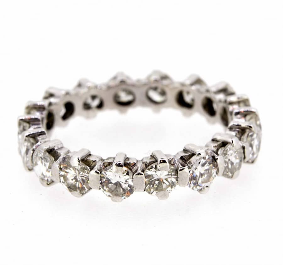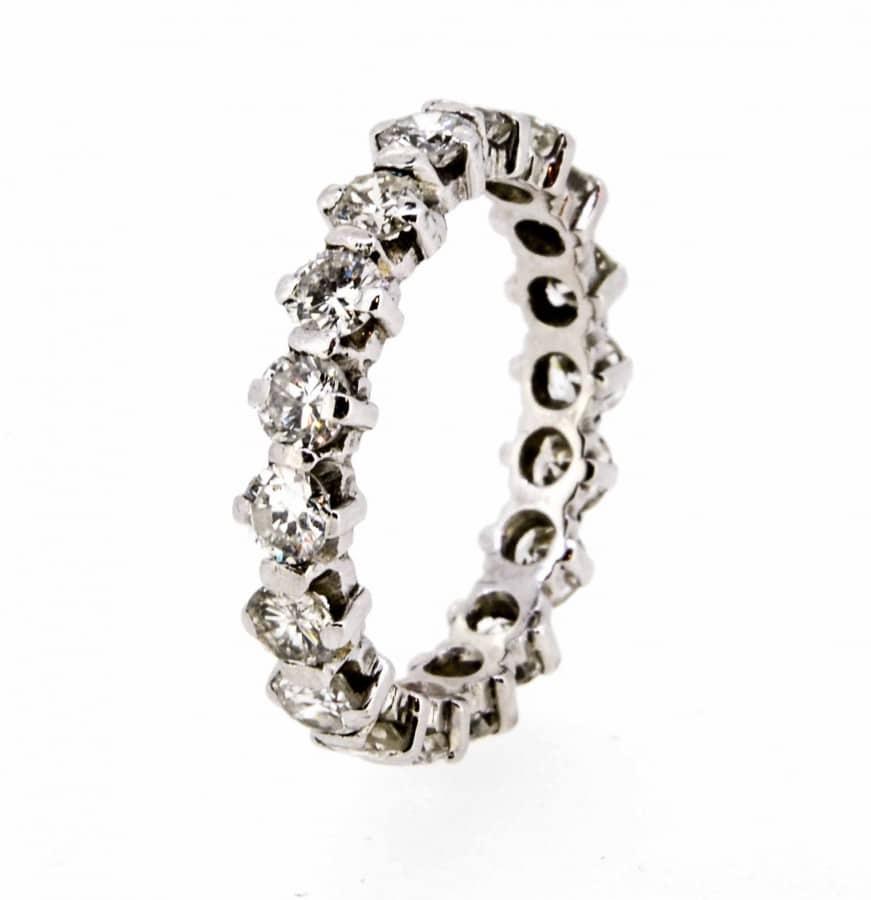 This classic vintage diamond full eternity ring features 18 brilliant cut diamonds of V.S.2/S.I 1 clarity and G/H colour,totalling approximately 1.75cts in parallel claw settings.The 3 mm wide white mount is unmarked but tests as 18ct and is UK size J 1/2,US size 4 3/4.