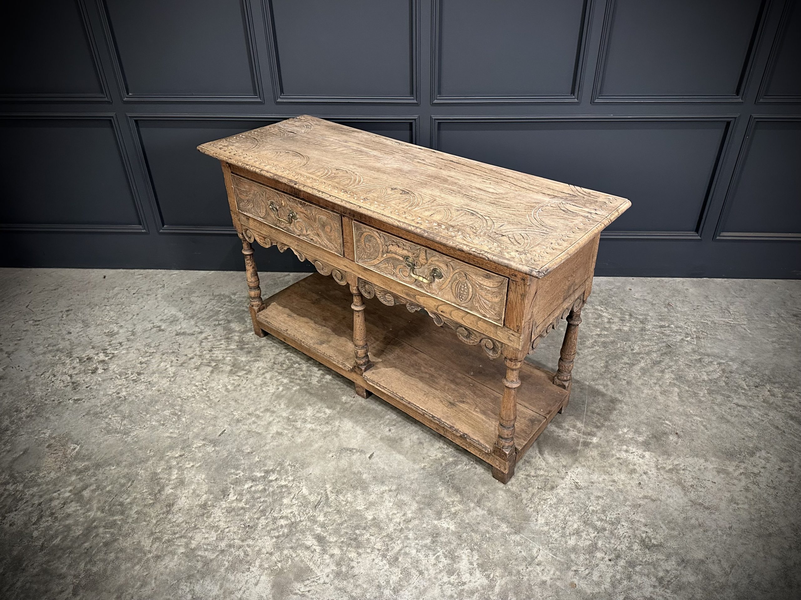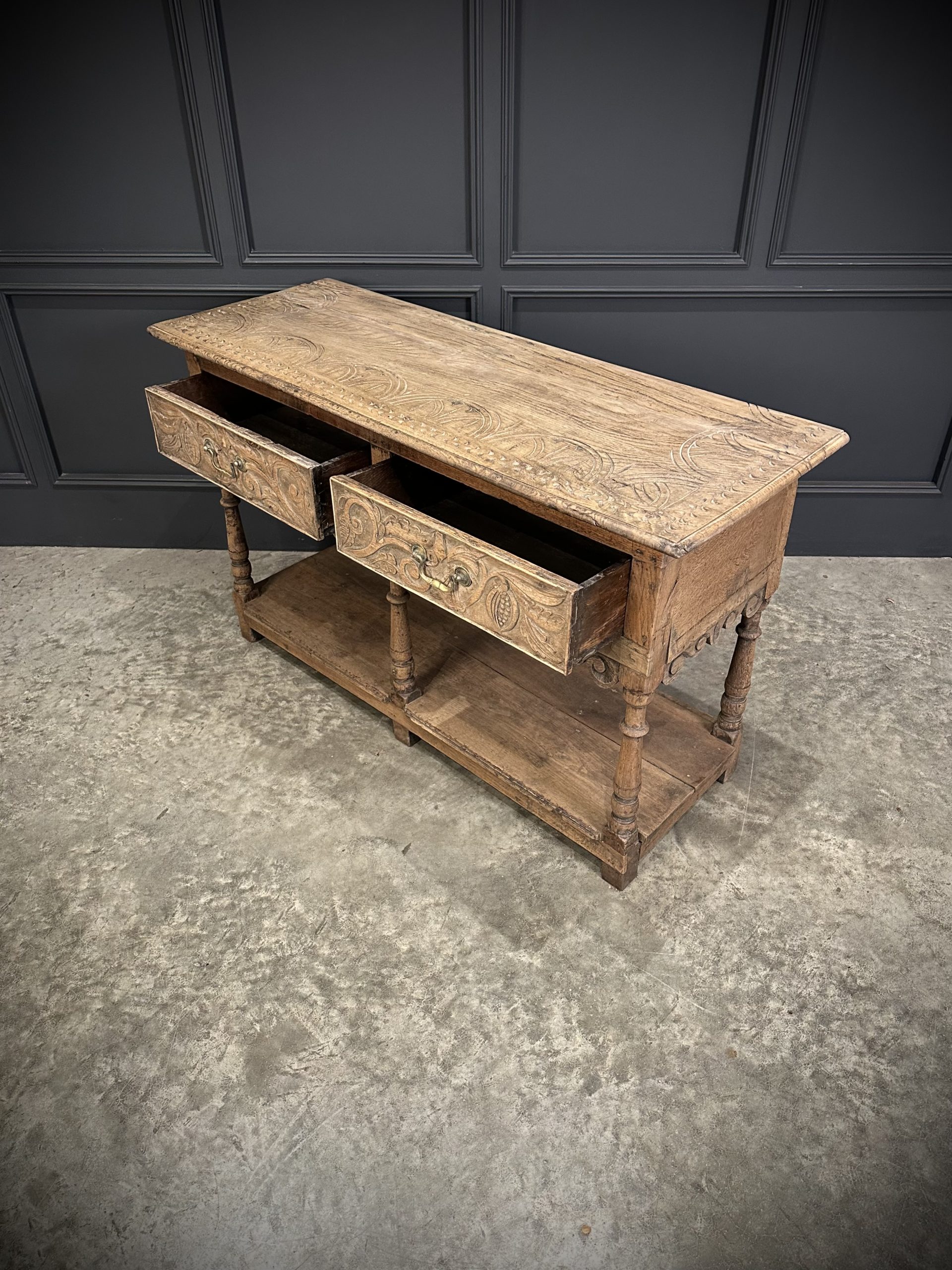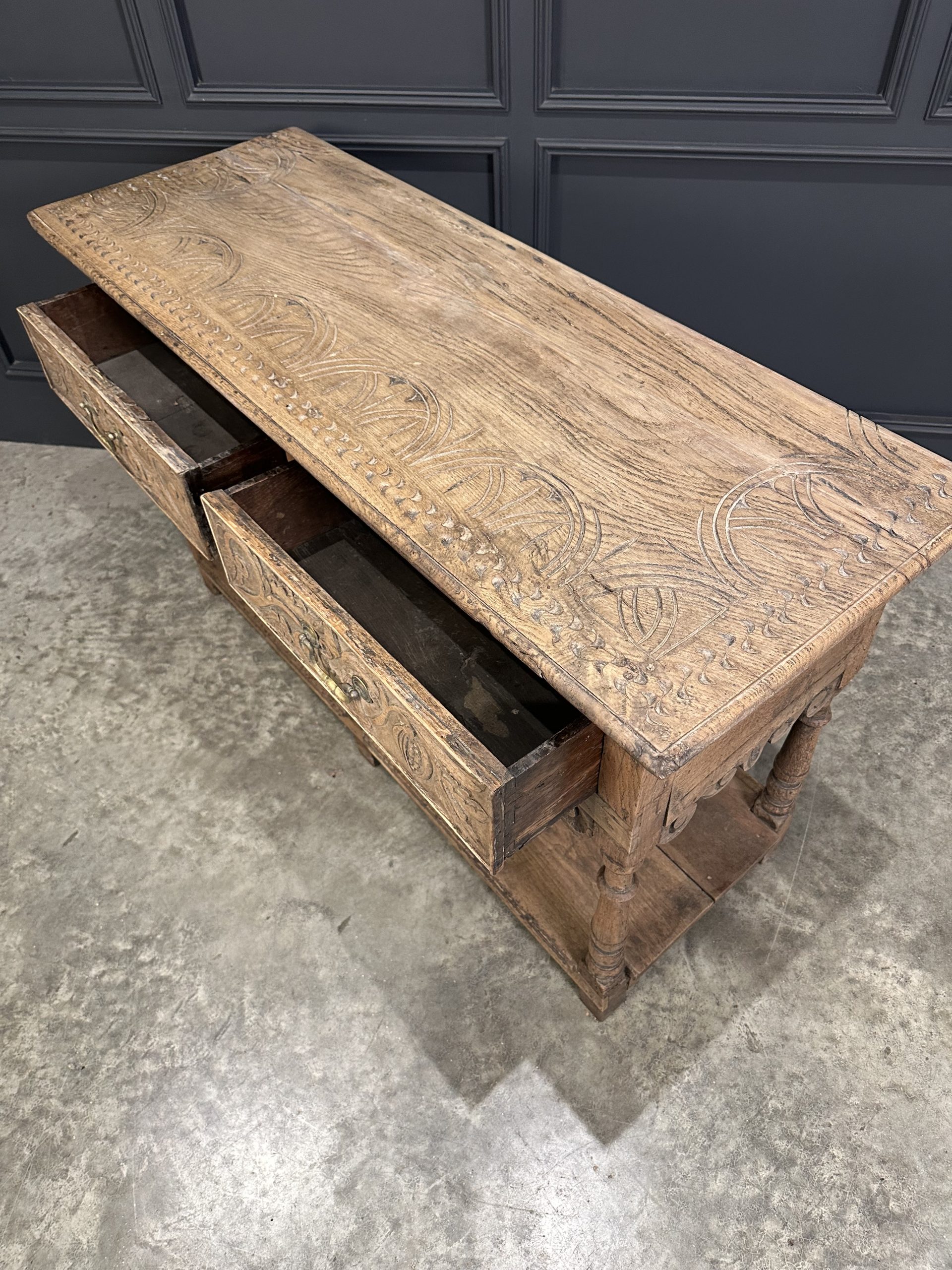 The rectangular top sits above two generously sized drawers, each adorned with beautifully hand-carved foliate decoration and brass handles.