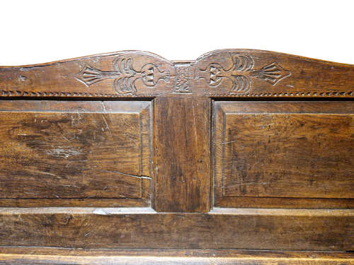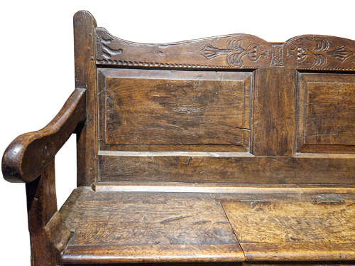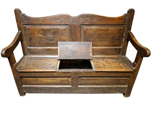 A charming 18th century oak box-seated settle, likely French in origin, dating to around 1780. The panelled back and base are complemented by shaped arms and a lift-up seat, revealing practical storage beneath.