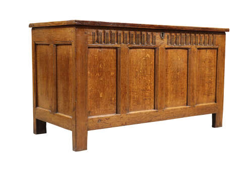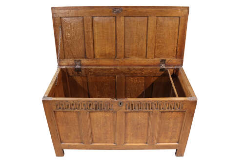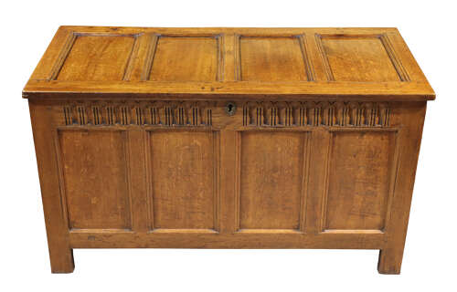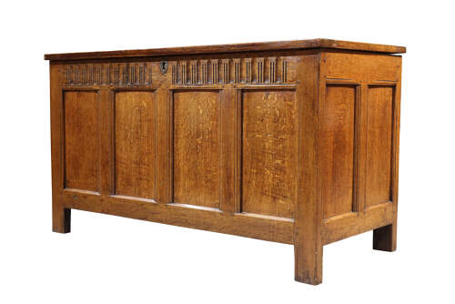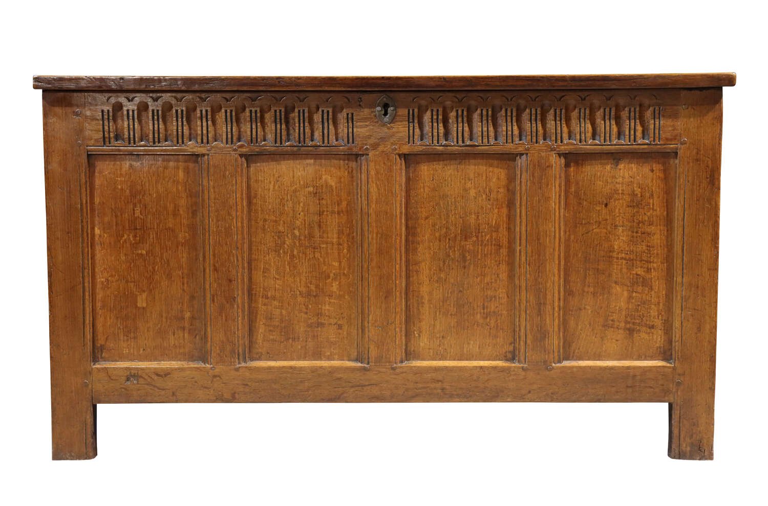 A handsome 18th century oak coffer with four panelled front and carved frieze detail. The hinged lid opens to reveal a spacious interior and original fitted candle box. Beautiful warm colour and patina, ideal for use as a blanket chest, coffee table or decorative storage.