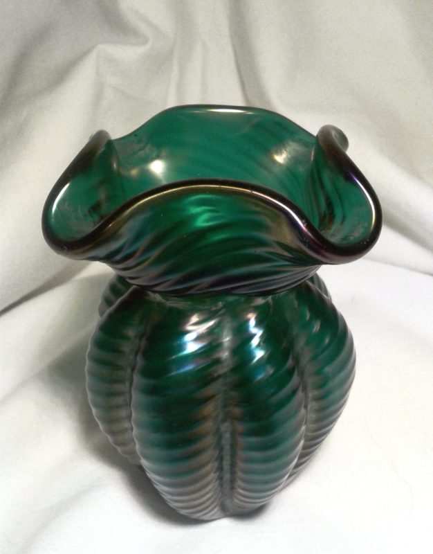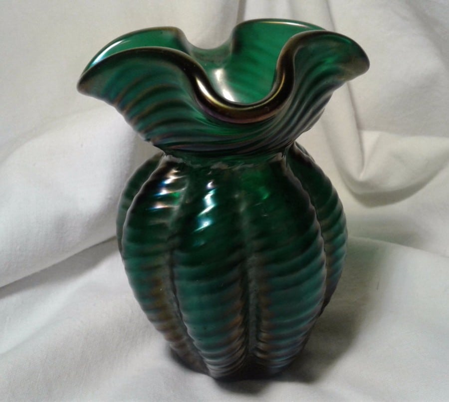 Early Loetz iridescent vase. A charming piece with a deep ribbed body and quartered out splayed rim. Superbly balanced shape with a spiralling translucent striping from top to bottom. Circa 1900s probably around 1905 ish. Perfect in every detail.