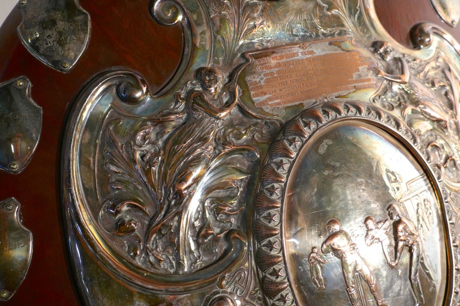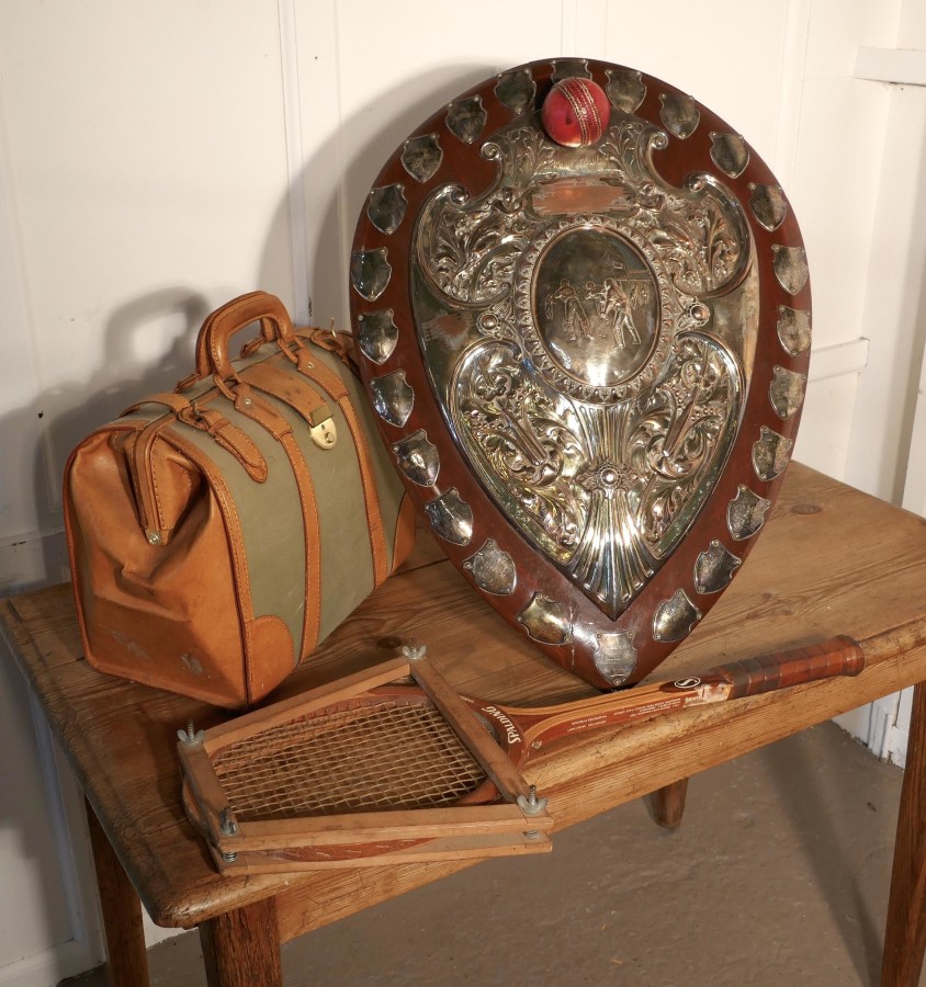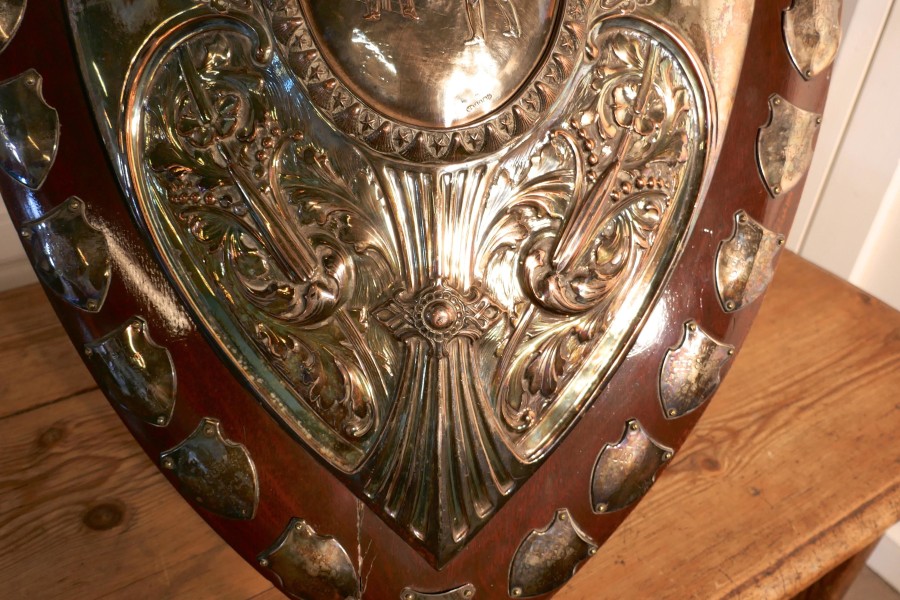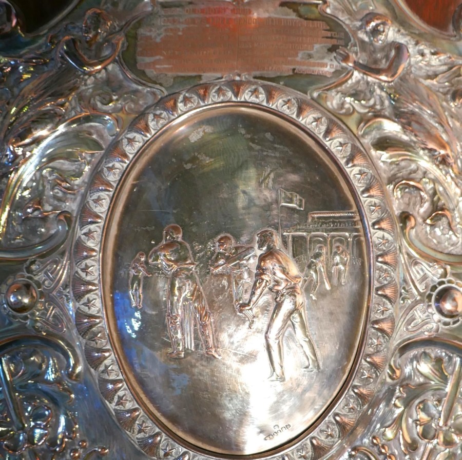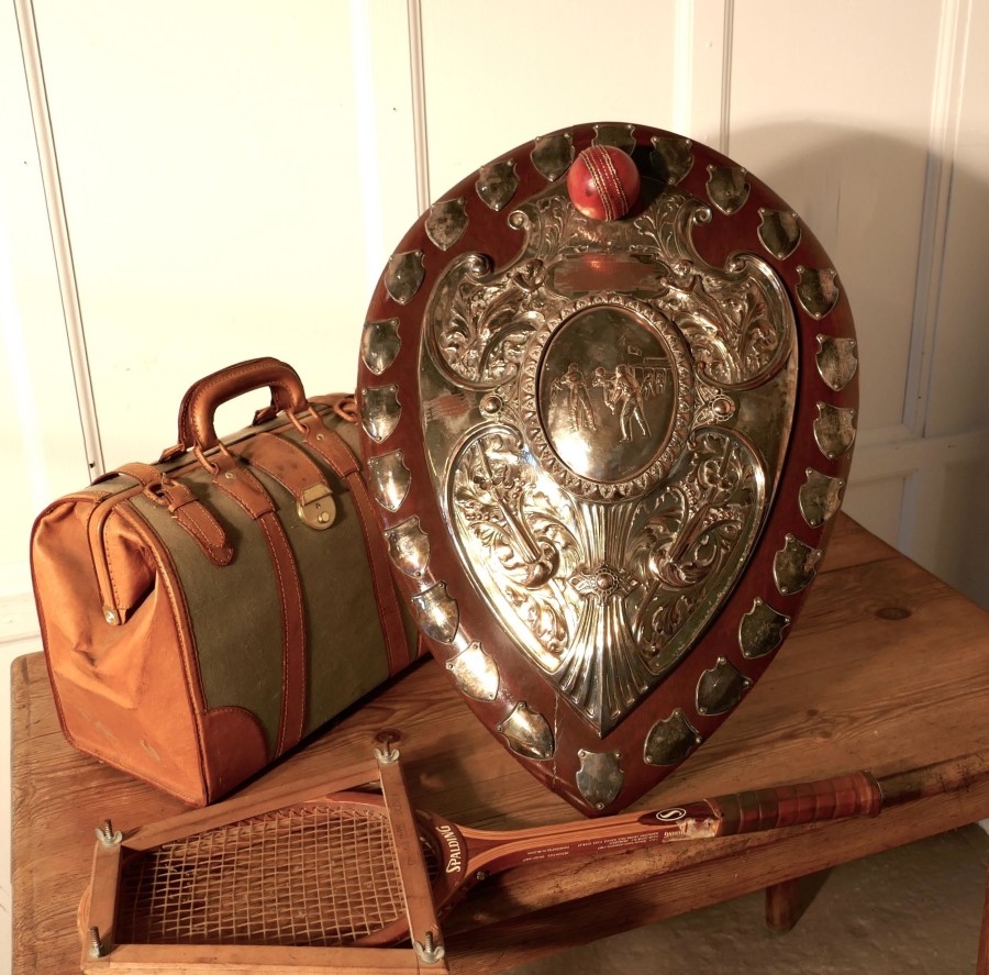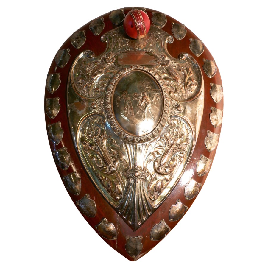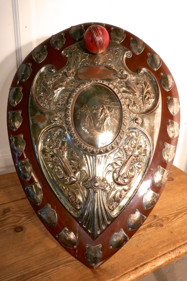 1901 Art Nouveau Sheffield Plate Cricket Trophy Shield, by Walker Hall and Sons This is a fantastic piece, a work of art, the Oak shield has an embossed Sheffield Silver plate, in the centre of this a scene from a cricket match and around this Art Nouveau stylised Angels and other leaves etc. and was made by Walker Hall and Sons At the top of the cartouche there is a red leather cricket ball and around the edges engraved shields of the winners of the cup from 1901 onwards This is a truly beautiful piece, the shield has a stand at the back, it is in good sound condition though some of the plate has been worn away by an eager polisher 28″ high, 20″ wide and 4″ deep TKW100 Manufacture Date : 1901 Materials : Silver-plate