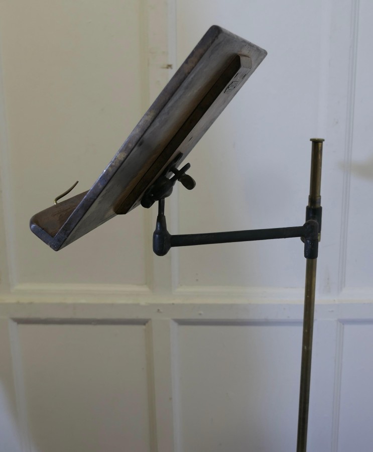 1930s Harrods Reading or Music Stand A very attractive piece, the stand has a heavy iron base with a brass upright column which carries an articulated adjustable arm supporting a tilting book rest with page clasps This handsome Music or Reading Stand would also be a useful piece to hold notes or a menu holder in a Bistro Bar The stand is 58” high maximum (adjustable) and 13” across at floor level TFB255 Manufacture Date : 1930 Materials : Iron