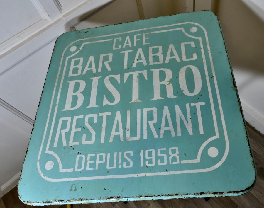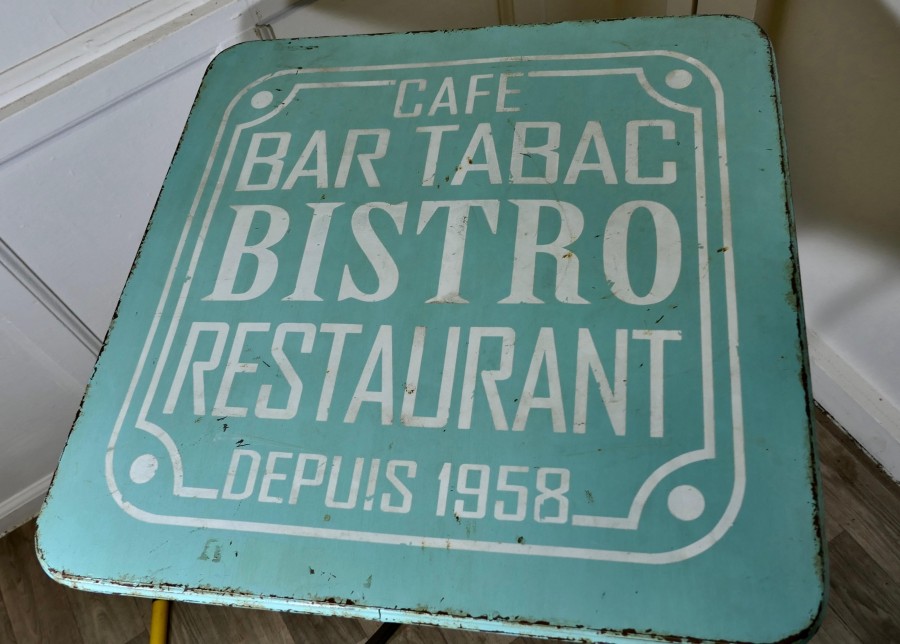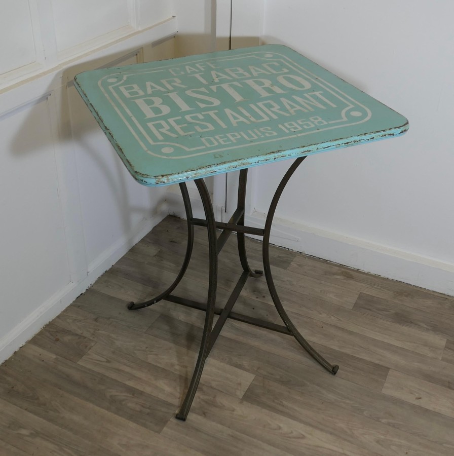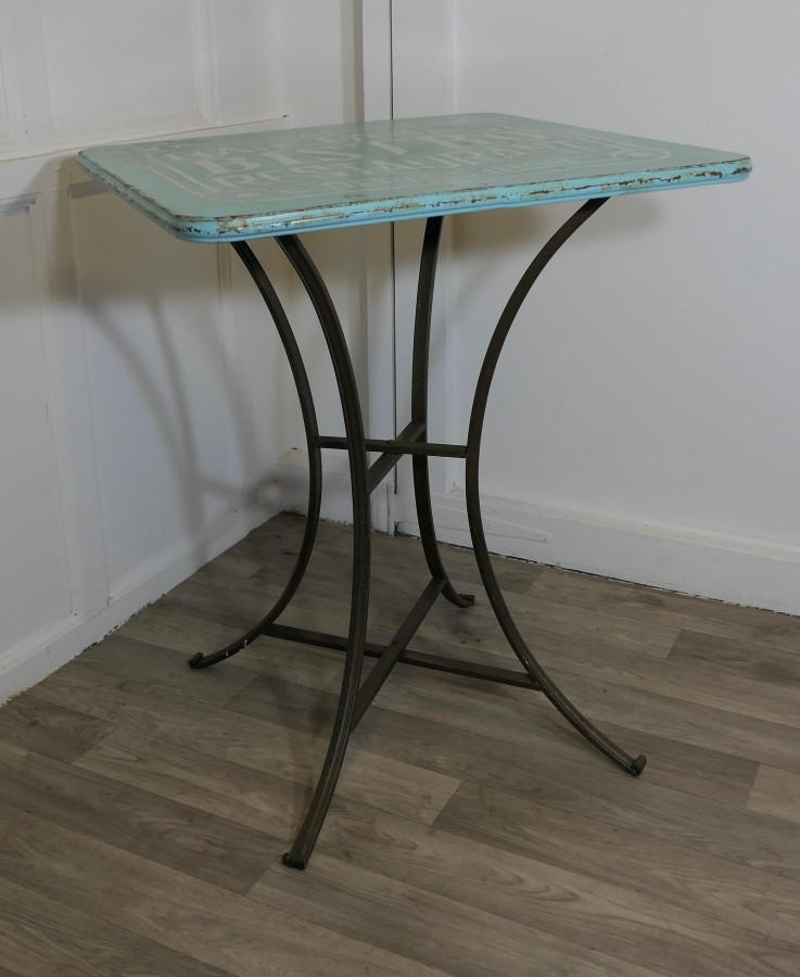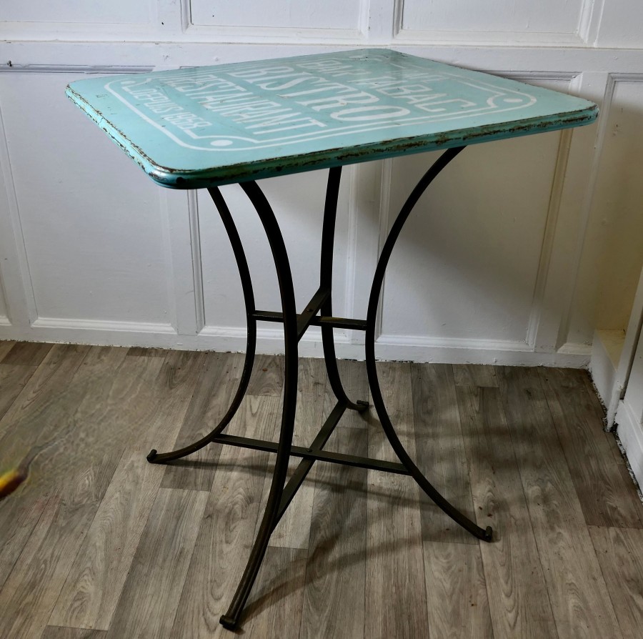 1950s French Enamel Bistro Table French Bistro Table a great fun piece would work well in the Garden, the table has iron legs and it is in good useable condition The table is 30” high and 24” in diameter ZX152 Manufacture Date : 1950 Materials : Enamel