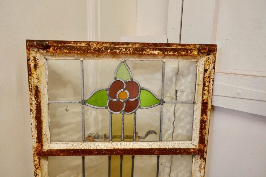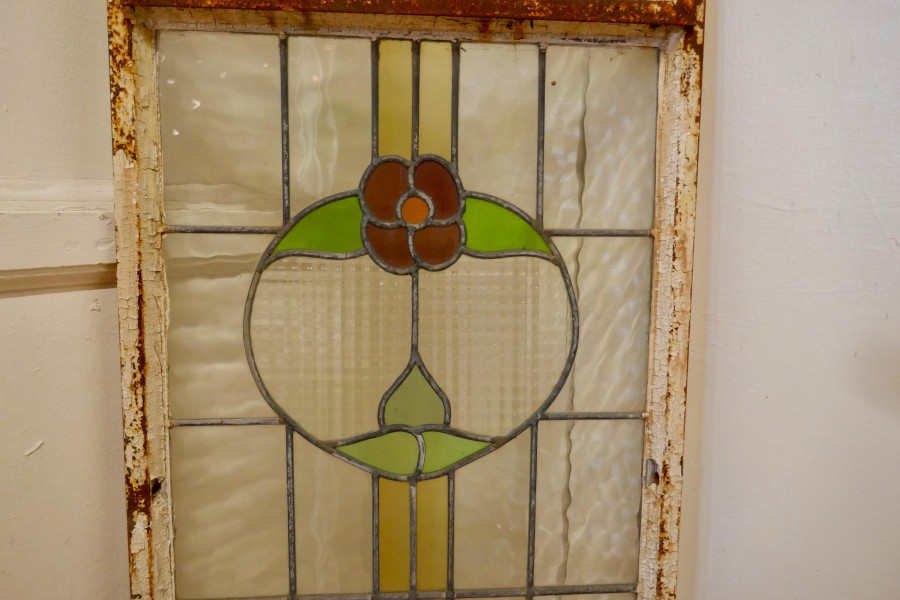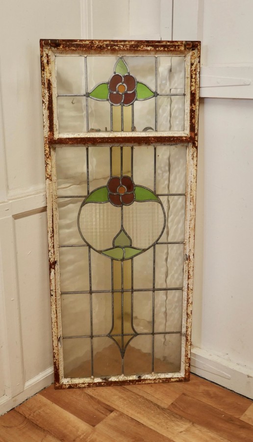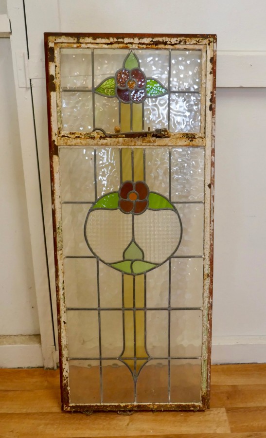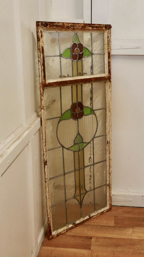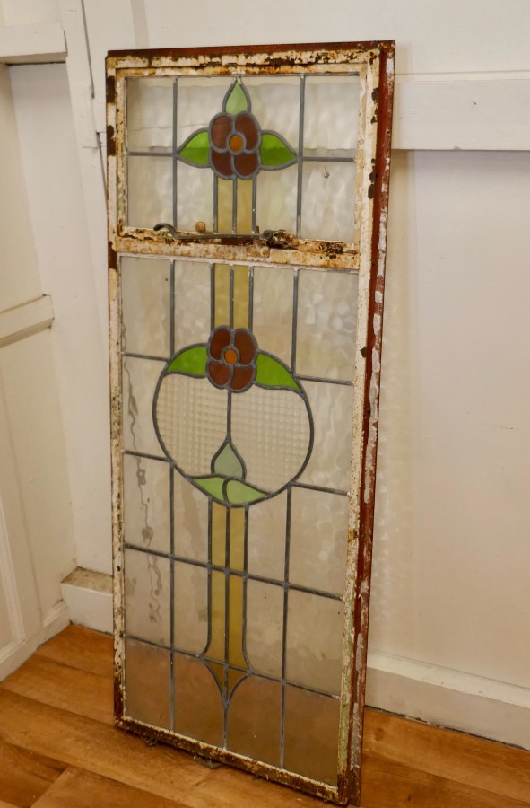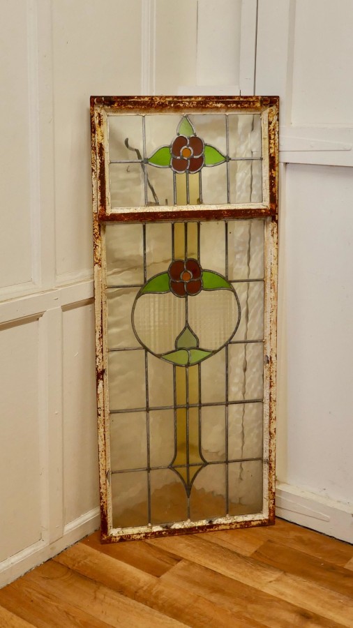 19th Century Arts and Crafts Stained Glass Window This is a pretty and colourful Arts and Crafts Cast iron window, with stylised Flowers in stained glass, The window is long with the top section openable, the glass is in good condition the iron is rusty The Window is 20” wide, 48” high and 2” thick AC159. Manufacture Date : 1900 Materials : Stained-glass