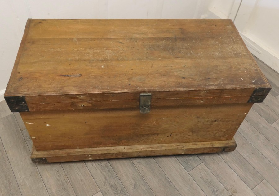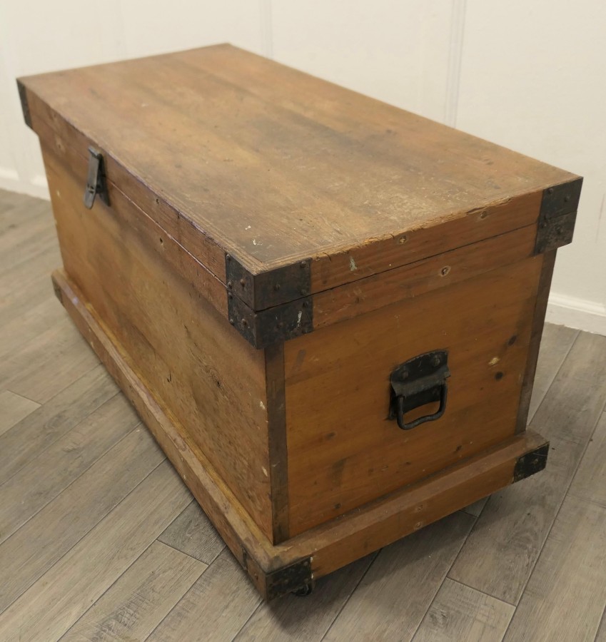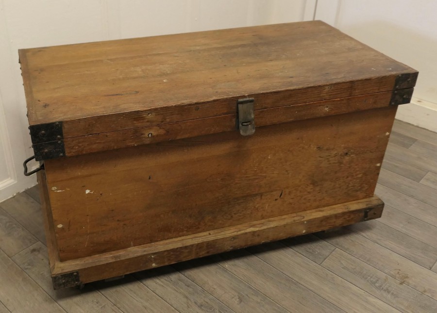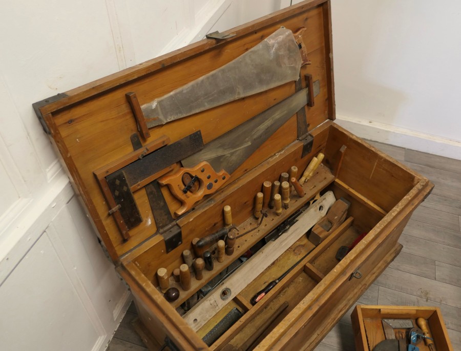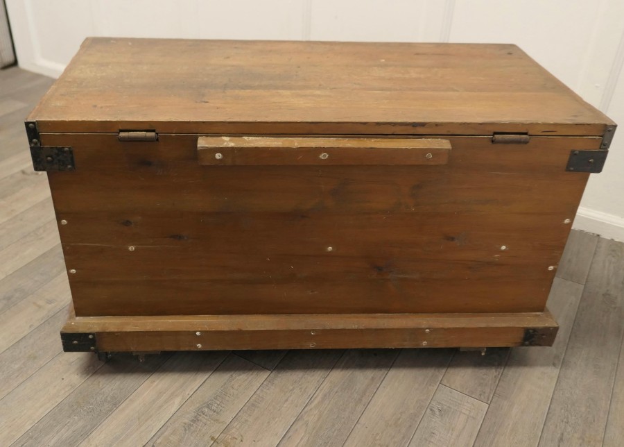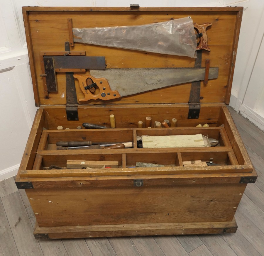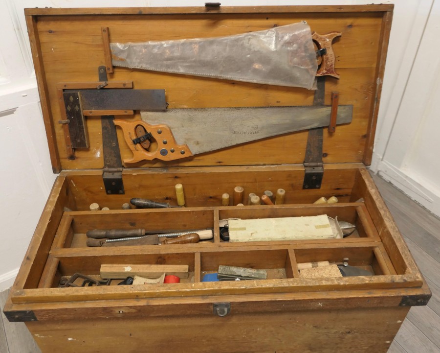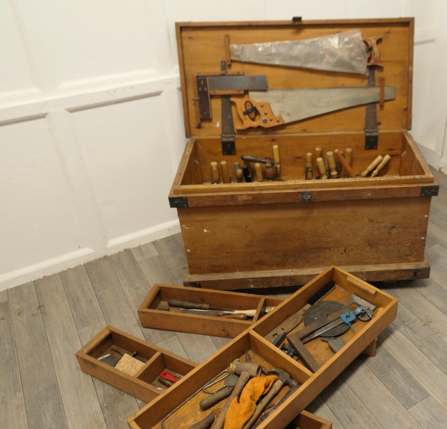 19th Century Carpenters Pine Tool Chest and Tools The chest is in pine with metal banding, it is set on wheels and has layers of trays We have left the contents of the chest with its tools too many to mention, there is a large mix, it has 2 half trays one larger tray as well as the bottom layer and drilled holder for the chisels The chest is Heavy and Sound, it is 21” high, 38” long and 19” deep JK241 Manufacture Date : 1900 Materials : Pine