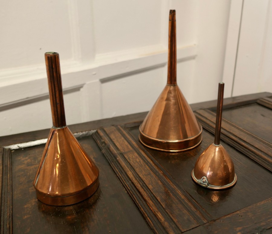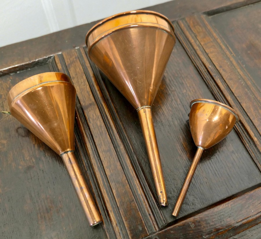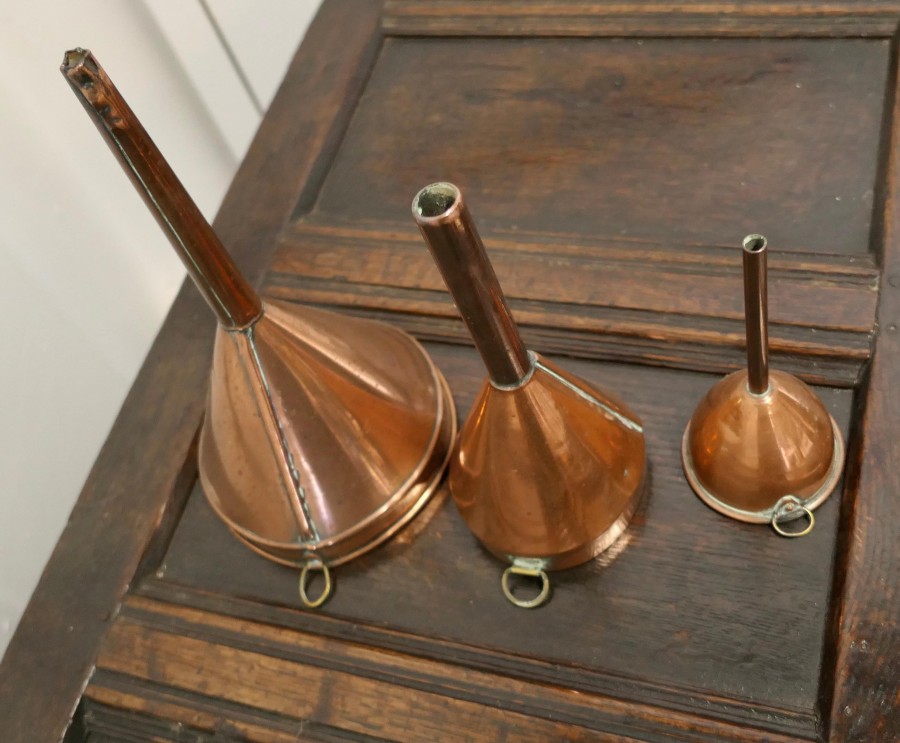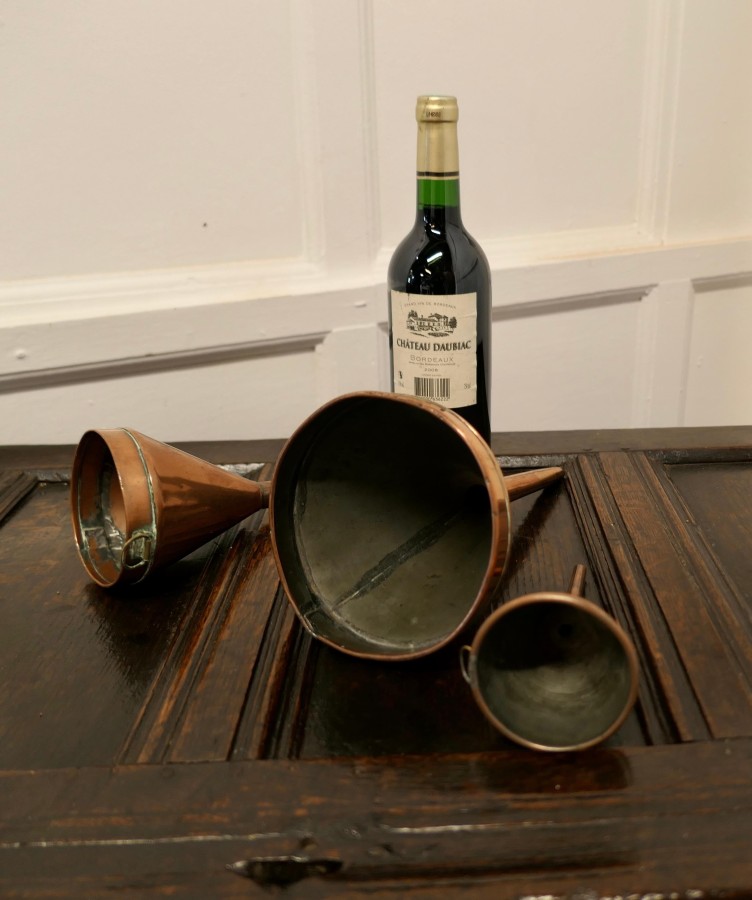 19th century copper Ale and wine funnel set A Good Trio, the Ale and Wine Funnels are all in good used condition for their age, a handsome, decorative and useful set all with rings to hang them from The largest funnel is 12”x 6” diameter GF124. Manufacture Date : 1880 Materials : Copper