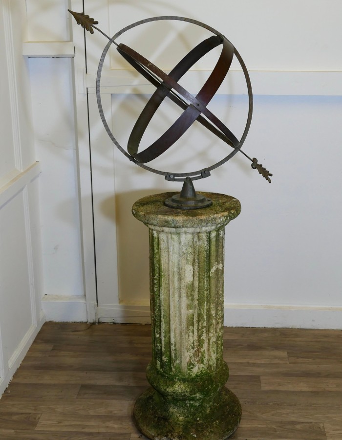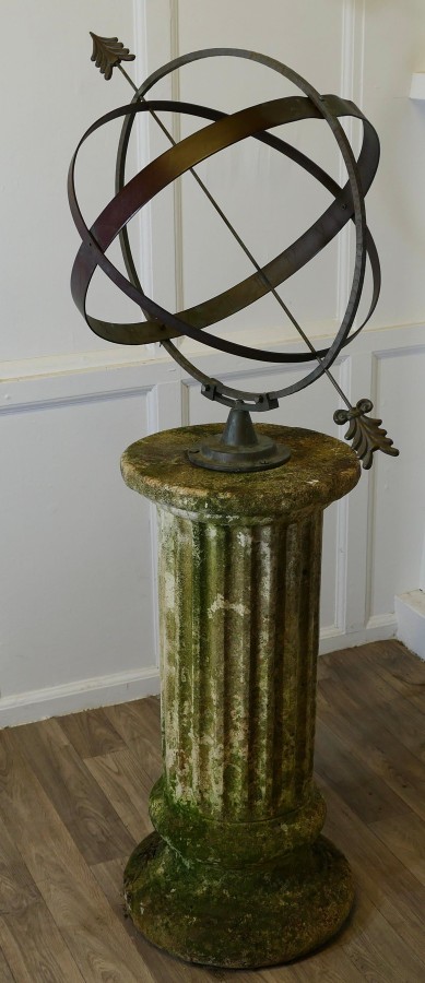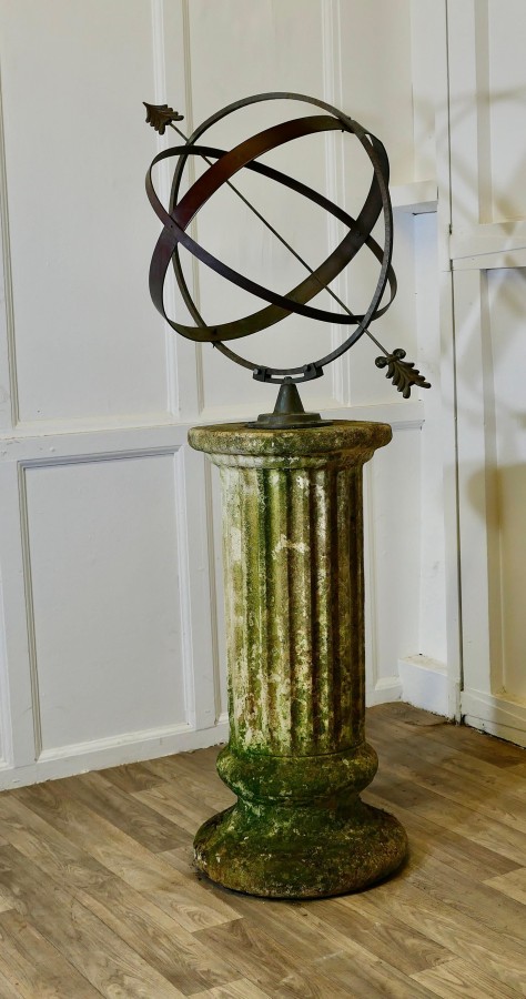 19th Century Copper Armillary Sphere on a Stone Pedestal 19th century copper armillary sphere set on a weathered 14” fluted stone pedestal which has acquired excellent patina from years of outdoor exposure. The Armillary is also in aged patination, the numerals in the inside roof the armillary can be clearly seen The overall height is 54” and the Diameter is 24” TNG259 Manufacture Date : 19th century Materials : Cast-stone