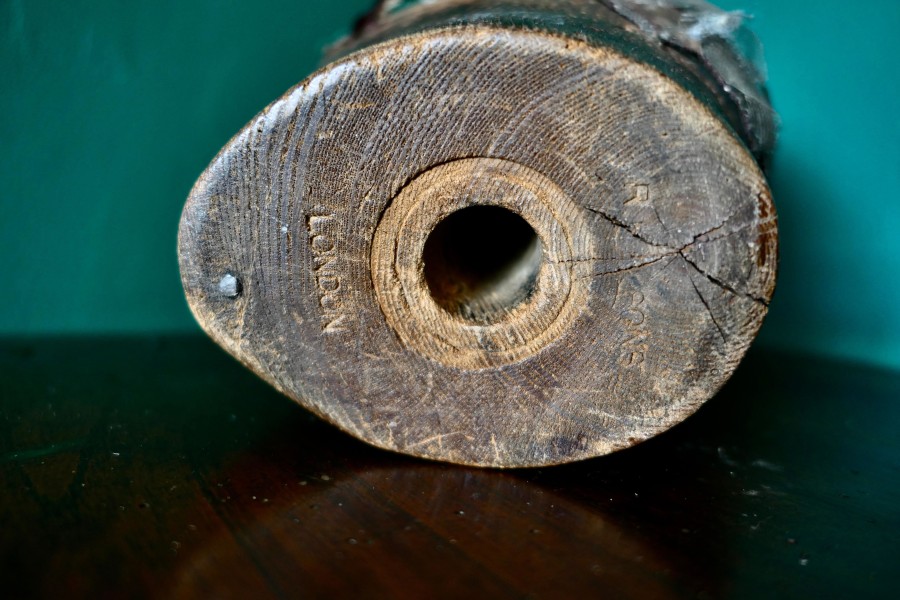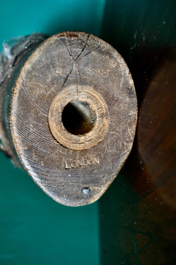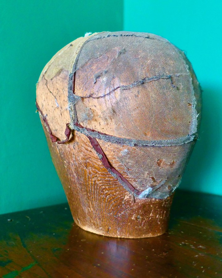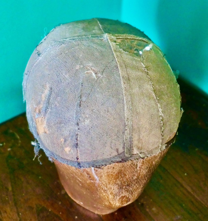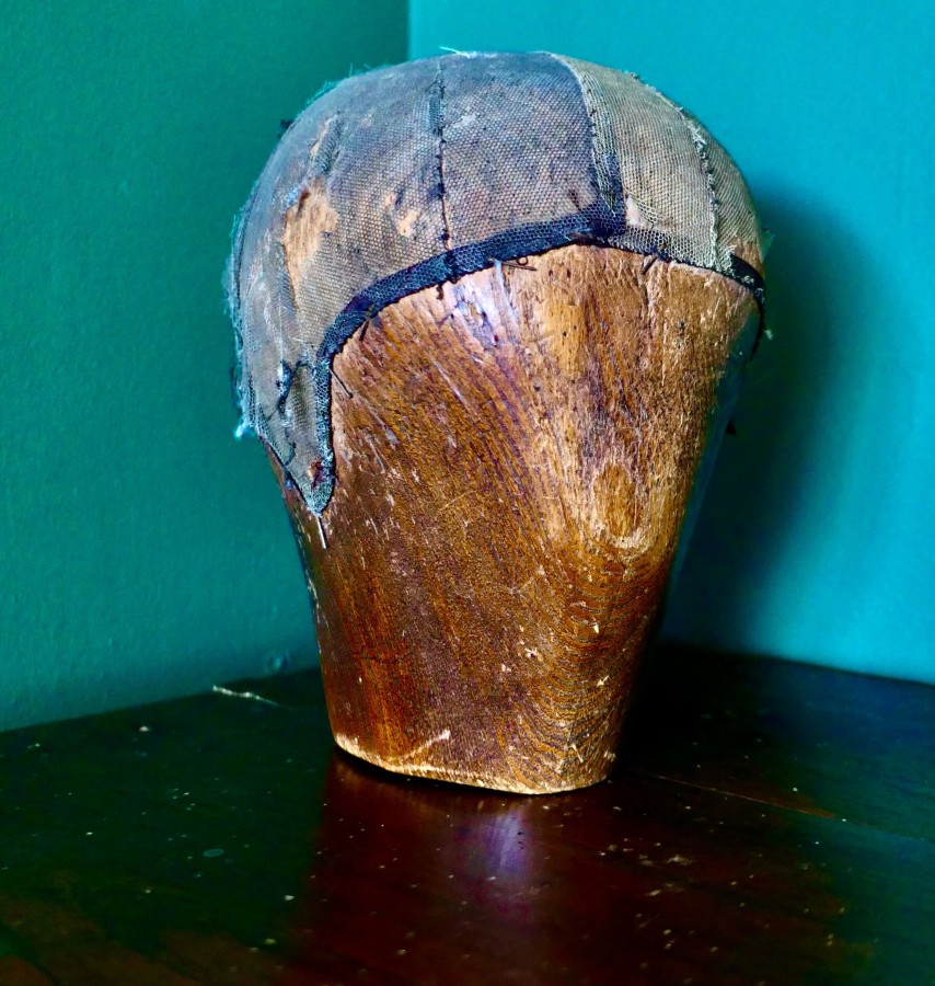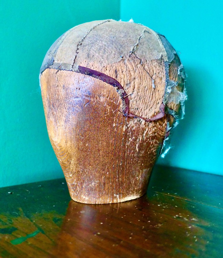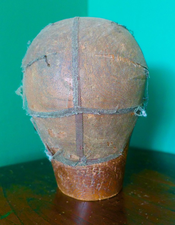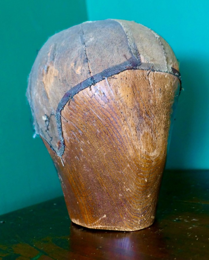 A 19th Century Elm Barrister’s wig stand or milliners hat block shop display This is a beautifully shaped solid elm head, and would display a wig as well as a beautiful designer Hat The stand is in good antique condition though the net covering has seen better days The block is solid and measures 9” high, 8” long and it is 6” wide JK75. Manufacture Date : 1880 Materials : Elm