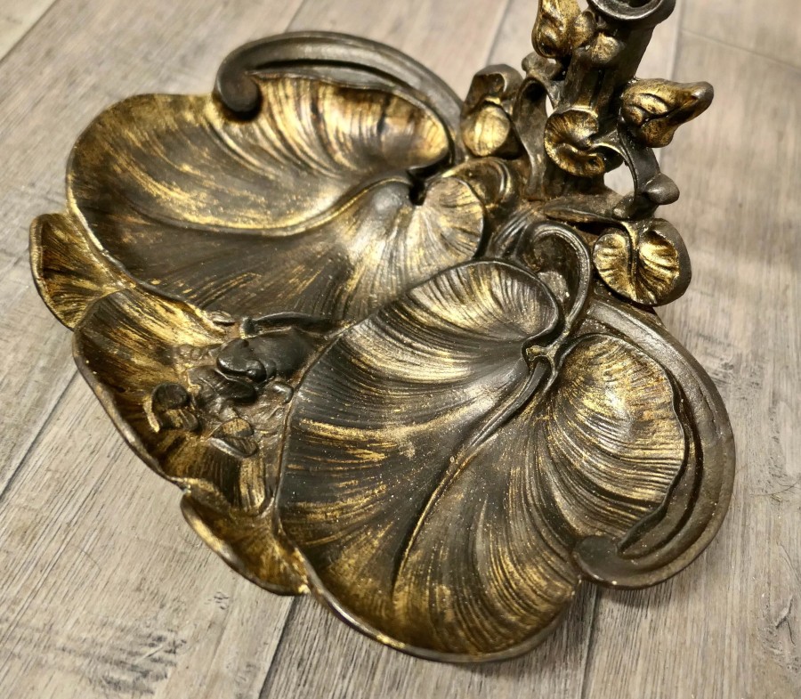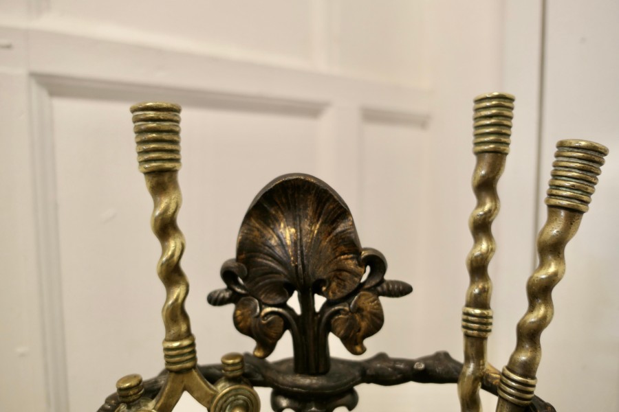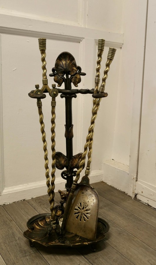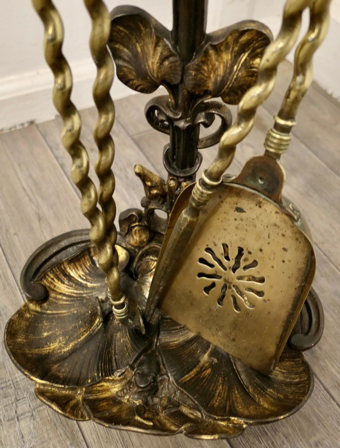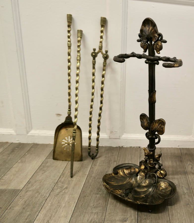 19th century fireside companion set, fireside tools with frogs. This is a long handled set on its own stand, shovel, tongs, and poker with wonderful twisted style to the handles, the base of the stand is in the form of a Lilly pad with a frog in the middle The stand 24” tall and 11” x 19” TJK247. Manufacture Date : 1900 Materials : Brass