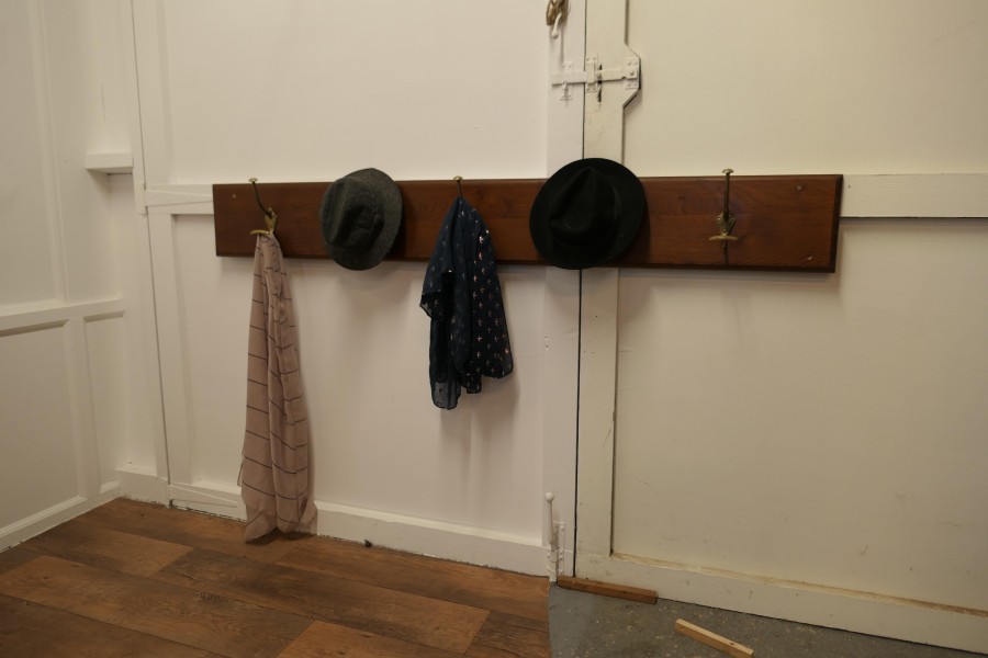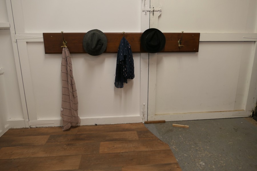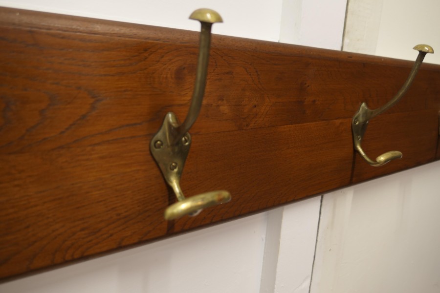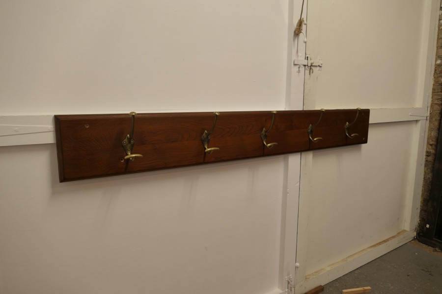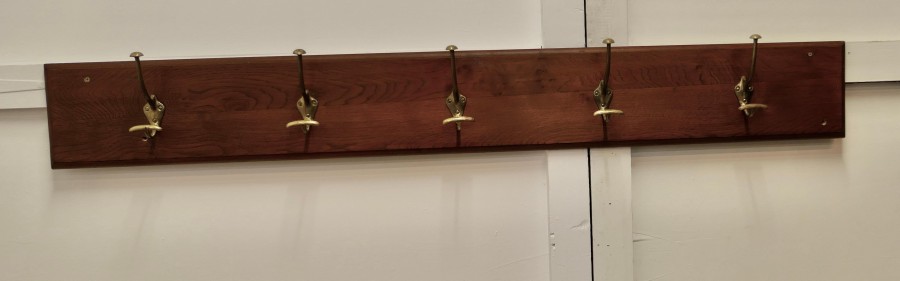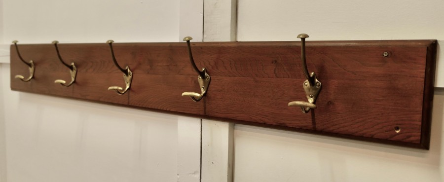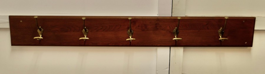 19th century French Long Oak 5 Double Peg Coat Rack Plain and Simple, a piece of solid oak with 5 large brass Coat pegs on a 72” frame The rail is 72” long and 9” high MS87. Manufacture Date : 1950 Materials : Oak