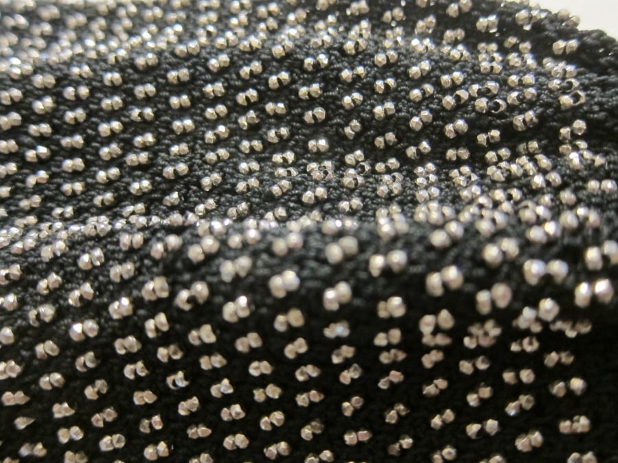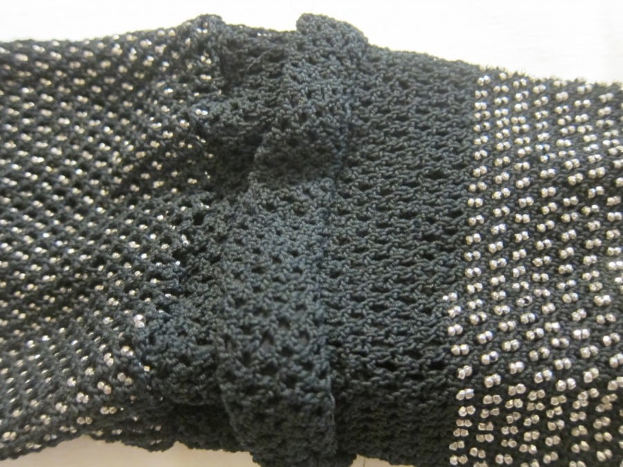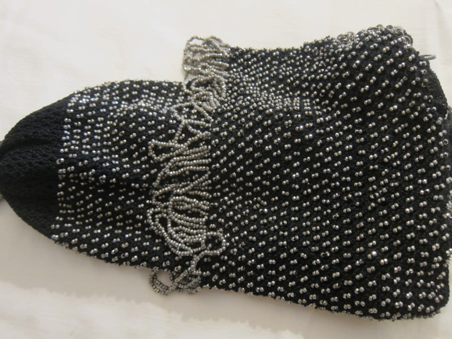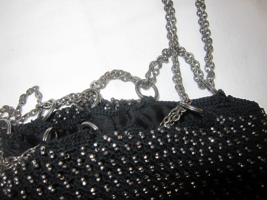 19th Century French steel bead reticule/purse. Hand stitched crochet,black cotton base with steel beads woven into the outside,the over lap edge has been finished with a bead fringe & at the base a steel bead tassel has been added. Lined in black fabric. At the top steel rings hold a steel carrying chain. No damage.