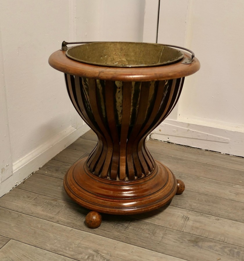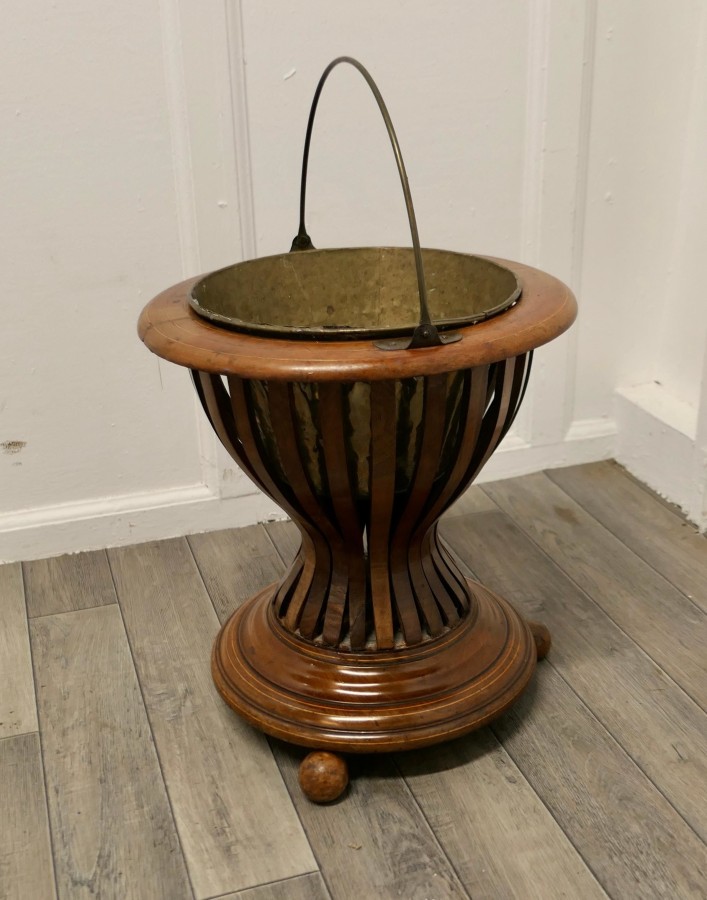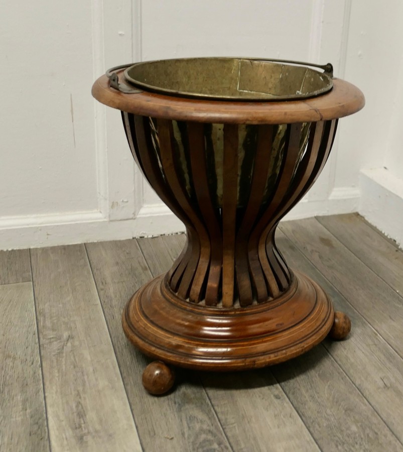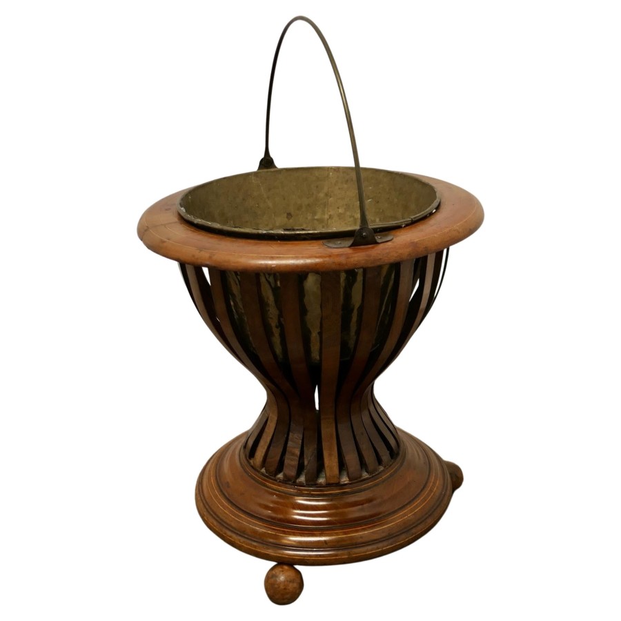 19th century Hourglass peat bucket planter A very attractive design, the Hourglass shape is made in wood strapping, and the original brass liner is present The planter sits on turned wooden feet and it has its own handle The planter is in good antique condition and the brass liner does have a few old repairs The Planter is 16” tall and 15” in diameter JK171. Manufacture Date : 1880 Materials : Walnut