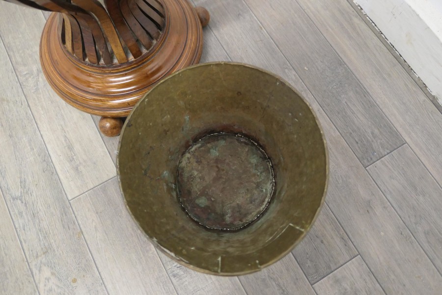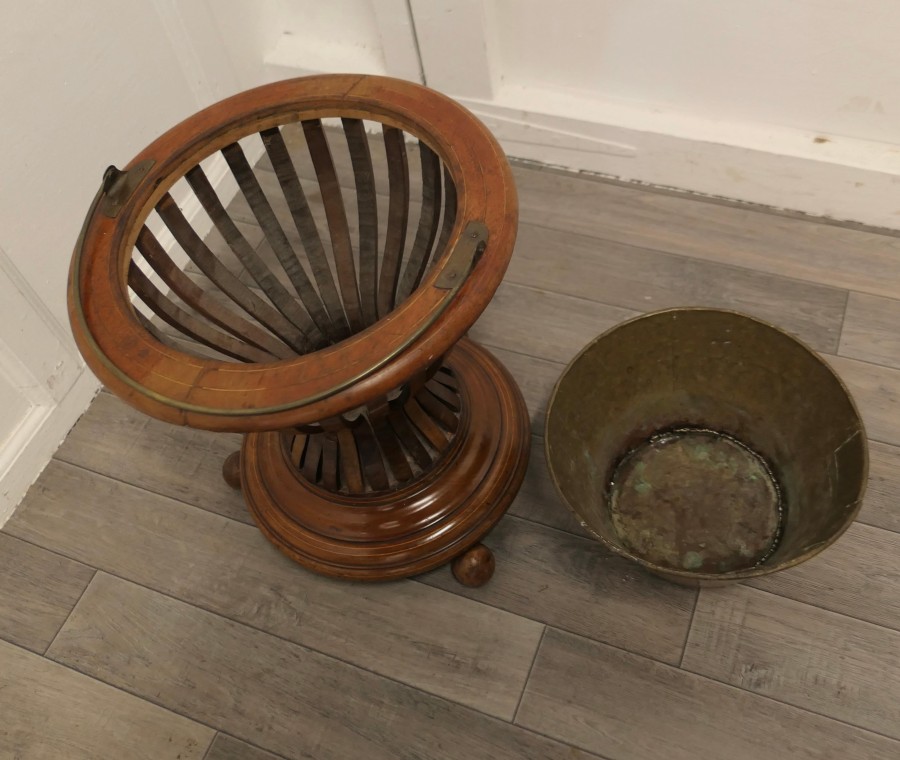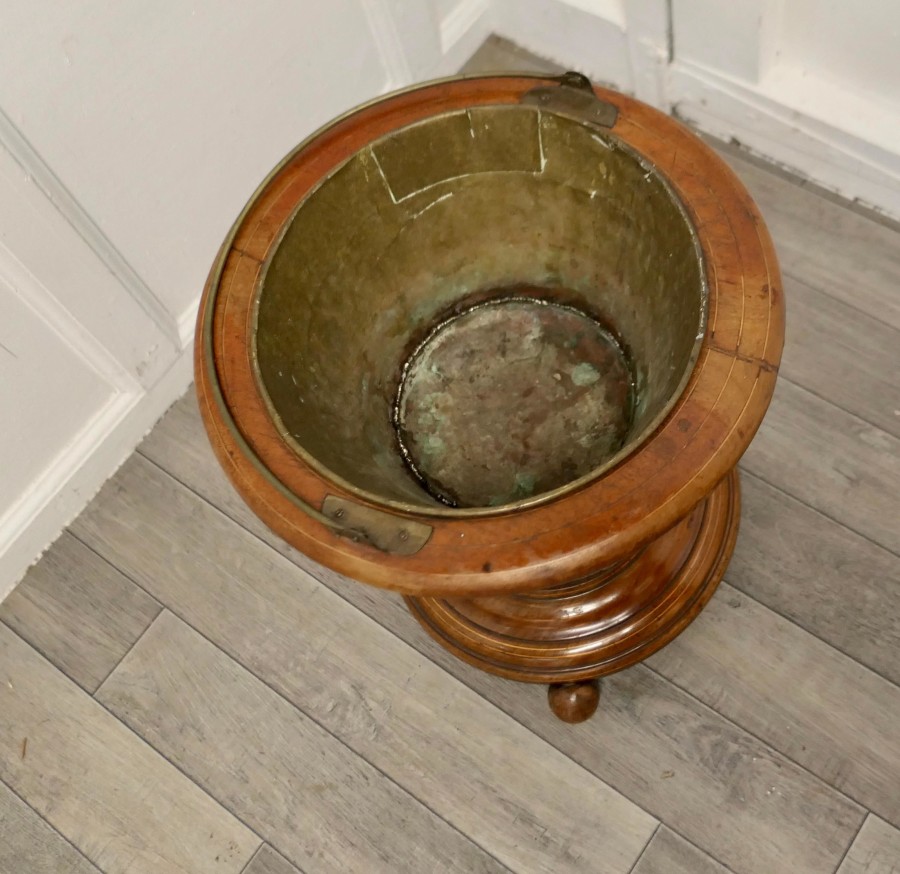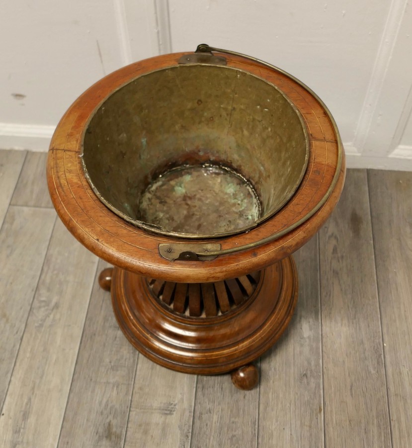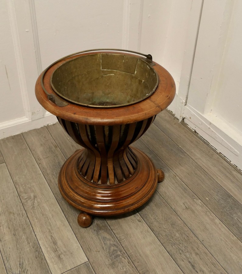19th century Hourglass peat bucket planter A very attractive design, the Hourglass shape is made in wood strapping, and the original brass liner is present The planter sits on turned wooden feet and it has its own handle The planter is in good antique condition and the brass liner does have a few old repairs The Planter is 16” tall and 15” in diameter JK171. Manufacture Date : 1880 Materials : Walnut