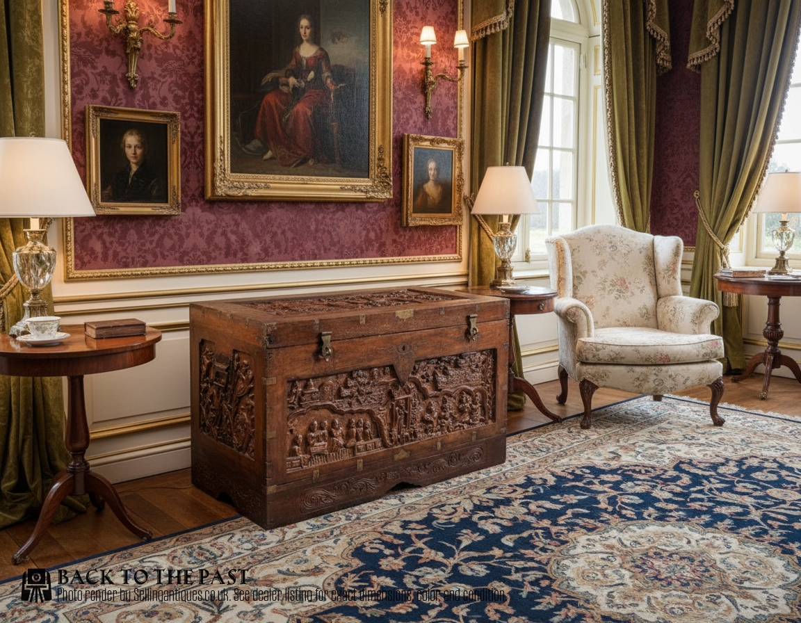 A remarkable 19th-century Indian teak storage chest, exquisitely carved and steeped in cultural resonance. The front, sides, and lid are adorned with intricate narrative scenes—figures in traditional attire appear in ceremonial and contemplative poses, framed by temple architecture, floral motifs, and stylised animals. A pair of symmetrically rendered peacocks adds a touch of regal elegance, while delicate brass string inlay graces the front panel with subtle refinement. Inside, the chest reveals two candle boxes, one of which conceals a hidden compartment—perfect for discreetly storing valuables or documents. The teak boasts a warm, timeworn patina, its surface enriched by decades of careful use. Original iron hardware, including a robust lock mechanism, remains intact, underscoring the chest’s authenticity and enduring craftsmanship. A rare and evocative piece that beautifully bridges artistry, utility, and cultural heritage.