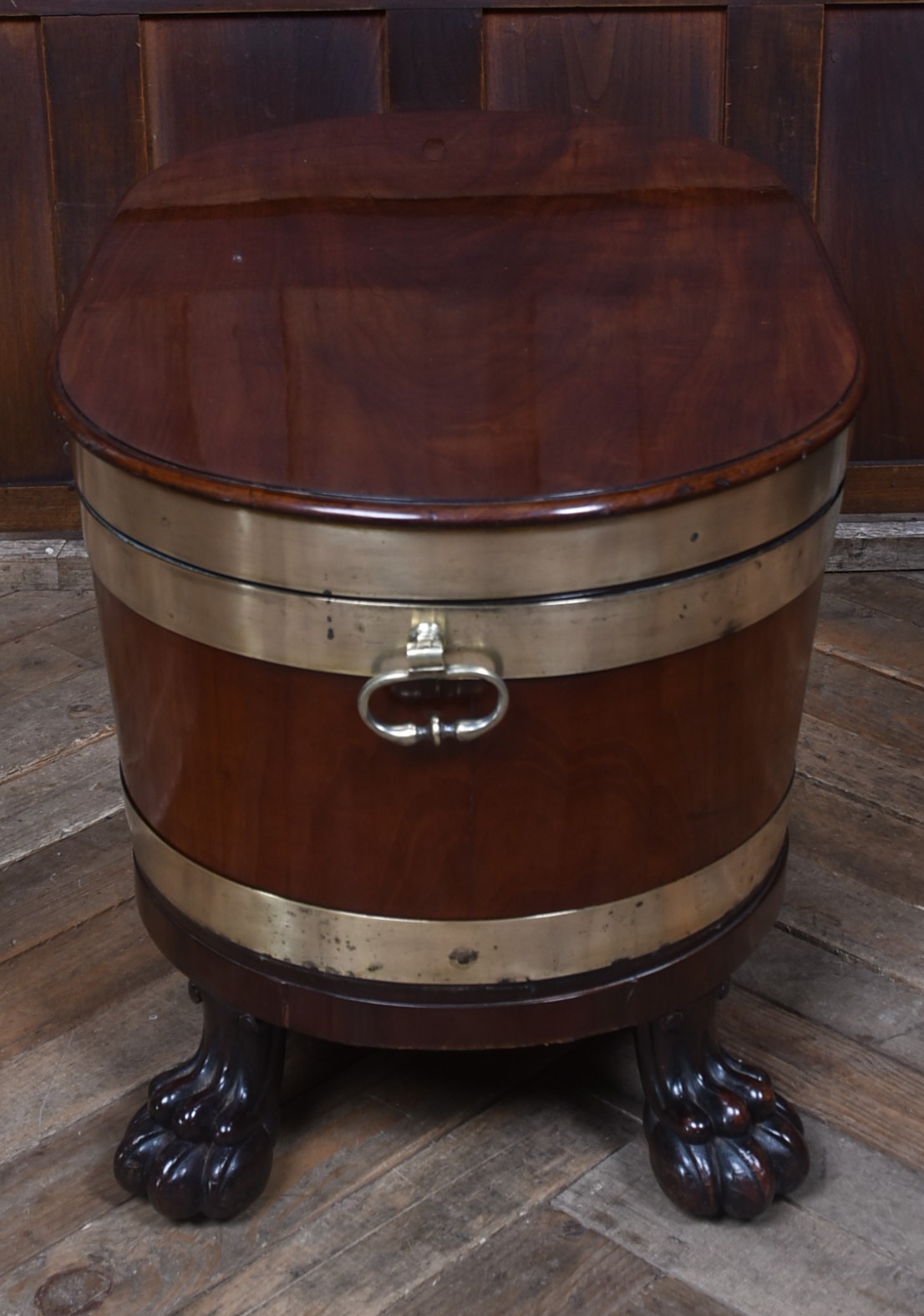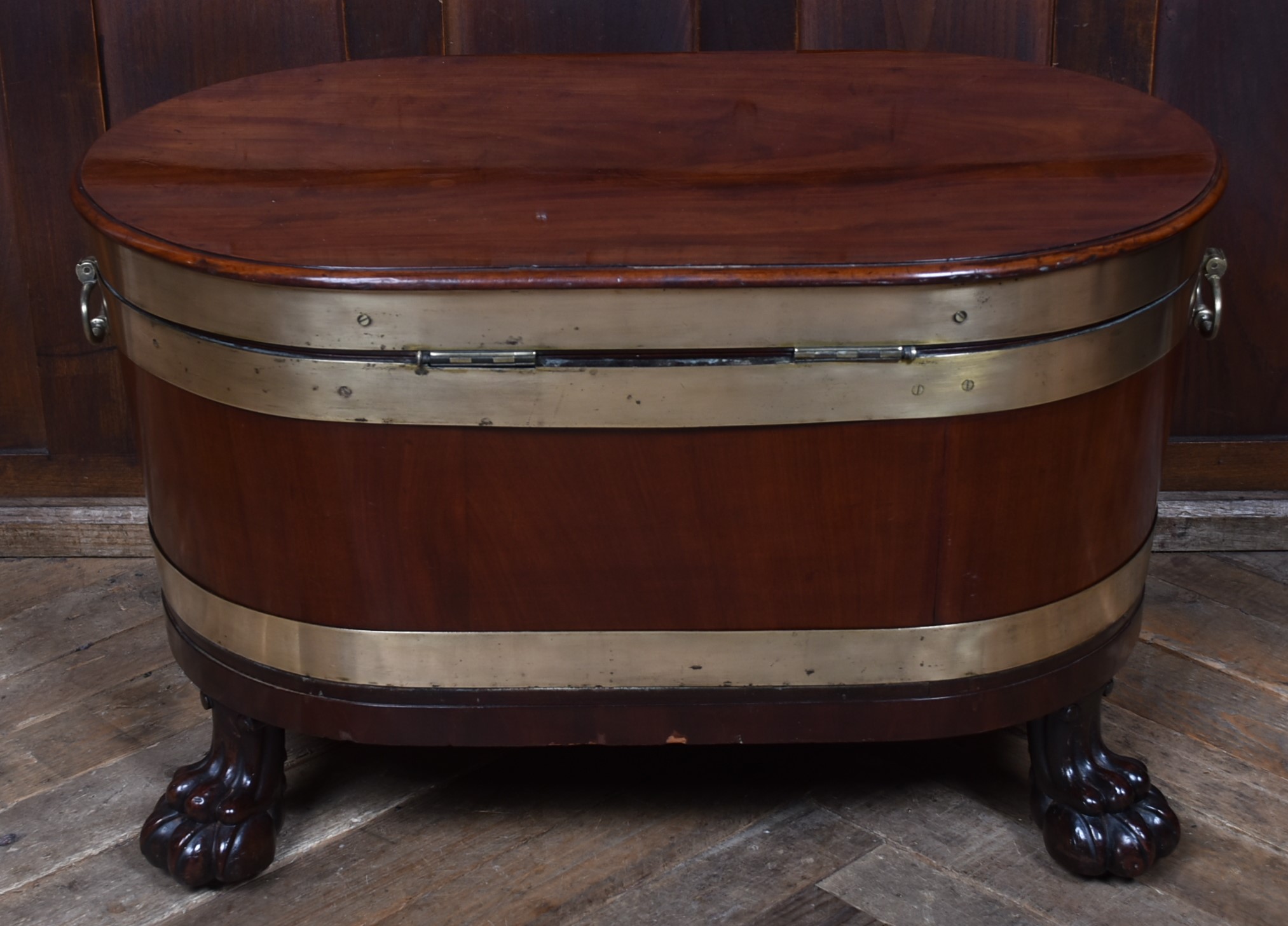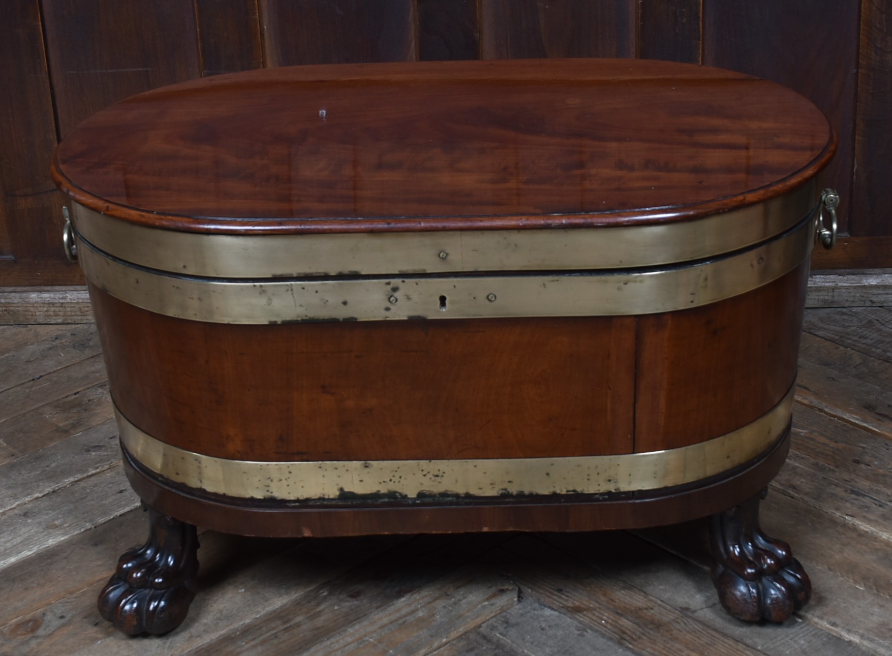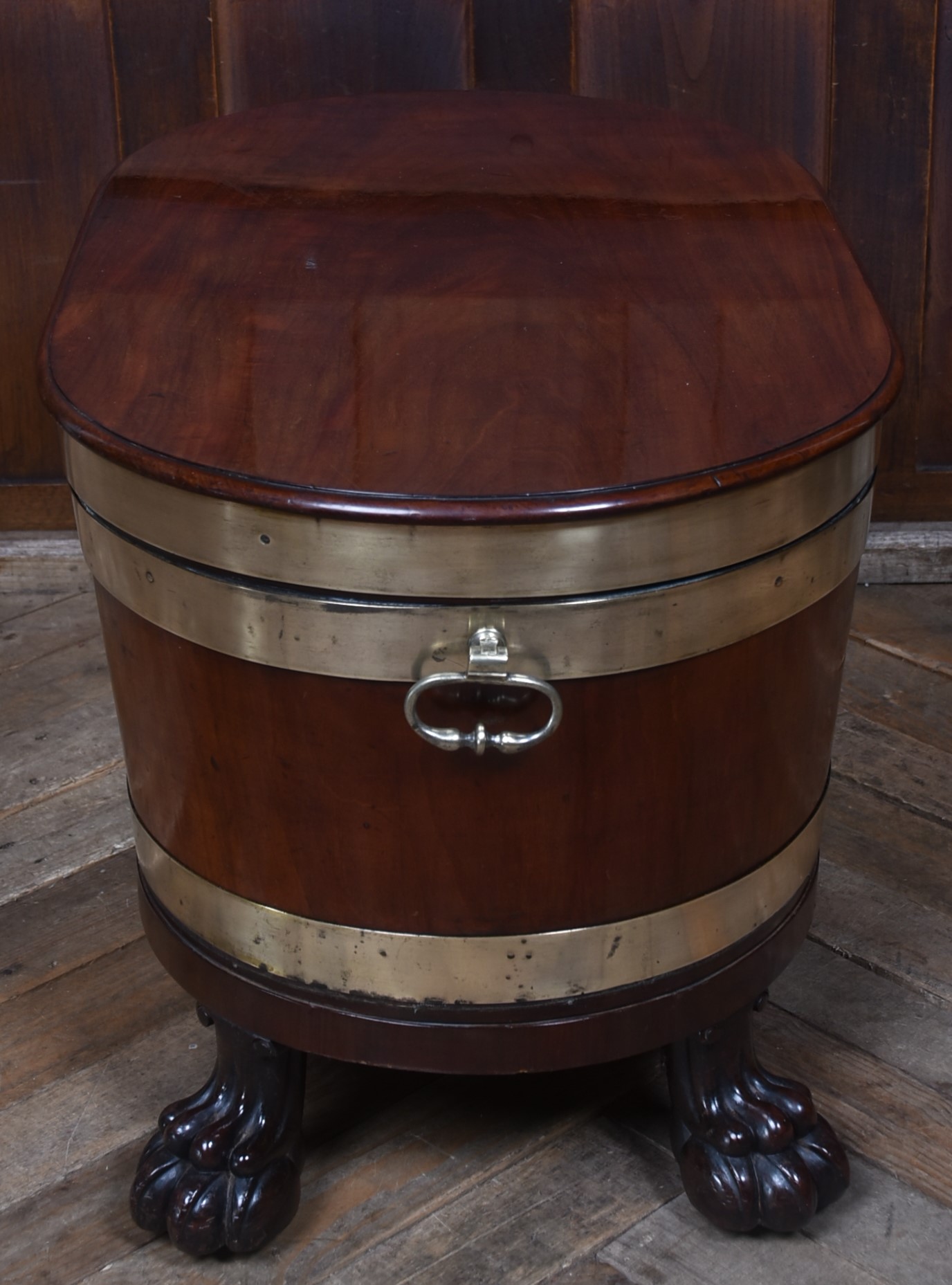 A handsome 19th‑century mahogany cellarette, oval in shape and constructed from well‑figured mahogany with original brass banding and side carrying handles. The hinged lid lifts to a lined interior suitable for bottles or ice, while the whole stands on crisply carved claw feet. A well‑preserved and highly decorative piece of Georgian/Victorian dining furniture. A charming addition to any dining room or interior.