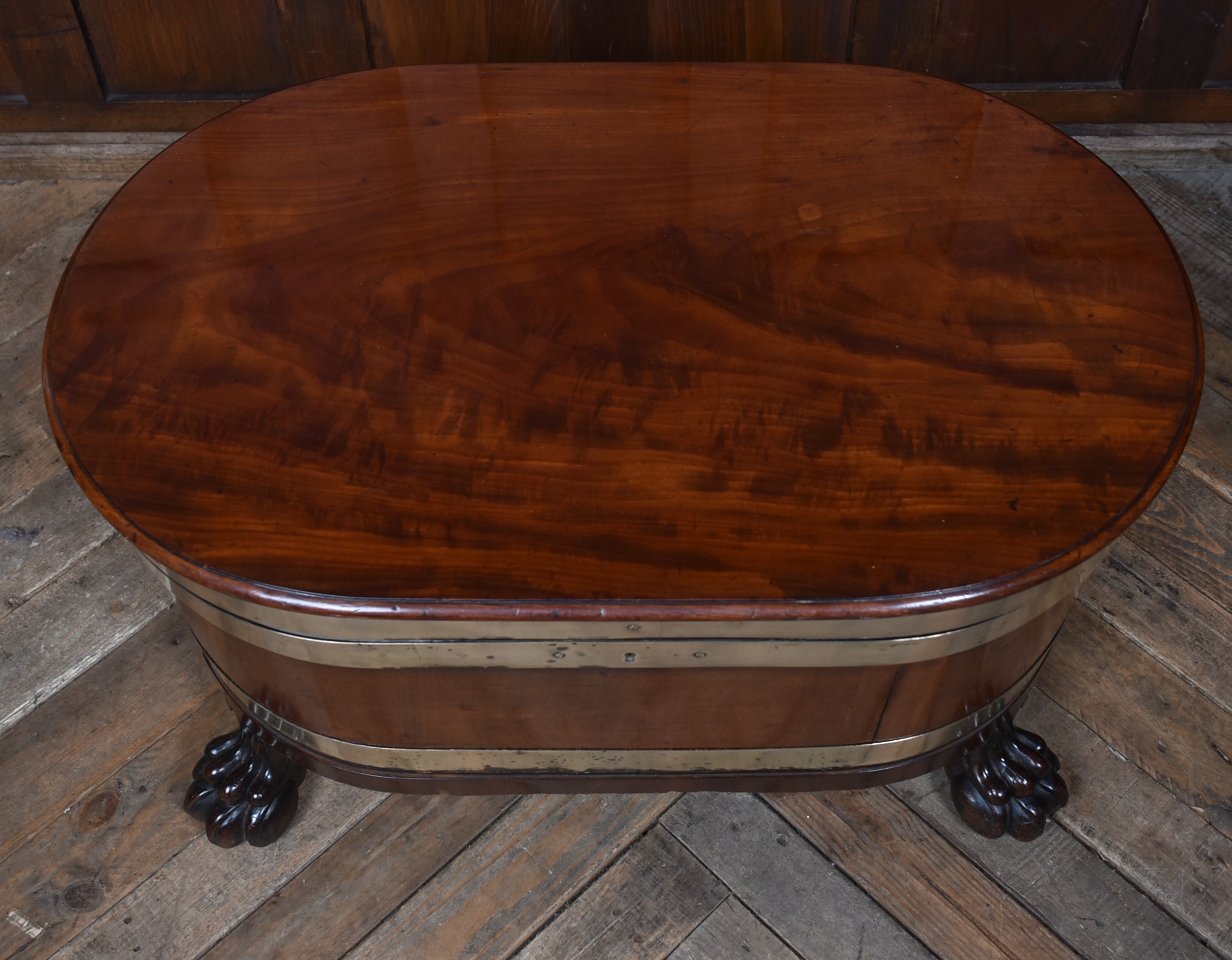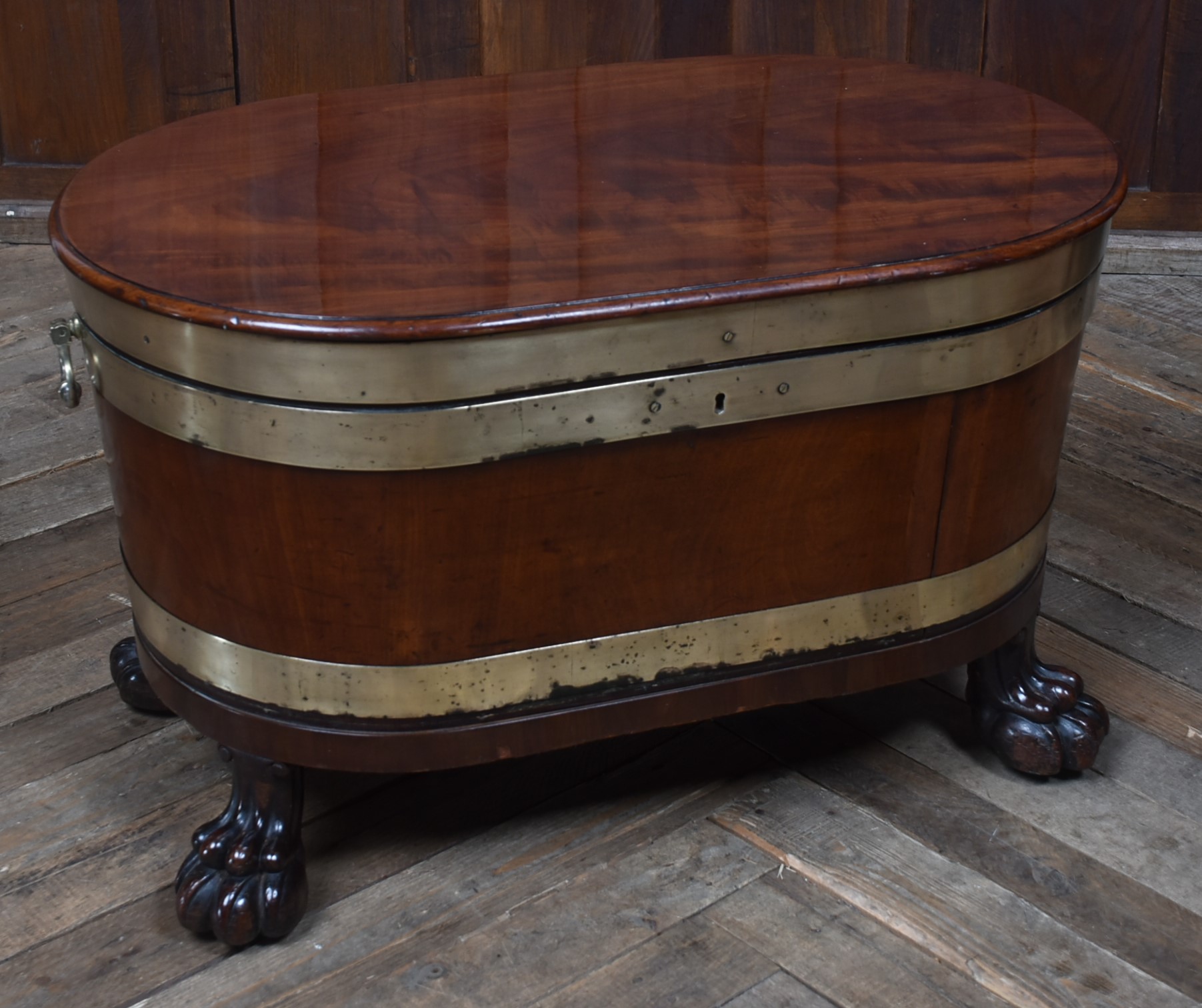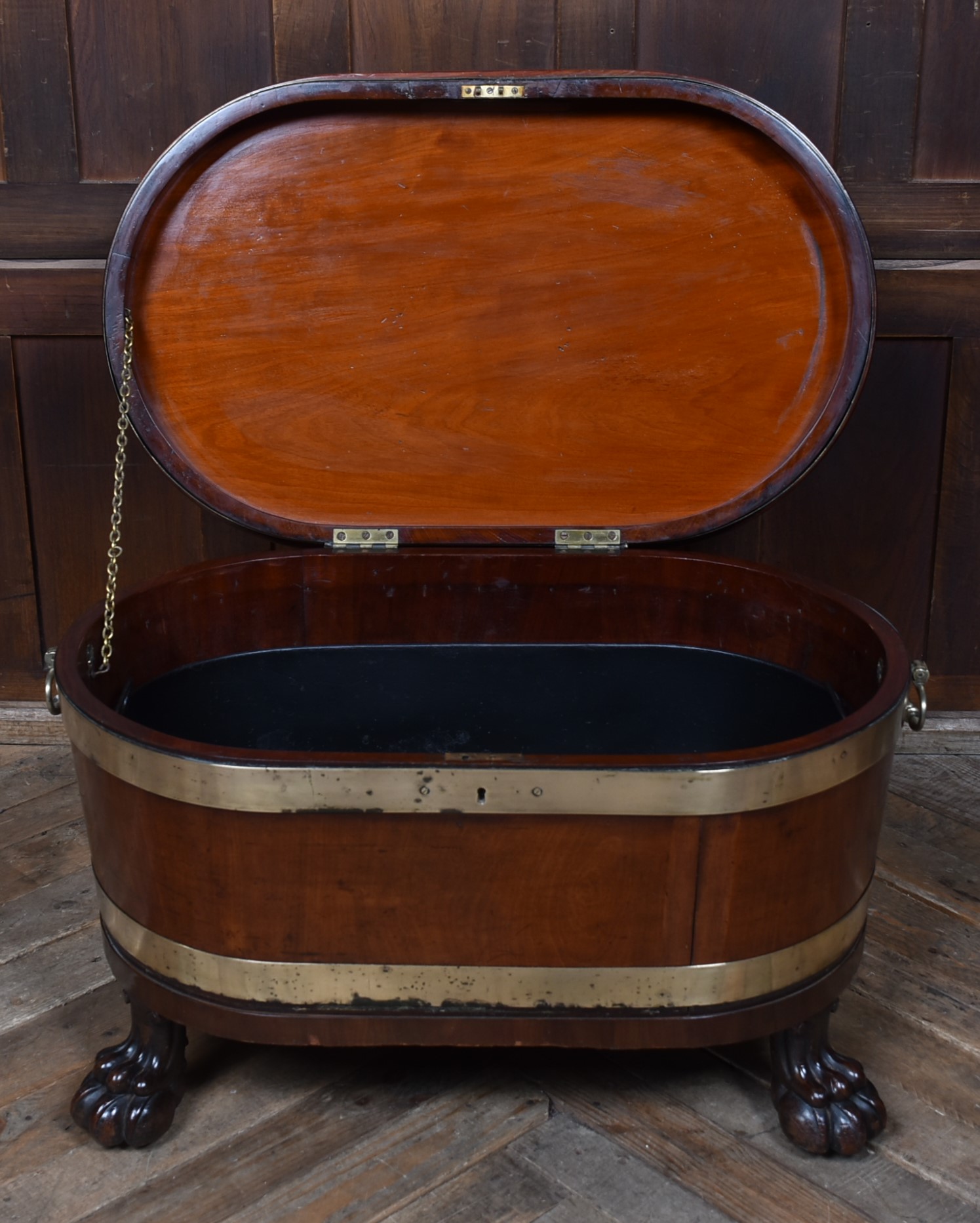 A handsome 19th‑century mahogany cellarette, oval in shape and constructed from well‑figured mahogany with original brass banding and side carrying handles. The hinged lid lifts to a lined interior suitable for bottles or ice, while the whole stands on crisply carved claw feet. A well‑preserved and highly decorative piece of Georgian/Victorian dining furniture. A charming addition to any dining room or interior.