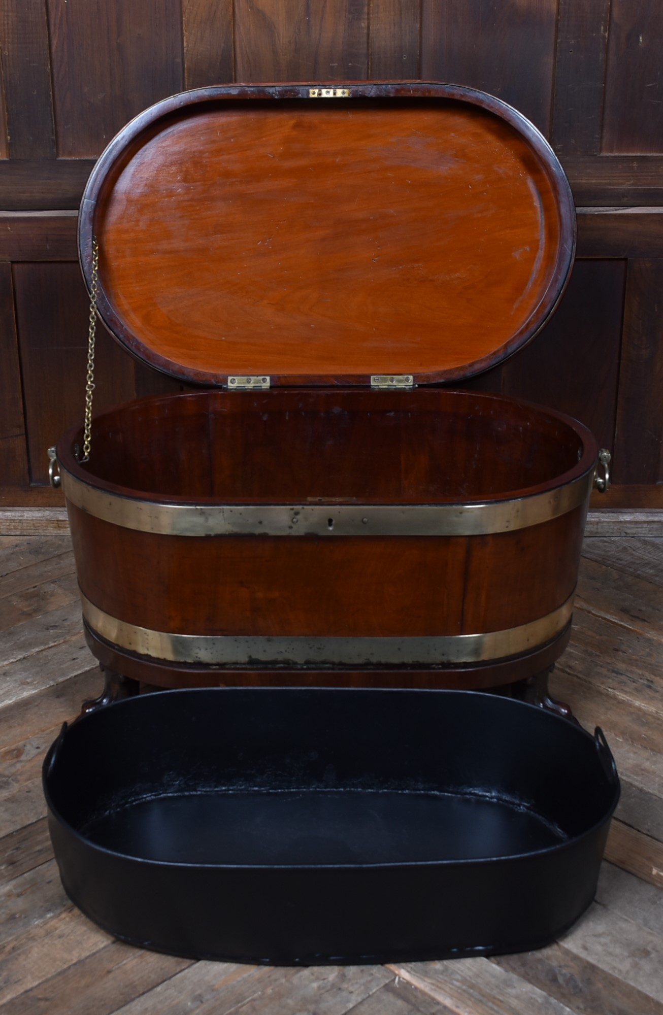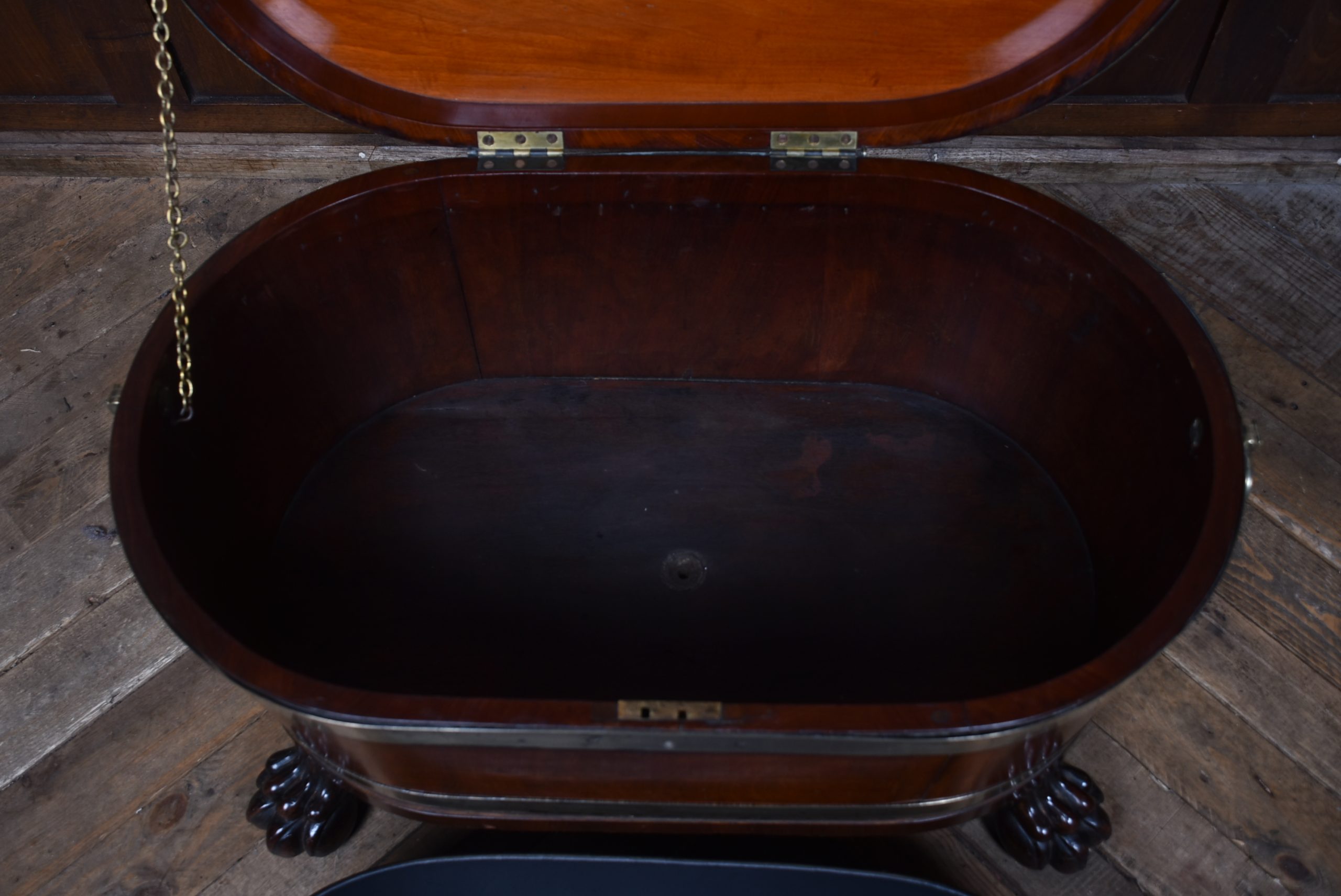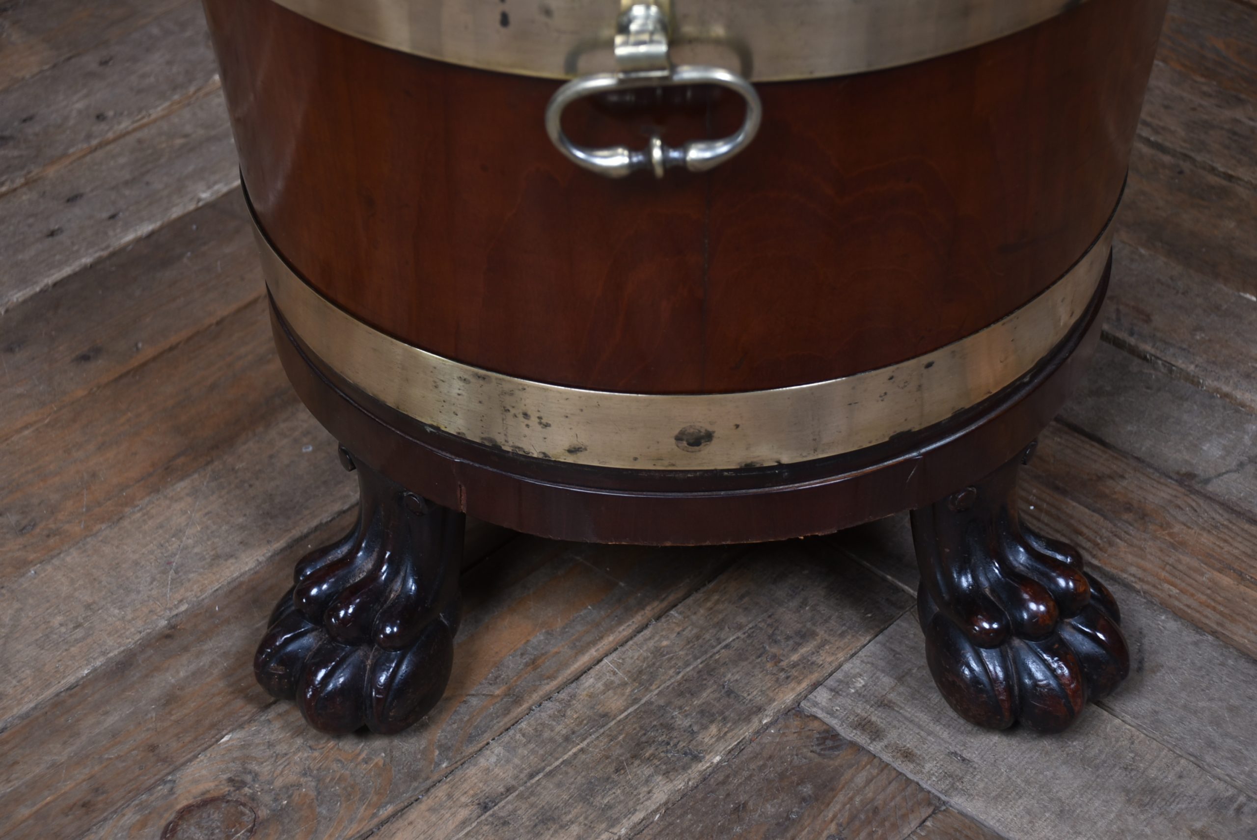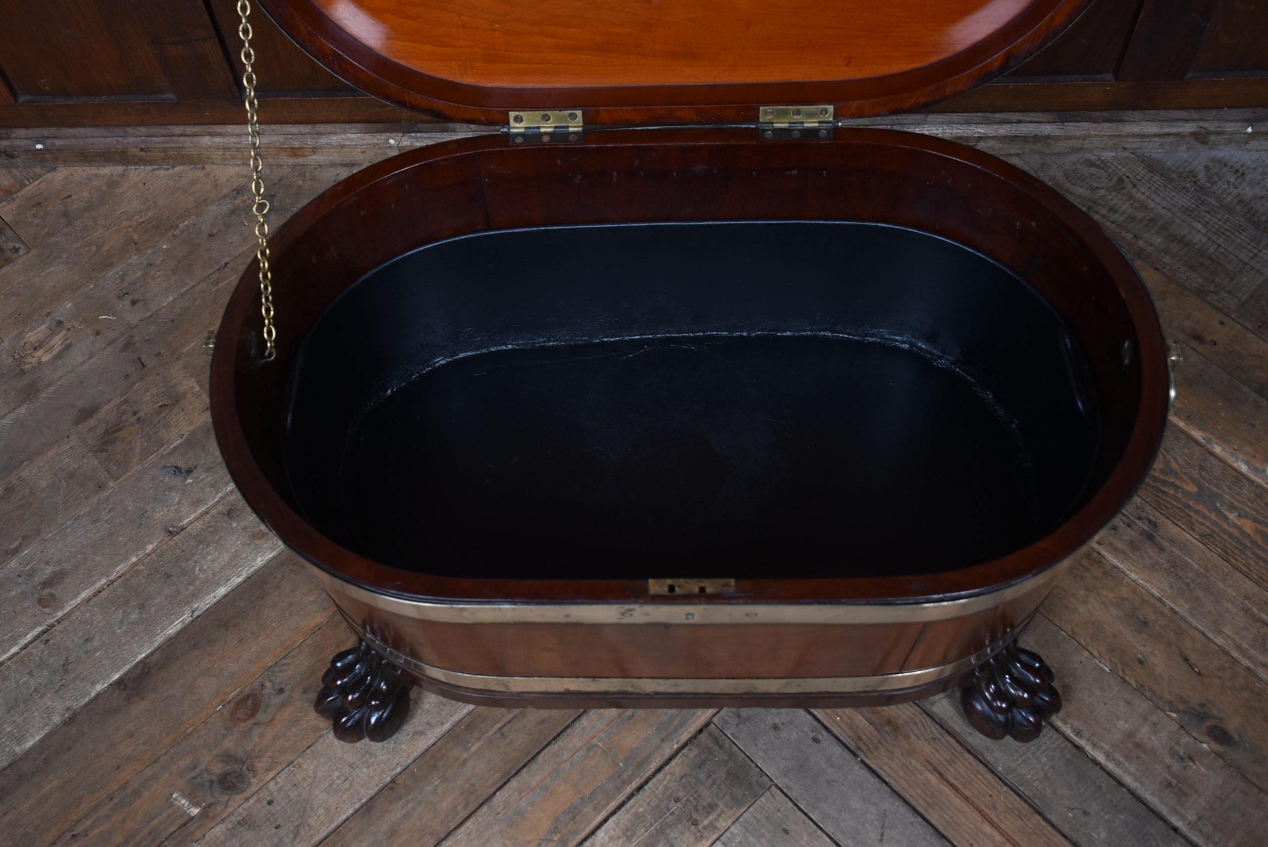 A handsome 19th‑century mahogany cellarette, oval in shape and constructed from well‑figured mahogany with original brass banding and side carrying handles. The hinged lid lifts to a lined interior suitable for bottles or ice, while the whole stands on crisply carved claw feet. A well‑preserved and highly decorative piece of Georgian/Victorian dining furniture. A charming addition to any dining room or interior.