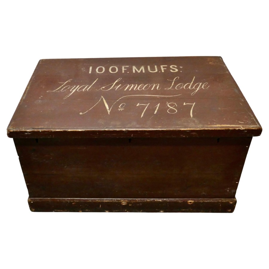 19th Century Masonic Pine Chest This is a best quality box, it has an original painted finish with the Loge details painted in script on the top The interior is clean, the box is in good used condition blacksmith made strap hinges and carrying handles This is a piece of superb quality with some wear to the finish The box measures 38’’ wide x 25’’ deep and stands 19’’ high TGB639 Manufacture Date : 19th century Materials : Pine