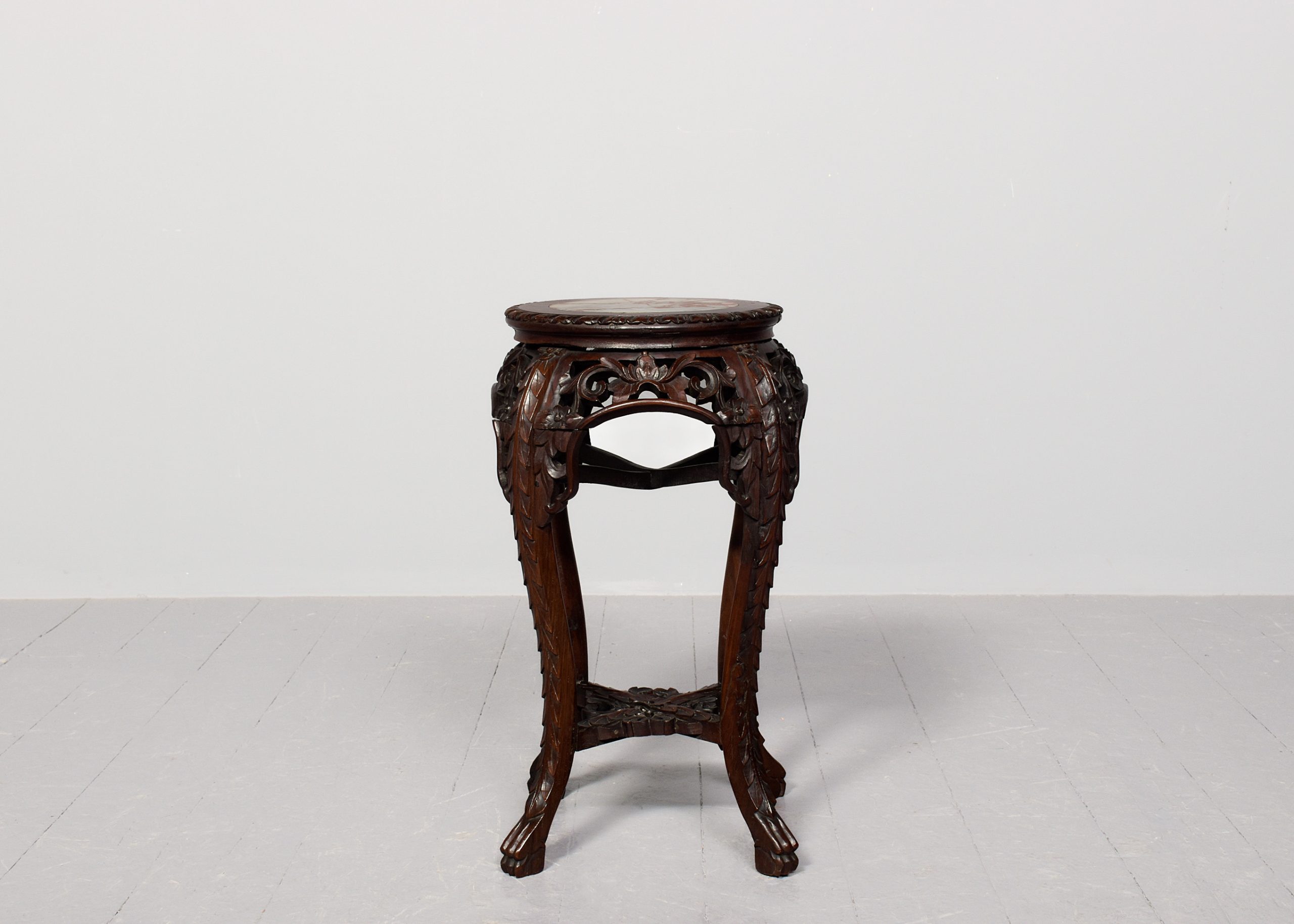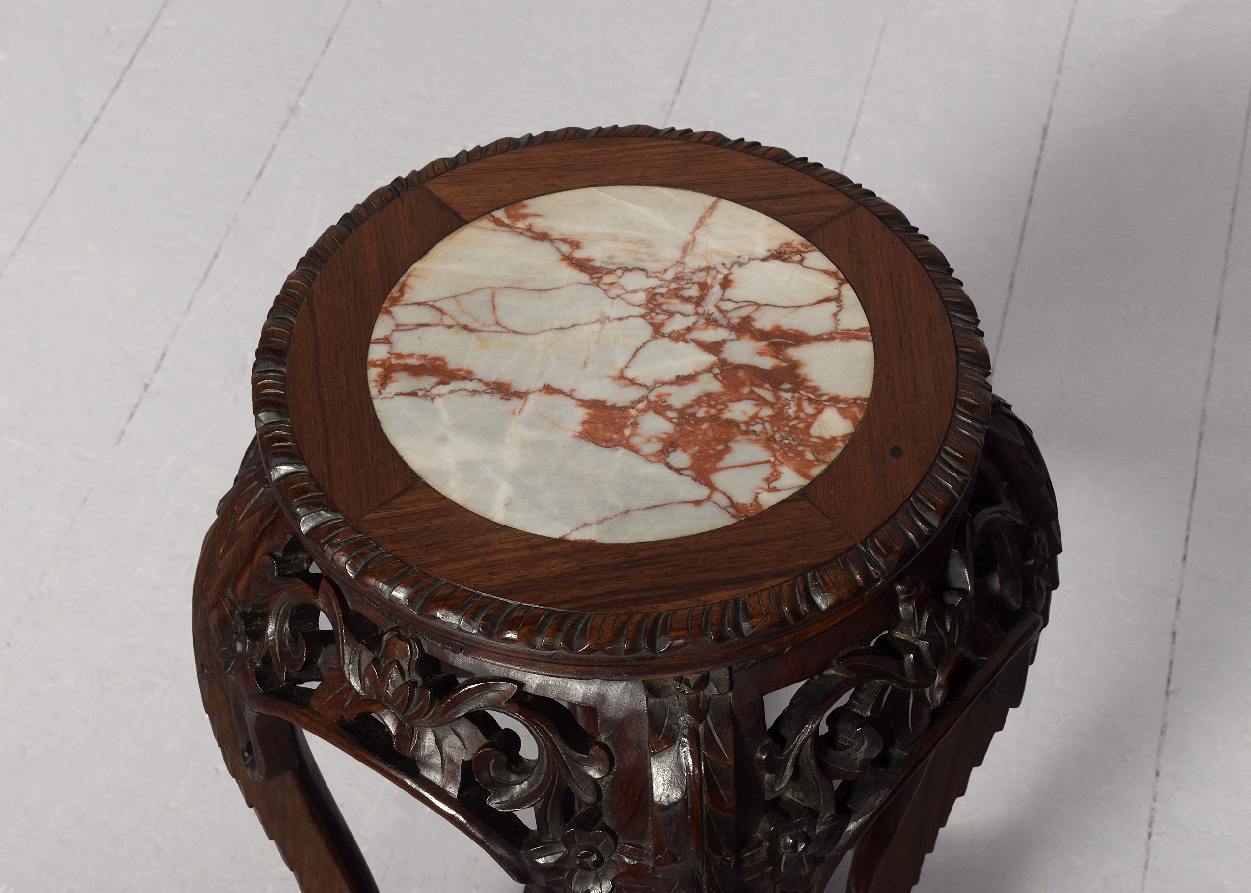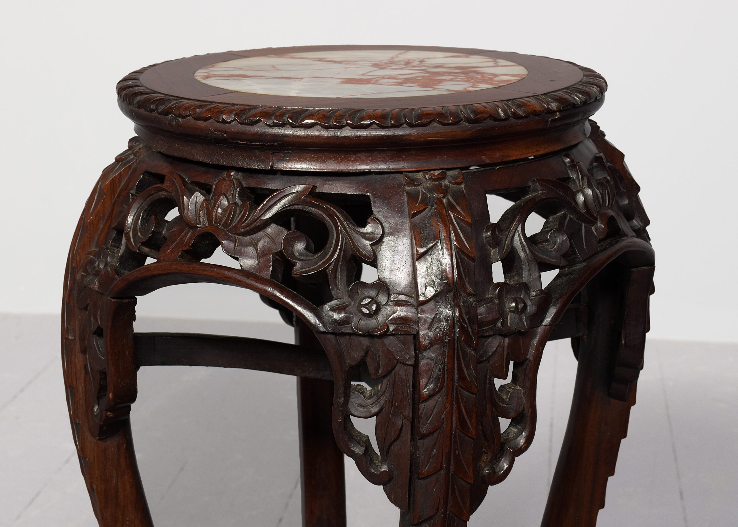 Circa 1890. Quality late 19th-century Qing dynasty Hongmu Marble Top Plantstand. The circular top with fluted edges and a grey and burgundy flecked marble inset over an open, foliate-carved frieze. Supported on foliate carved cabriole legs with a lower fretted stretcher. In excellent order