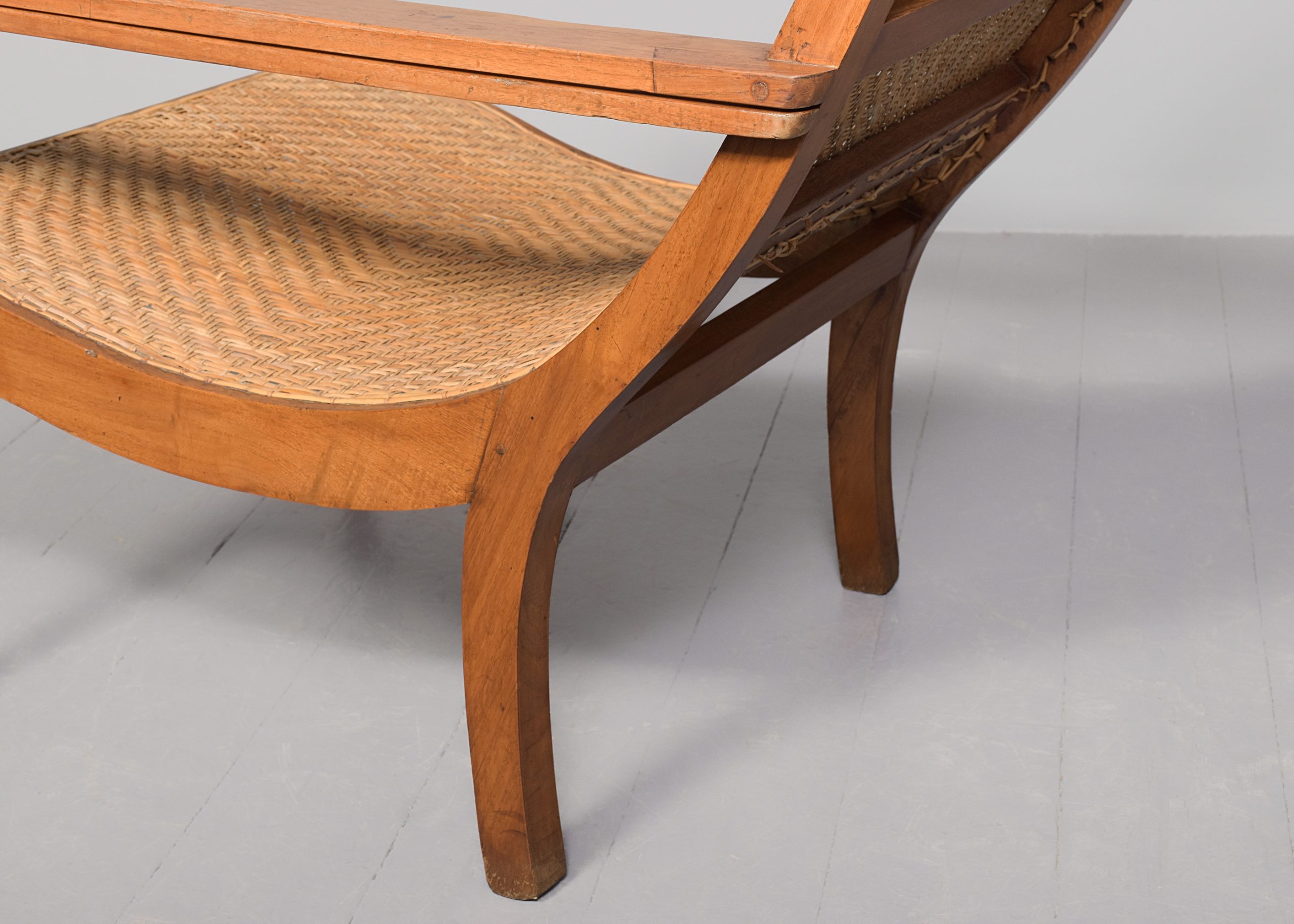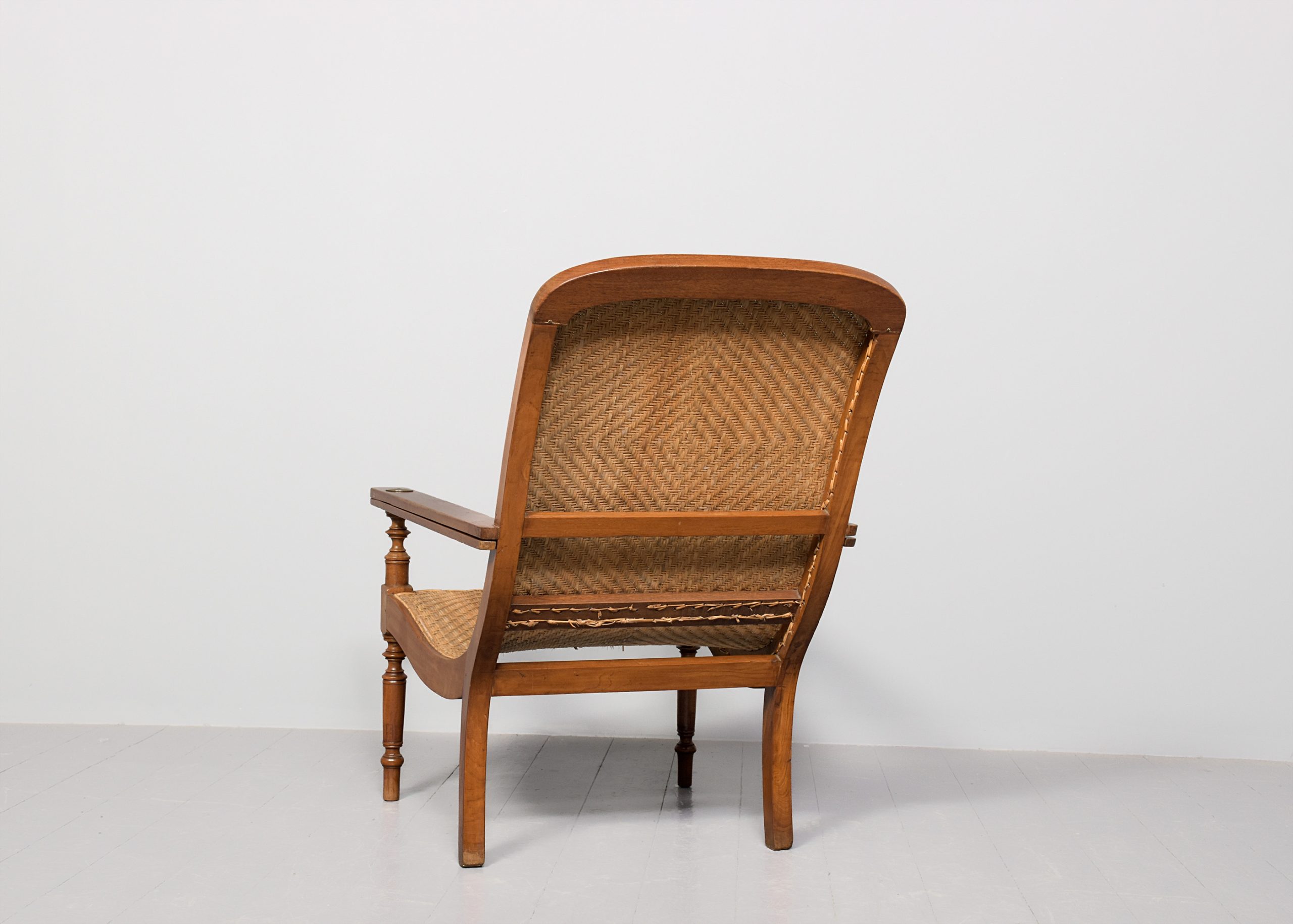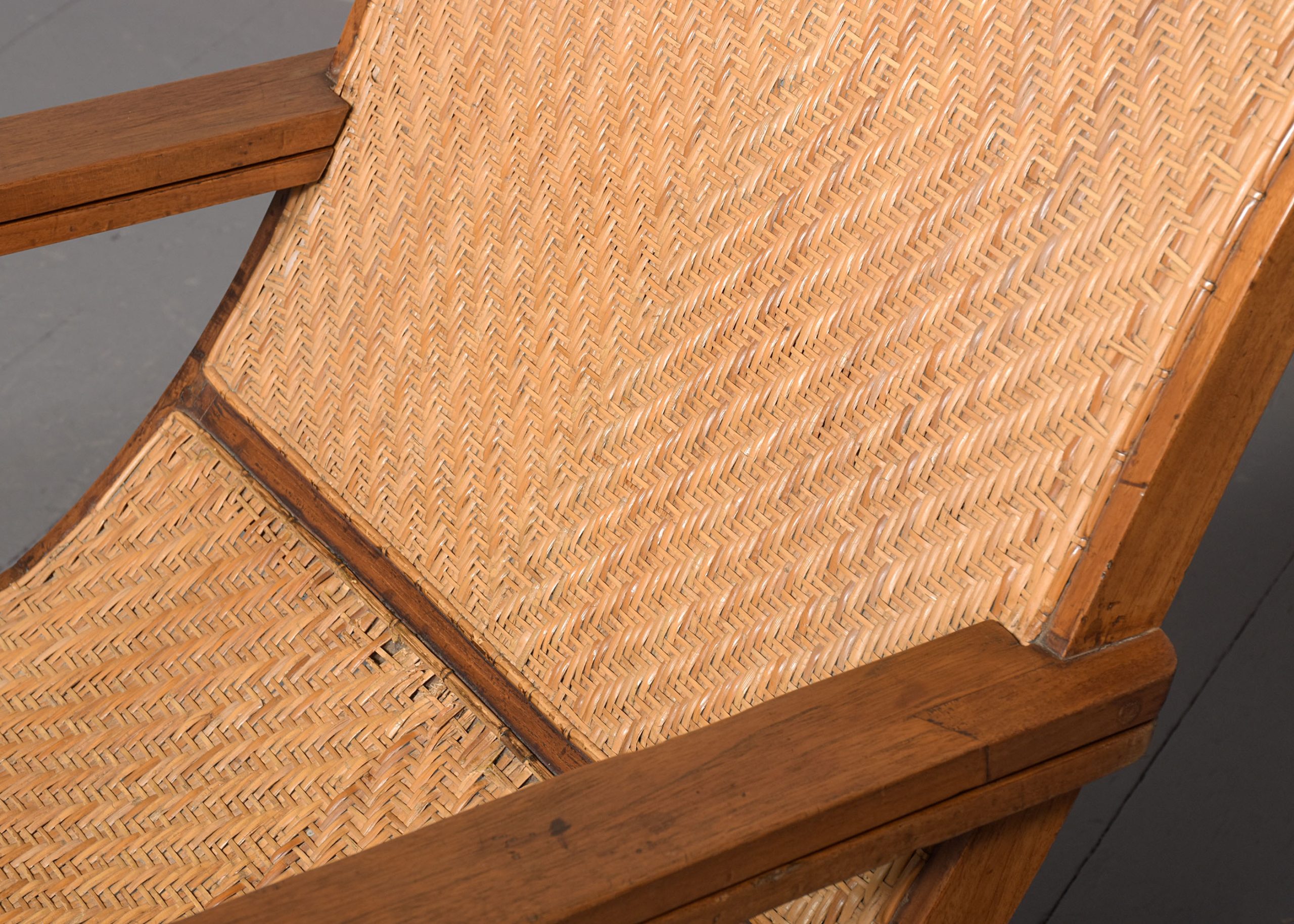 Circa 1860. 19th-century rattan wicker-upholstered Anglo-Indian hardwood planters chair. The arched back with geometric rattan upholstery flanked by two long arms and a long concave seat. The arms with swing-out extensions to the front to hold a tray. All supported on ring-turned tapering front legs and rectangular rear legs. Some very slight Imperfections to the wicker work that is fully sturdy.