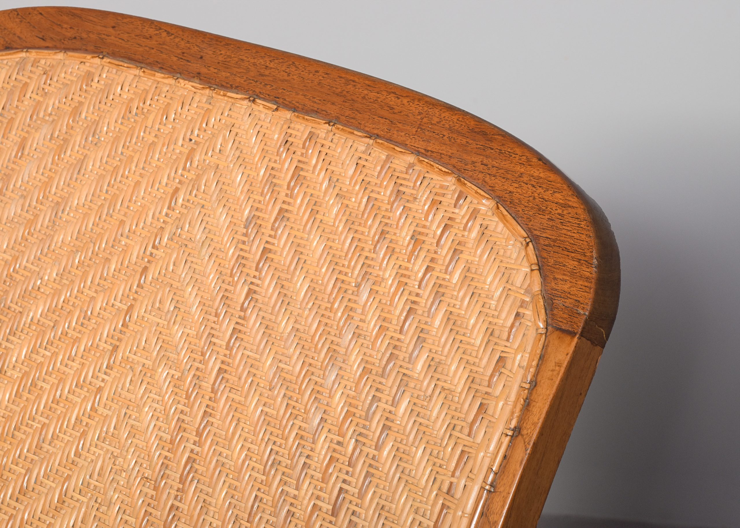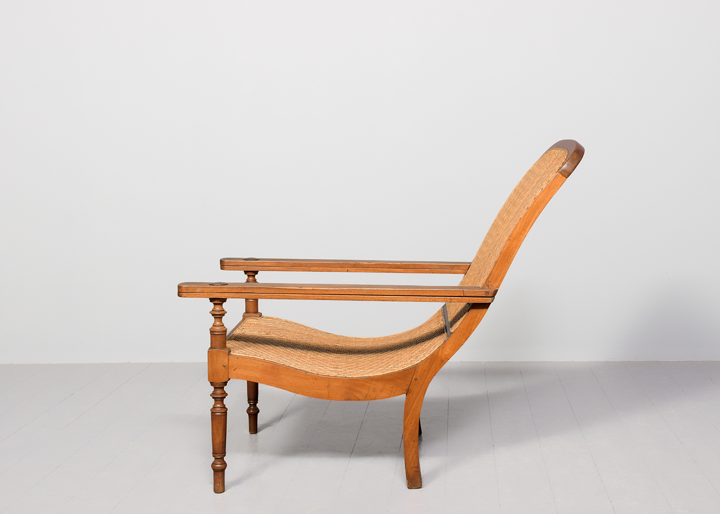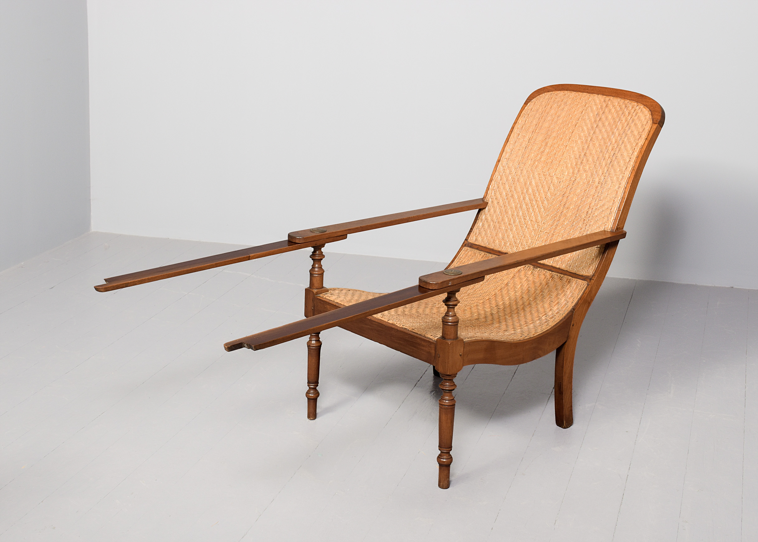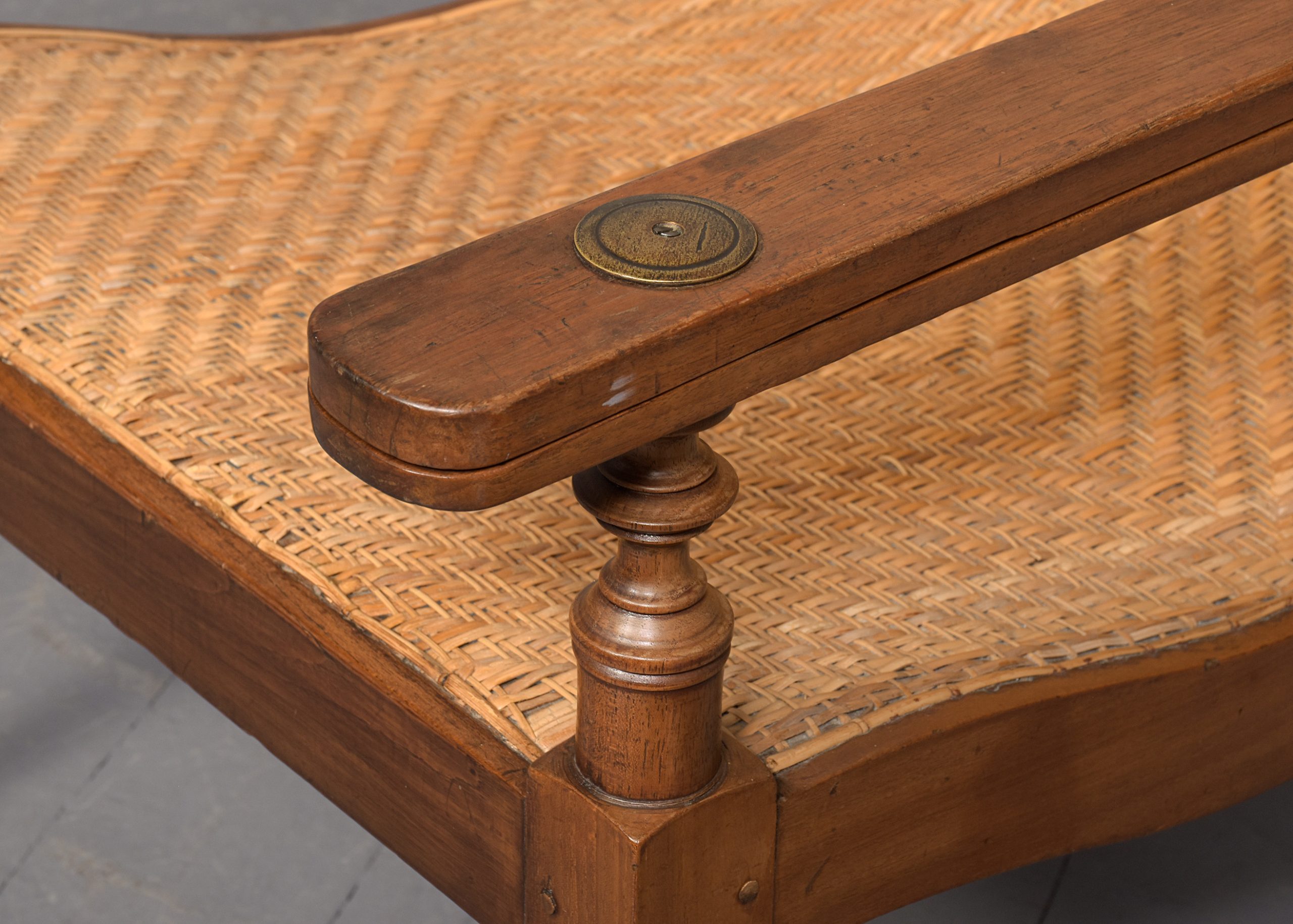 Circa 1860. 19th-century rattan wicker-upholstered Anglo-Indian hardwood planters chair. The arched back with geometric rattan upholstery flanked by two long arms and a long concave seat. The arms with swing-out extensions to the front to hold a tray. All supported on ring-turned tapering front legs and rectangular rear legs. Some very slight Imperfections to the wicker work that is fully sturdy.