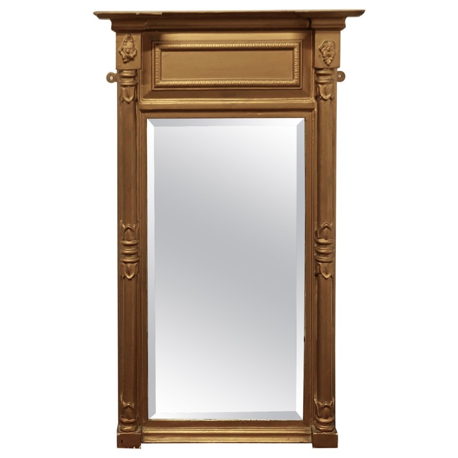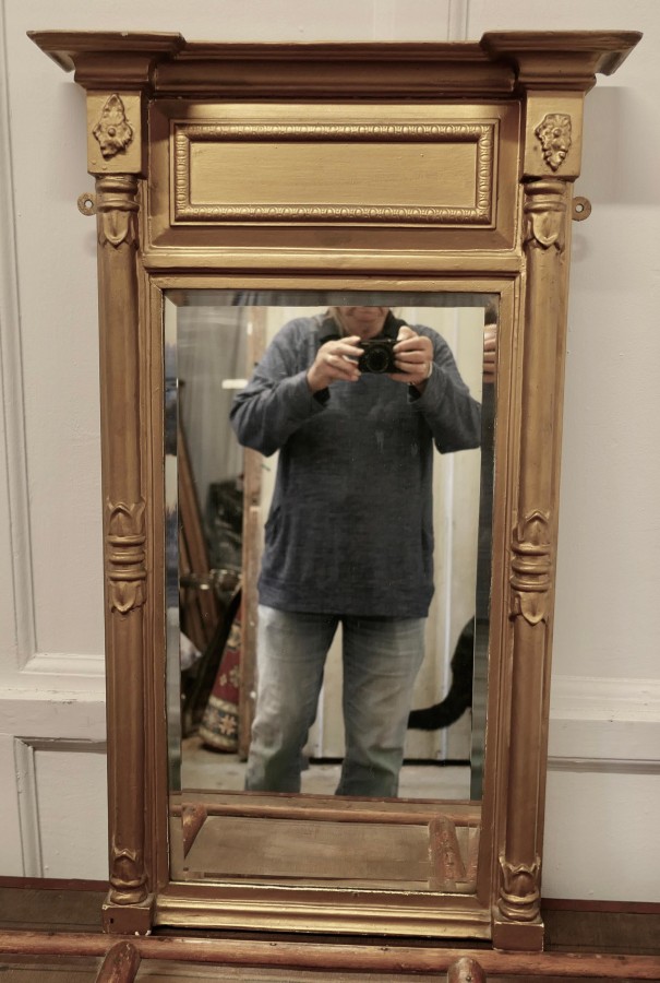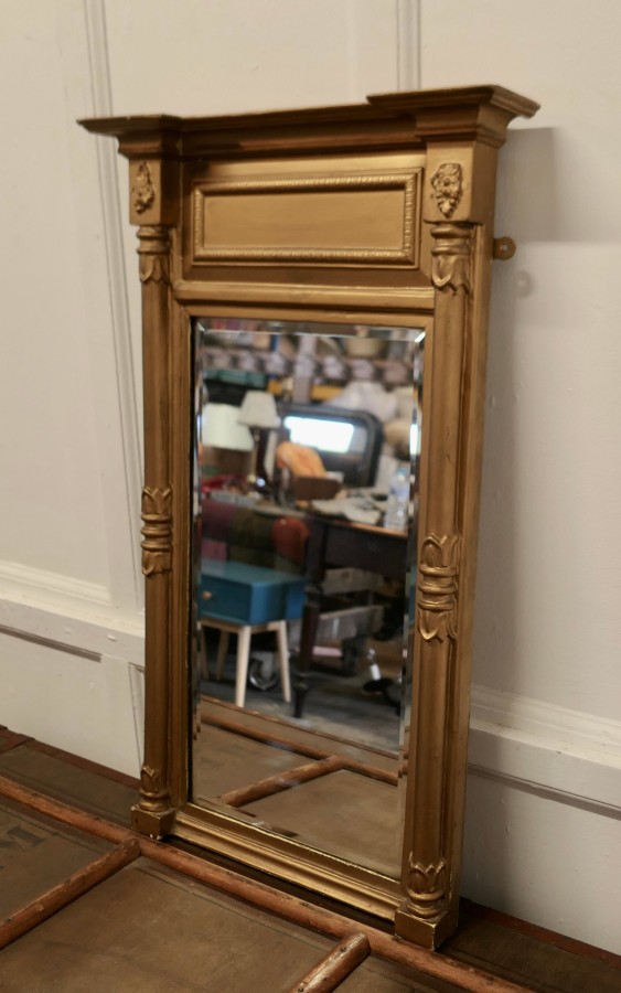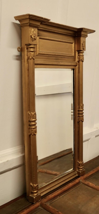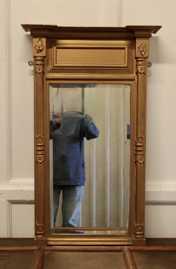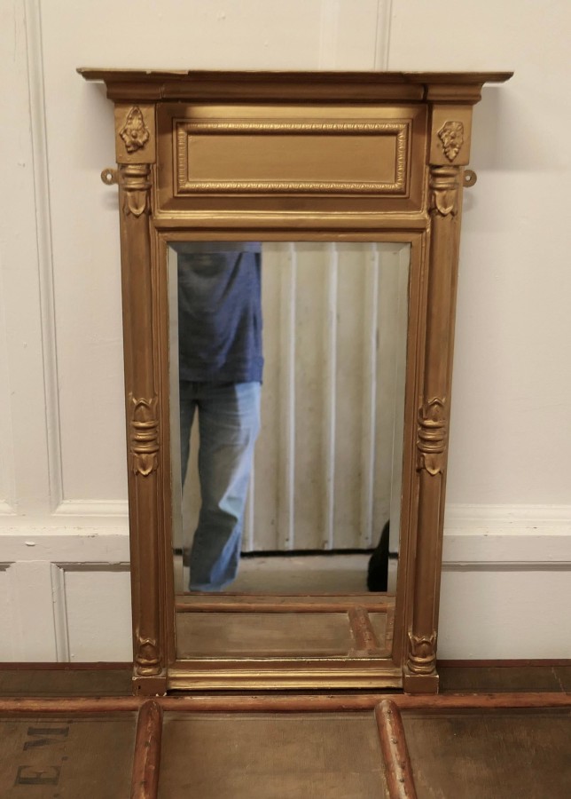 19th Century Regency Gilt Mirror The Regency Carved Frame has turned columns at either side and a panel along the top, the Age Darkened Gold paint on the Frame is in generally good condition The mirror is bevelled and and in good condition, it is 20.5” wide and 33” high MS253 Manufacture Date : 19th Century Materials : Giltwood