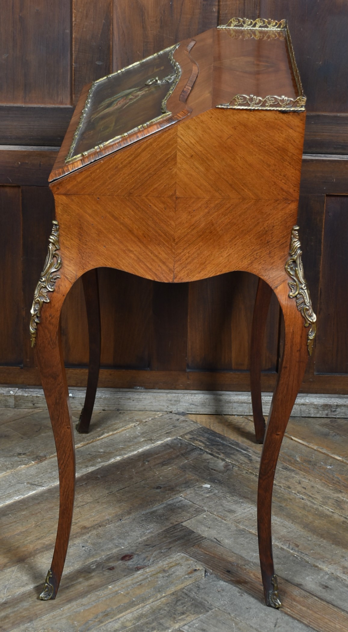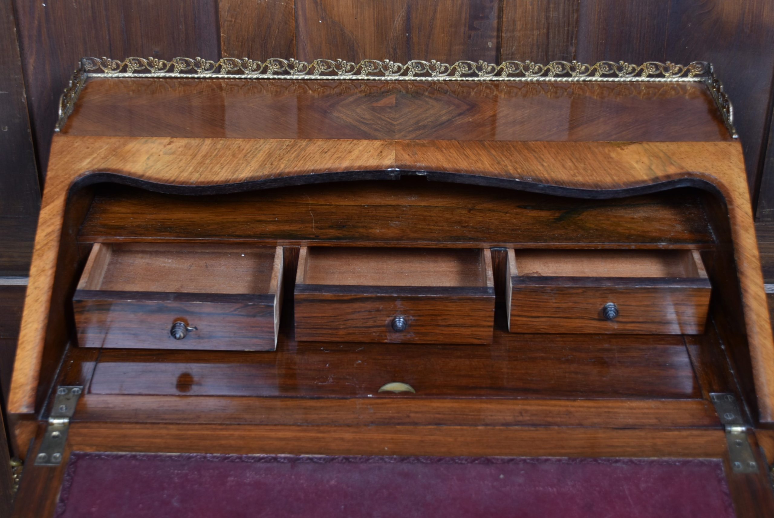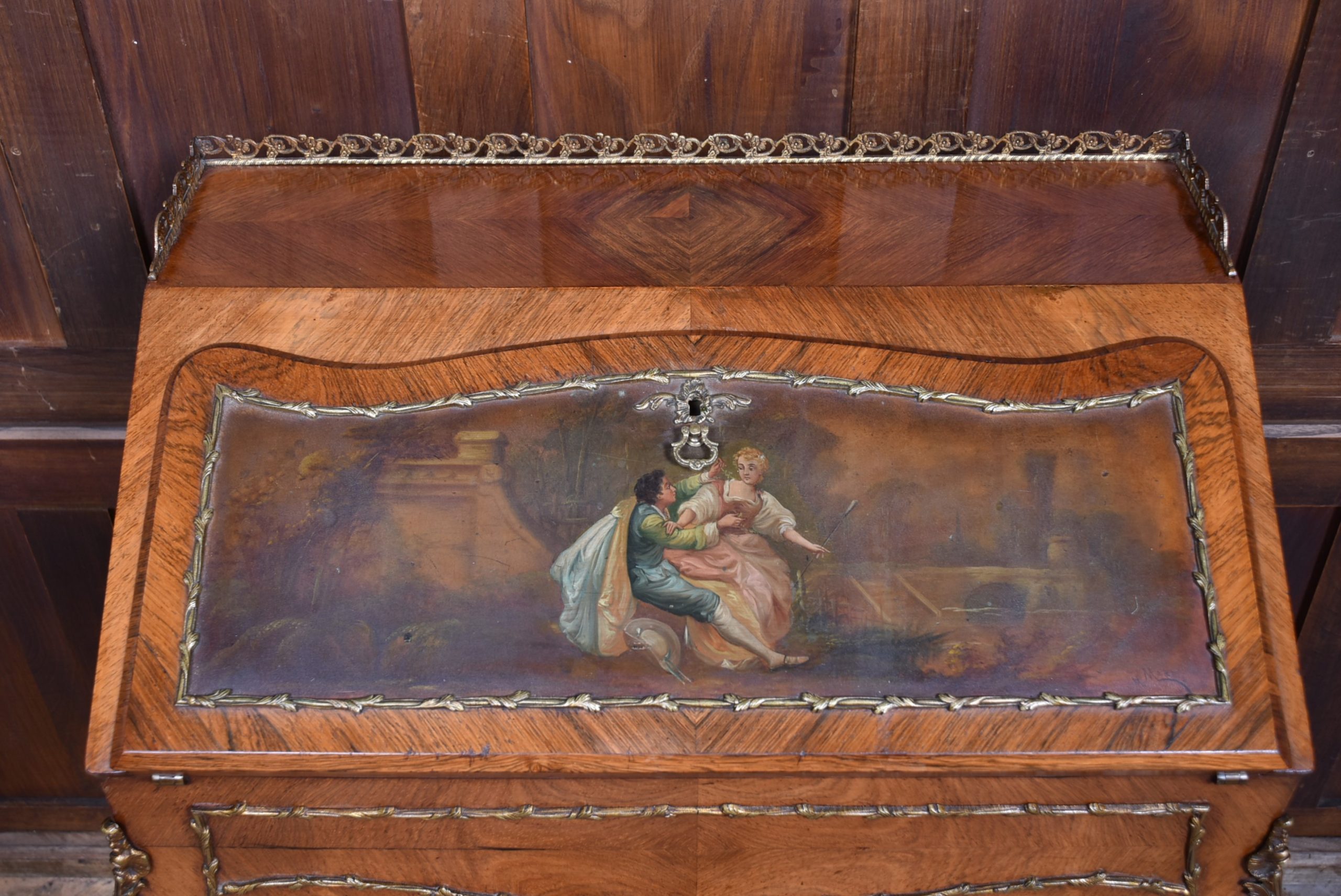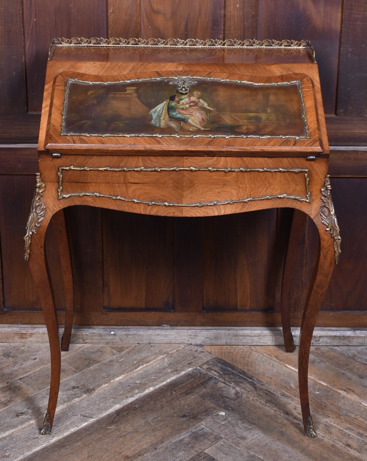 Superb rosewood writing bureau with pierced brass galleries and features a fall-front panel hand-painted with a romantic scene, framed in ornate ormolu mounts and signed H. Martin. The shaped fall opens to reveal a fitted interior with a wine-coloured leather writing surface and three small drawers, offering both charm and practicality. Raised on four slender cabriole legs with ormolu mounts at the knees and decorative sabots at the feet, the bureau is united by a shaped apron that enhances its graceful silhouette. With its warm tones, refined proportions, and functional elegance, this bureau is a striking fusion of decorative artistry and timeless utility—an ideal centrepiece for any sophisticated study or interior.