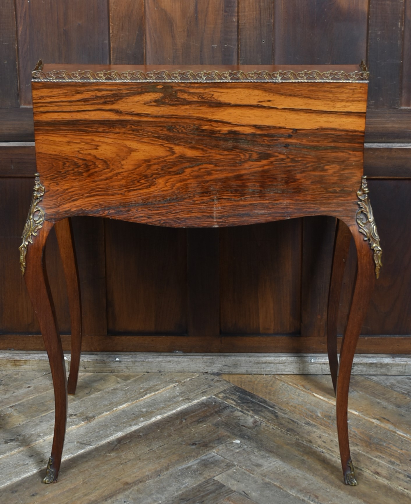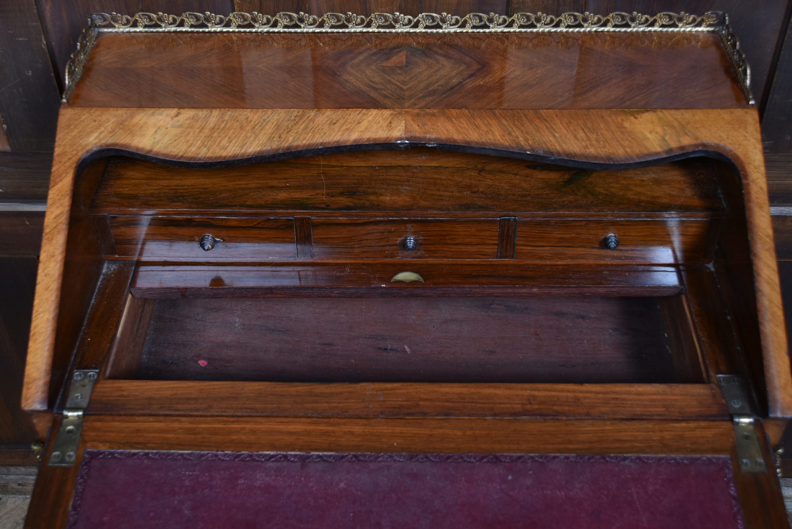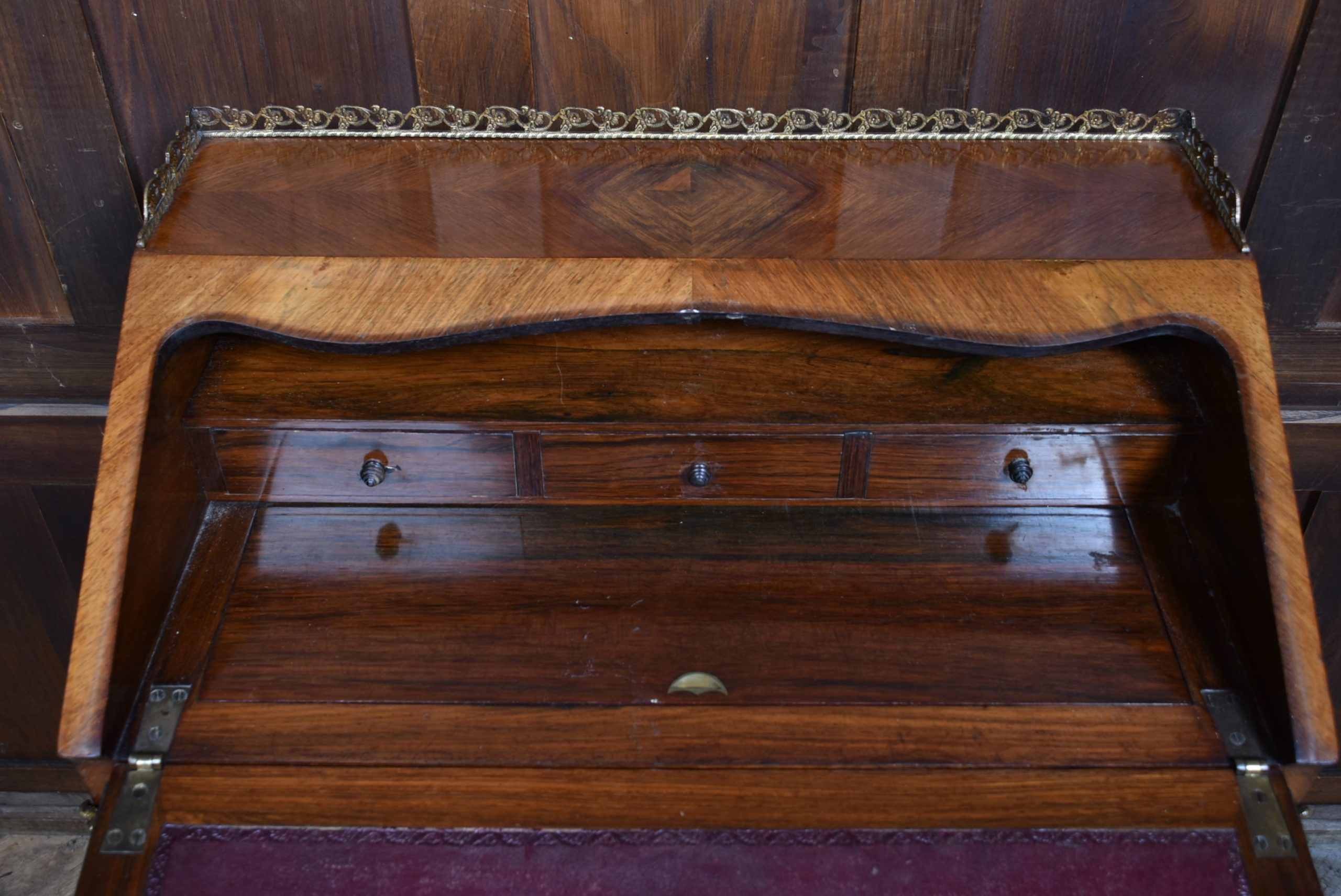 Superb rosewood writing bureau with pierced brass galleries and features a fall-front panel hand-painted with a romantic scene, framed in ornate ormolu mounts and signed H. Martin. The shaped fall opens to reveal a fitted interior with a wine-coloured leather writing surface and three small drawers, offering both charm and practicality. Raised on four slender cabriole legs with ormolu mounts at the knees and decorative sabots at the feet, the bureau is united by a shaped apron that enhances its graceful silhouette. With its warm tones, refined proportions, and functional elegance, this bureau is a striking fusion of decorative artistry and timeless utility—an ideal centrepiece for any sophisticated study or interior.