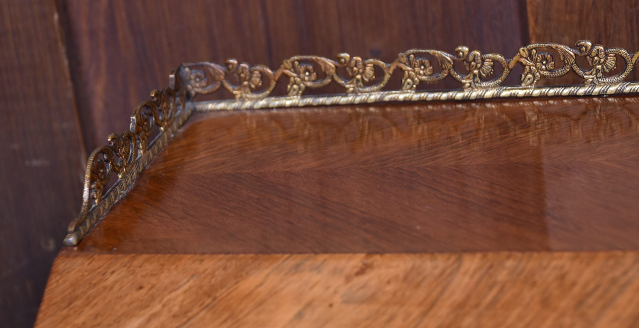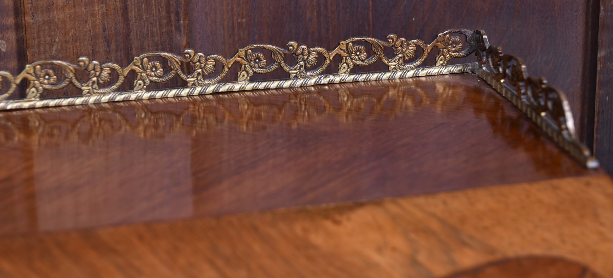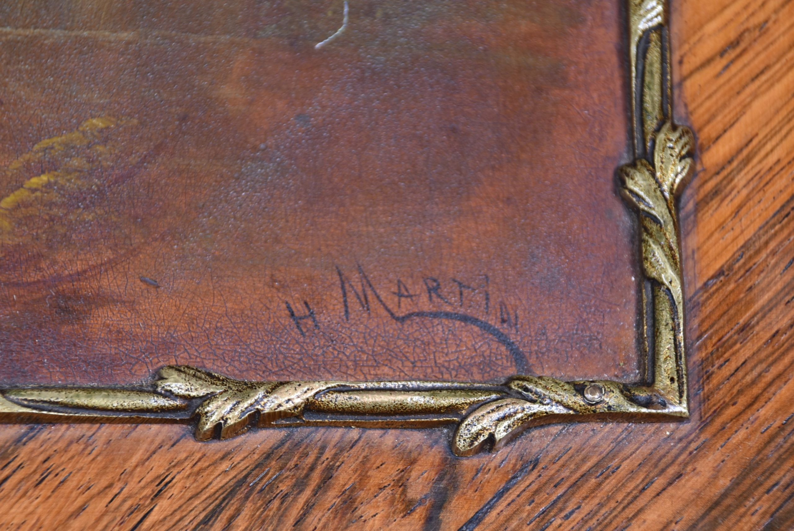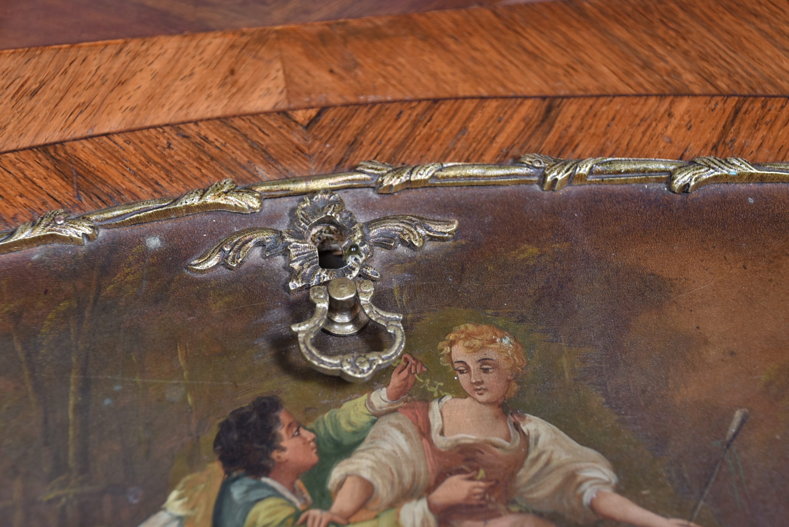 Superb rosewood writing bureau with pierced brass galleries and features a fall-front panel hand-painted with a romantic scene, framed in ornate ormolu mounts and signed H. Martin. The shaped fall opens to reveal a fitted interior with a wine-coloured leather writing surface and three small drawers, offering both charm and practicality. Raised on four slender cabriole legs with ormolu mounts at the knees and decorative sabots at the feet, the bureau is united by a shaped apron that enhances its graceful silhouette. With its warm tones, refined proportions, and functional elegance, this bureau is a striking fusion of decorative artistry and timeless utility—an ideal centrepiece for any sophisticated study or interior.
