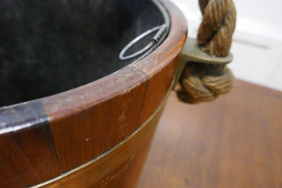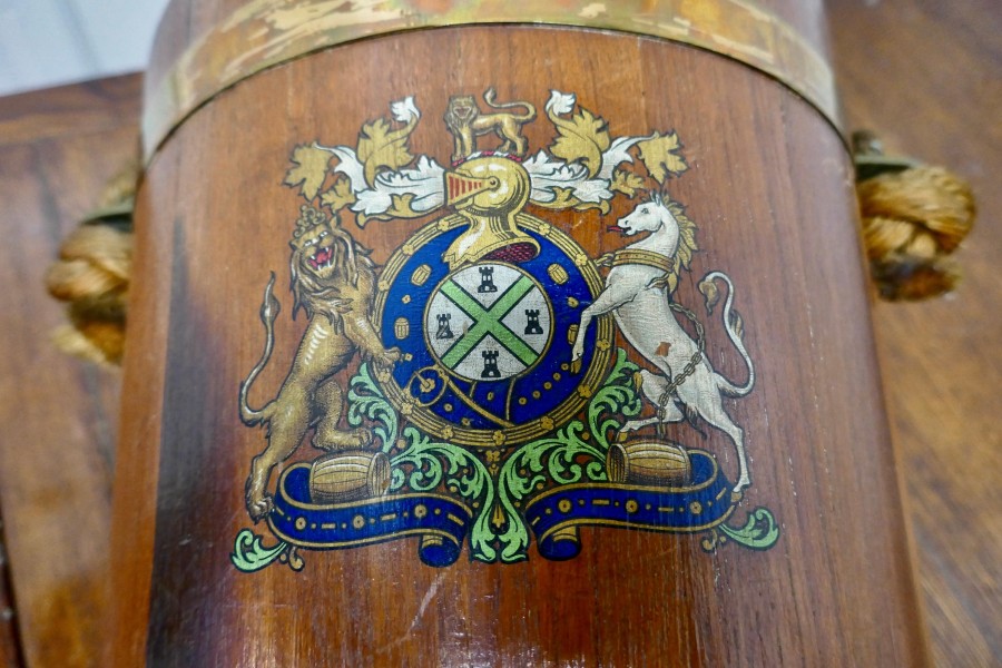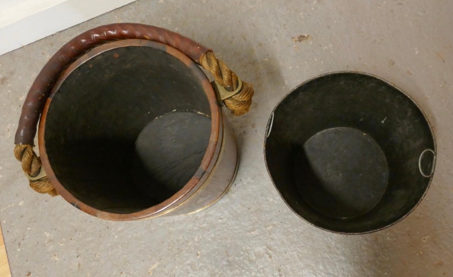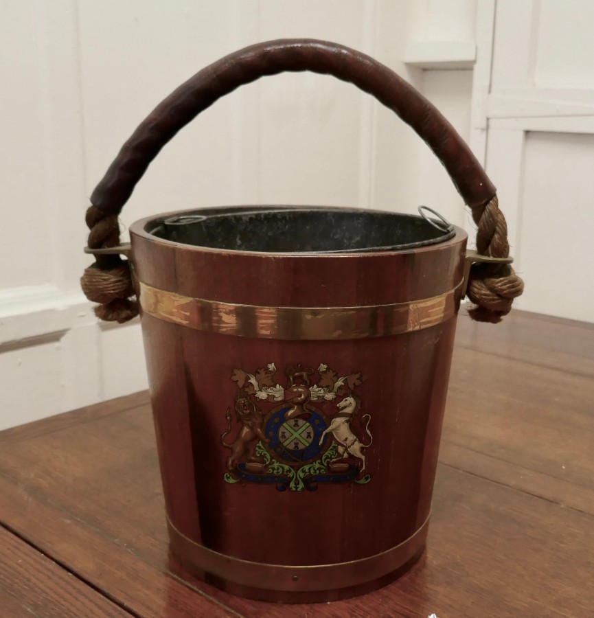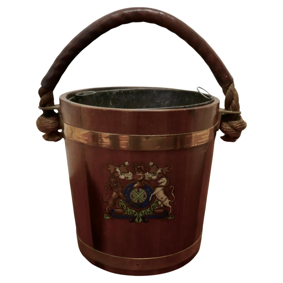 19th Century Royal Navy Oak Fire Bucket, with Plymouth Armorial Crest This is a superb looking piece made in Oak and decorated with the Plymouth Armorial Crest, it was used as a water carrier but now has the addition of a lift out metal liner so that it can be used as a coal bucket, it is bound with wide brass and a leather covered rope handle The bucket has a superb patina and would work well as a stand alone piece of history It is 13” high plus the handle and 12” in diameter TAC257 Manufacture Date : 1870 Materials : Oak