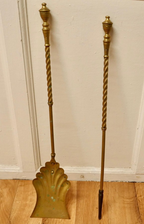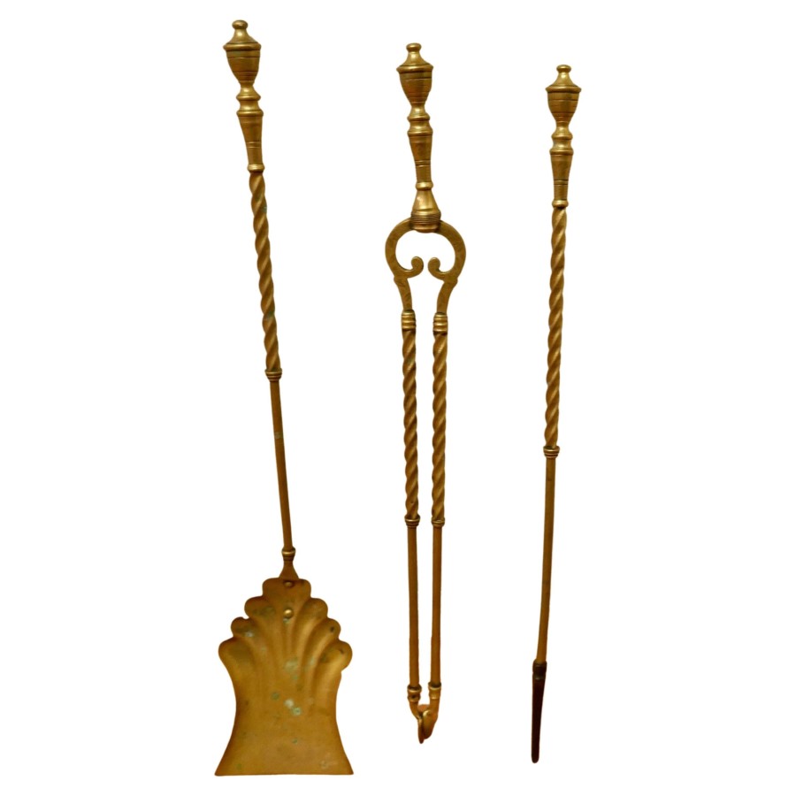 19th century set of long barley twist fireside tools A great trio, tongs, shovel and poker Made in Brass and in good used condition The tools are 27” long AC195. Manufacture Date : 1880 Materials : Brass