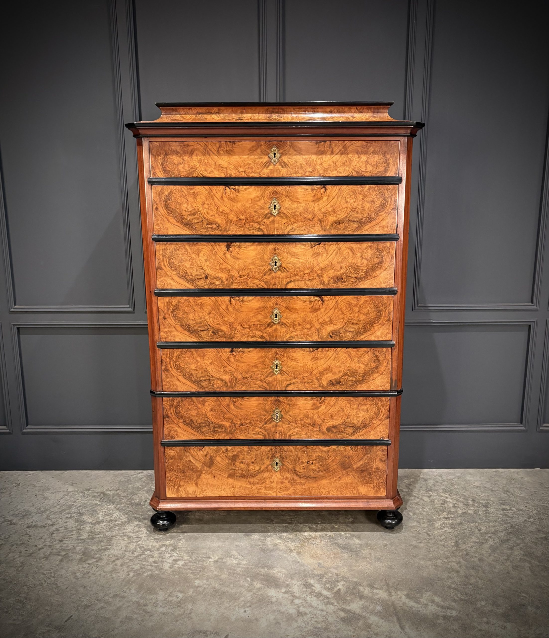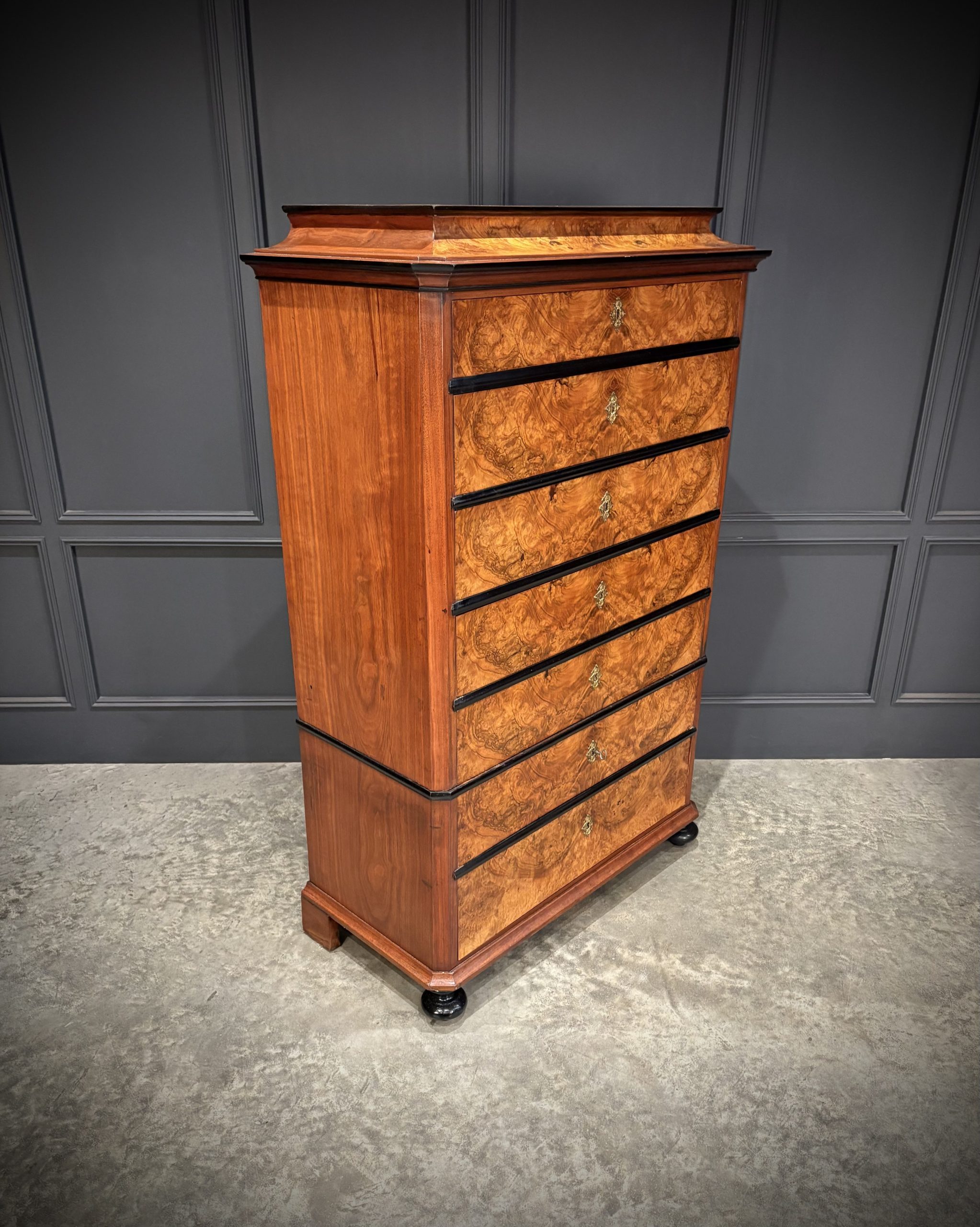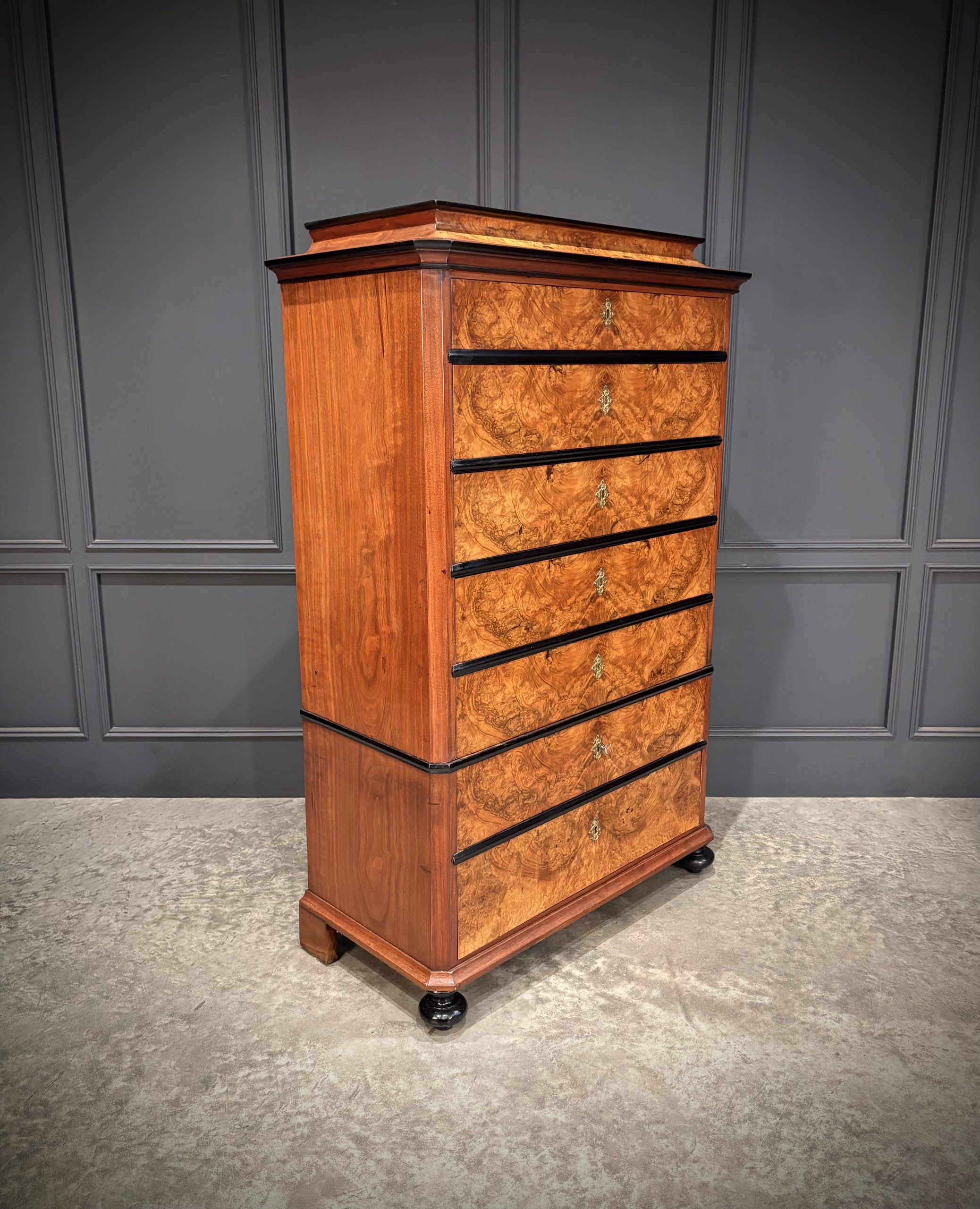 This elegant piece is crafted in two stacking sections for ease of transport and features seven drawers, each faced with beautifully figured walnut veneers and divided by contrasting ebonised mouldings.