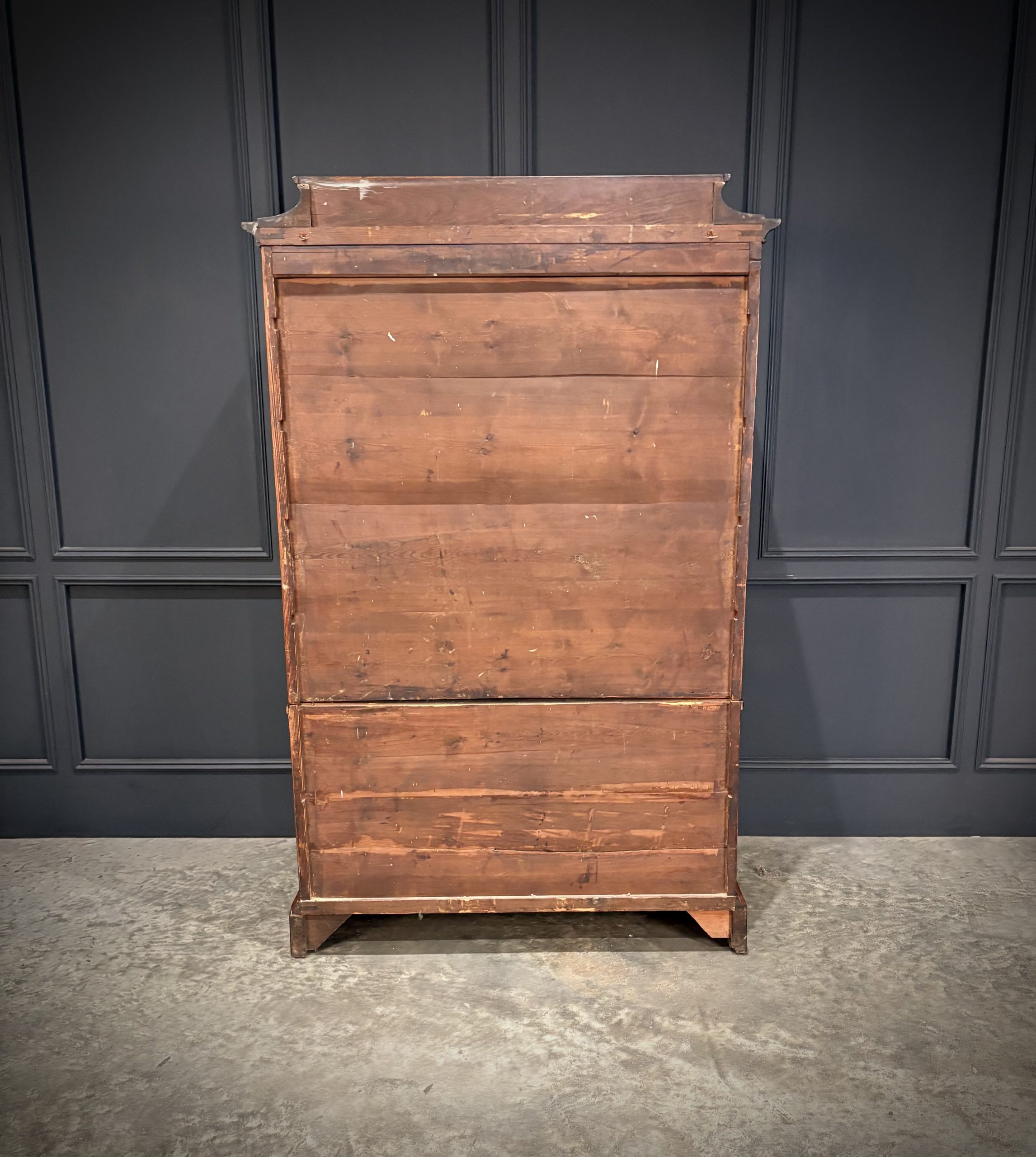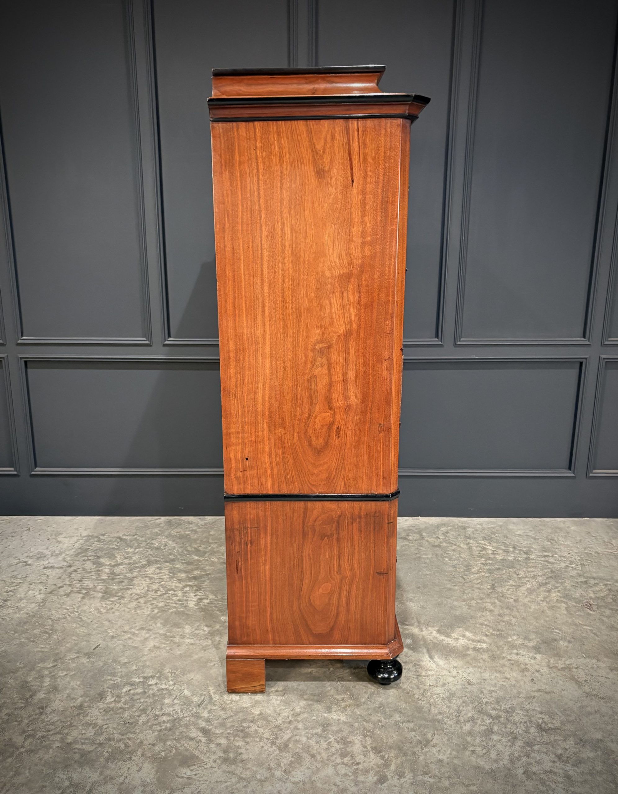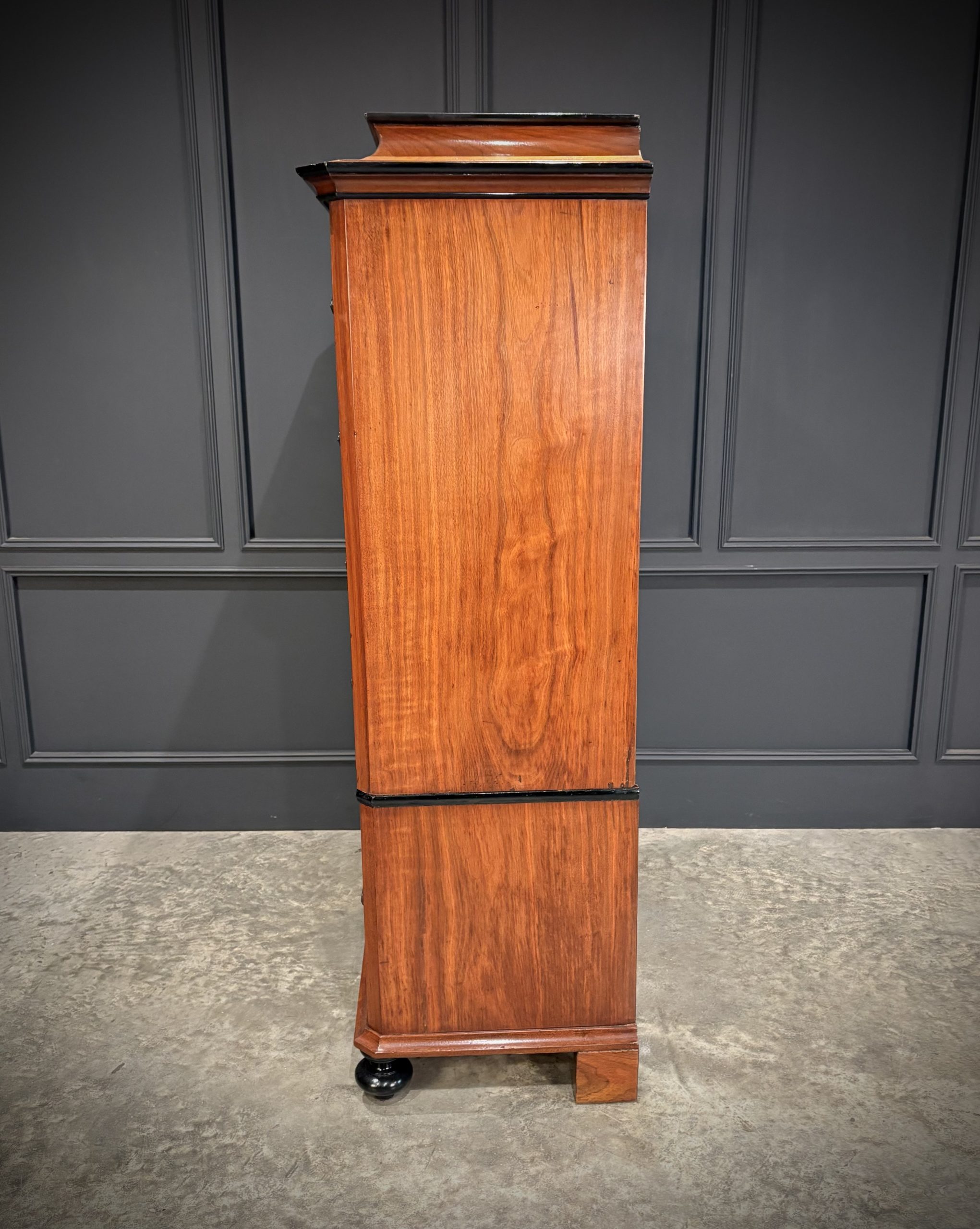 This elegant piece is crafted in two stacking sections for ease of transport and features seven drawers, each faced with beautifully figured walnut veneers and divided by contrasting ebonised mouldings.