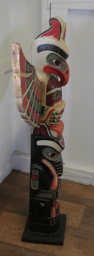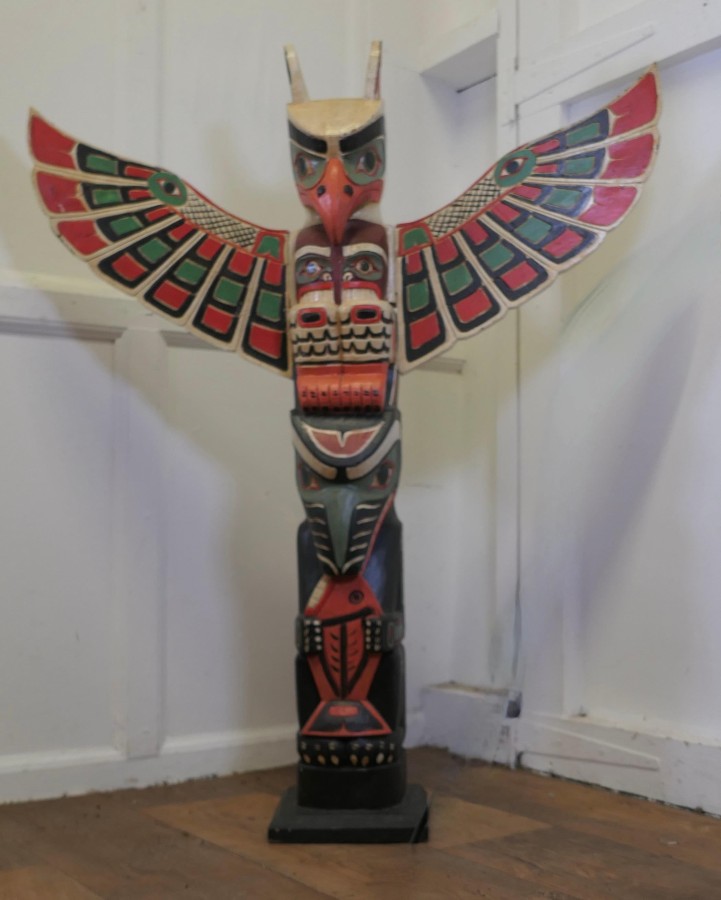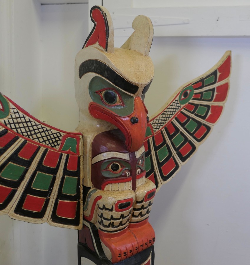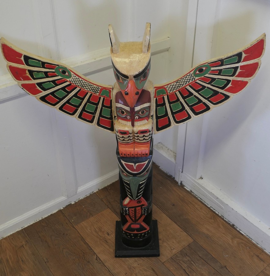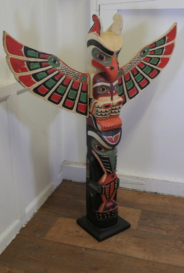 20th Century Native American Painted Totem Pole A painted animal totem. Animal totems are believed to have spiritual significance, watching over Pacific Northwest Indian tribes and families. This totem features an eagle or thunderbird at the top position and various others lower down. It has numerous pairs of individual eyes not to mention claws The Totem has paint that is bright and in good Condition, the wings can be removed to prevent damage during transportation The Totem is 40” tall, 33” wide and 8” deep TFB53 Manufacture Date : 1960 Materials : , Birdseye-maple