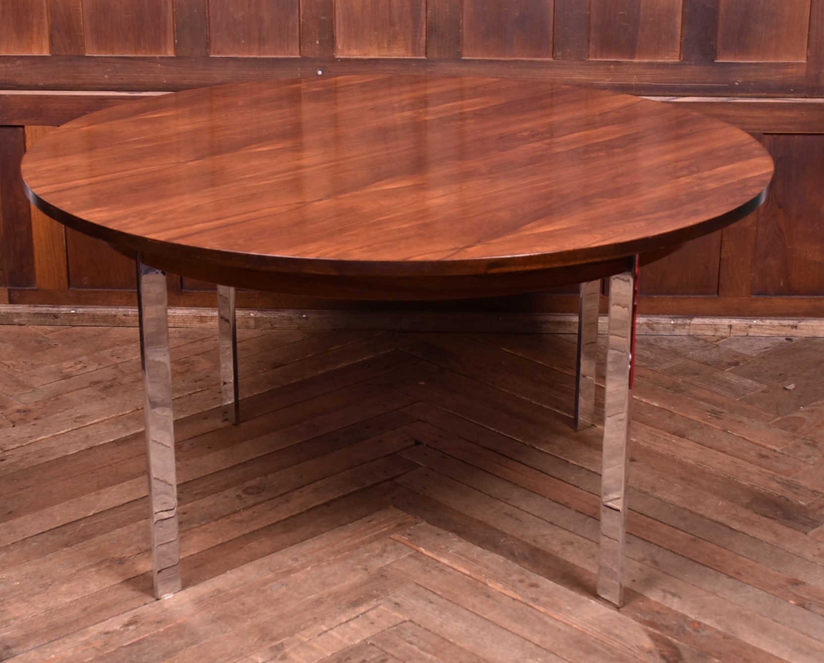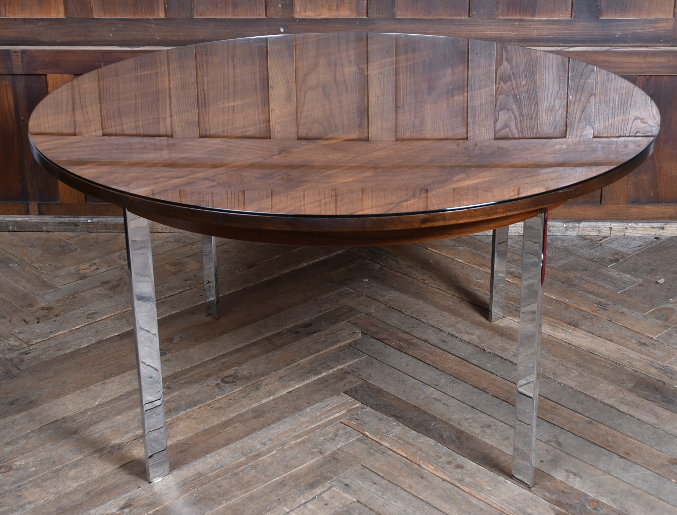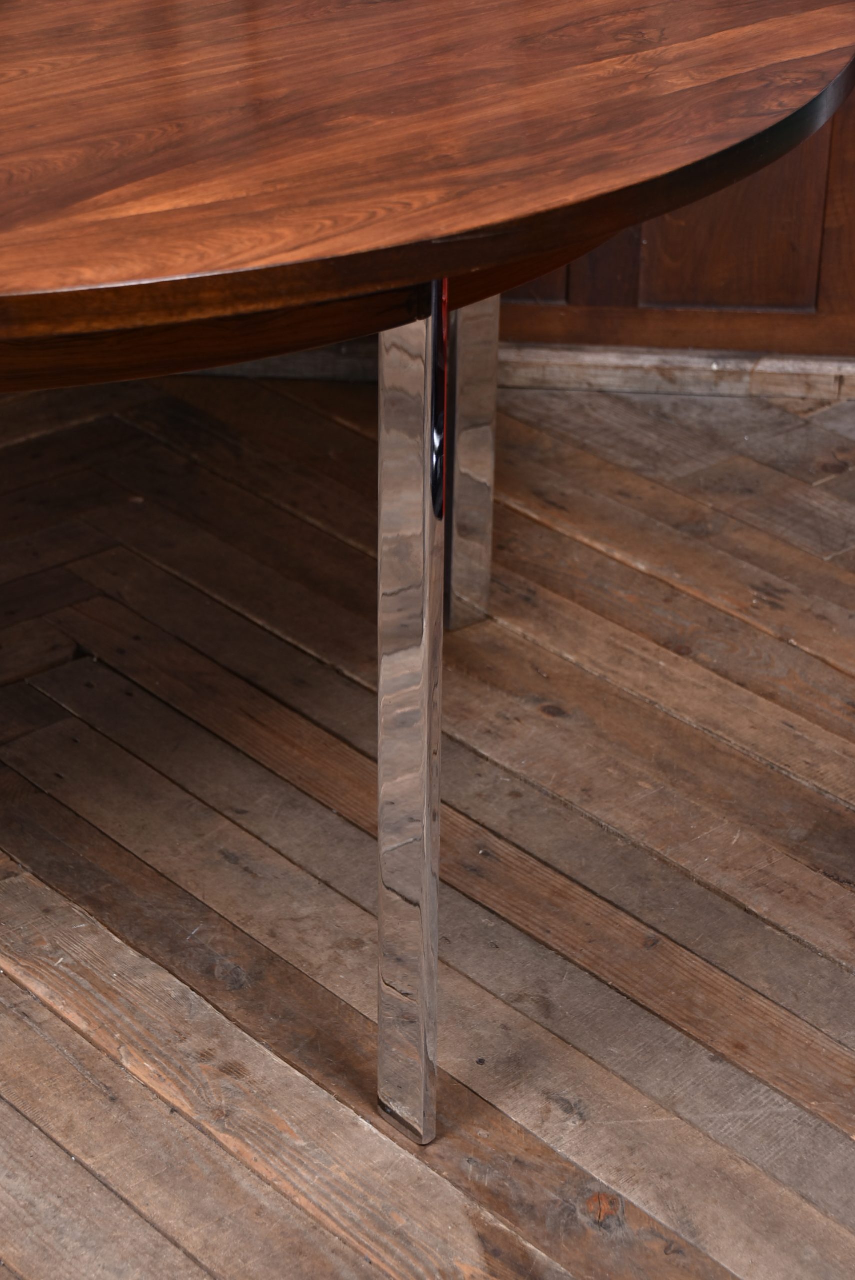 A superb 20th‑century dining table, beautifully preserved and full of character. The rosewood top shows a gorgeous depth of grain and is safeguarded by a glass protector, all supported by four polished chrome legs that give it a clean, modern feel.