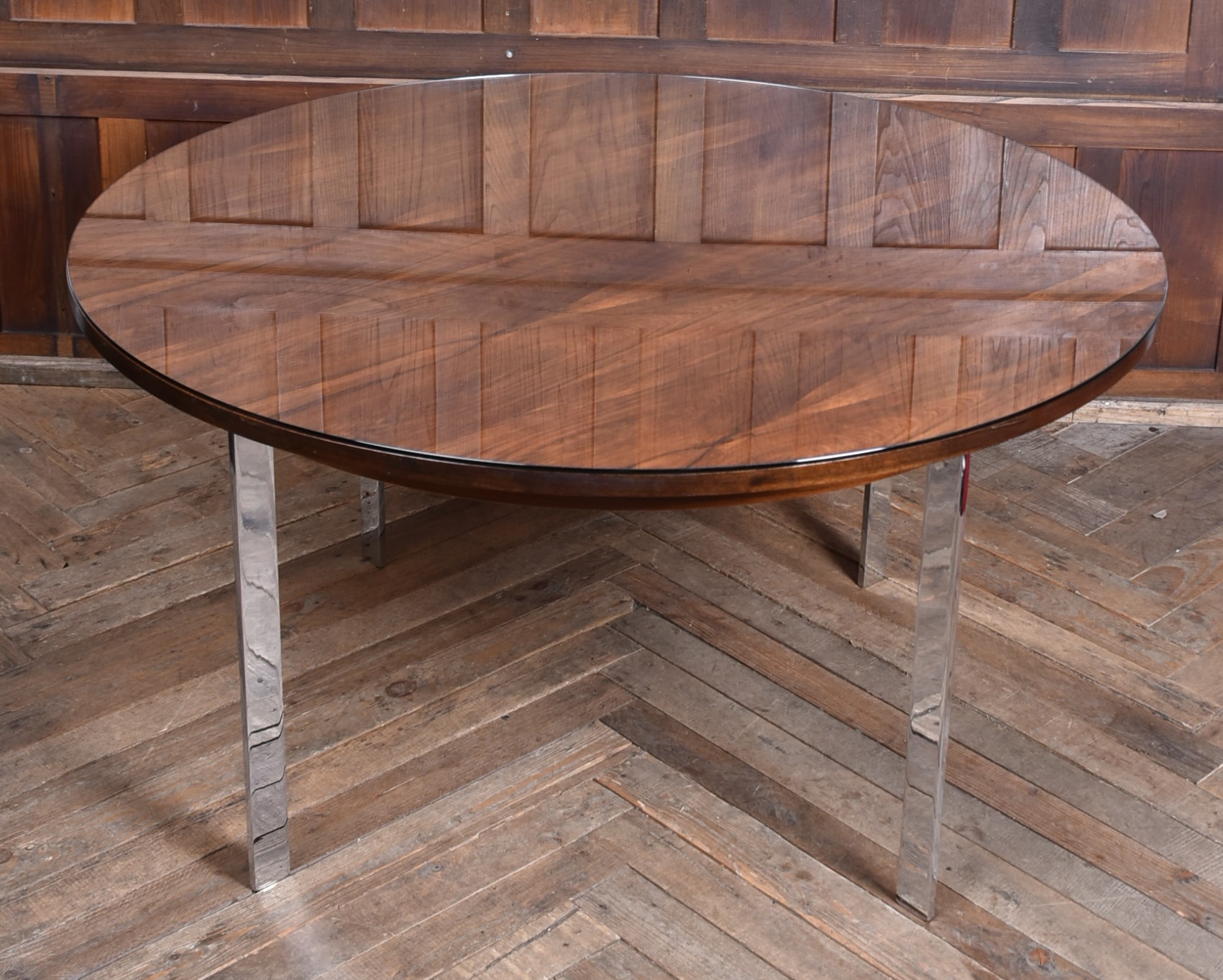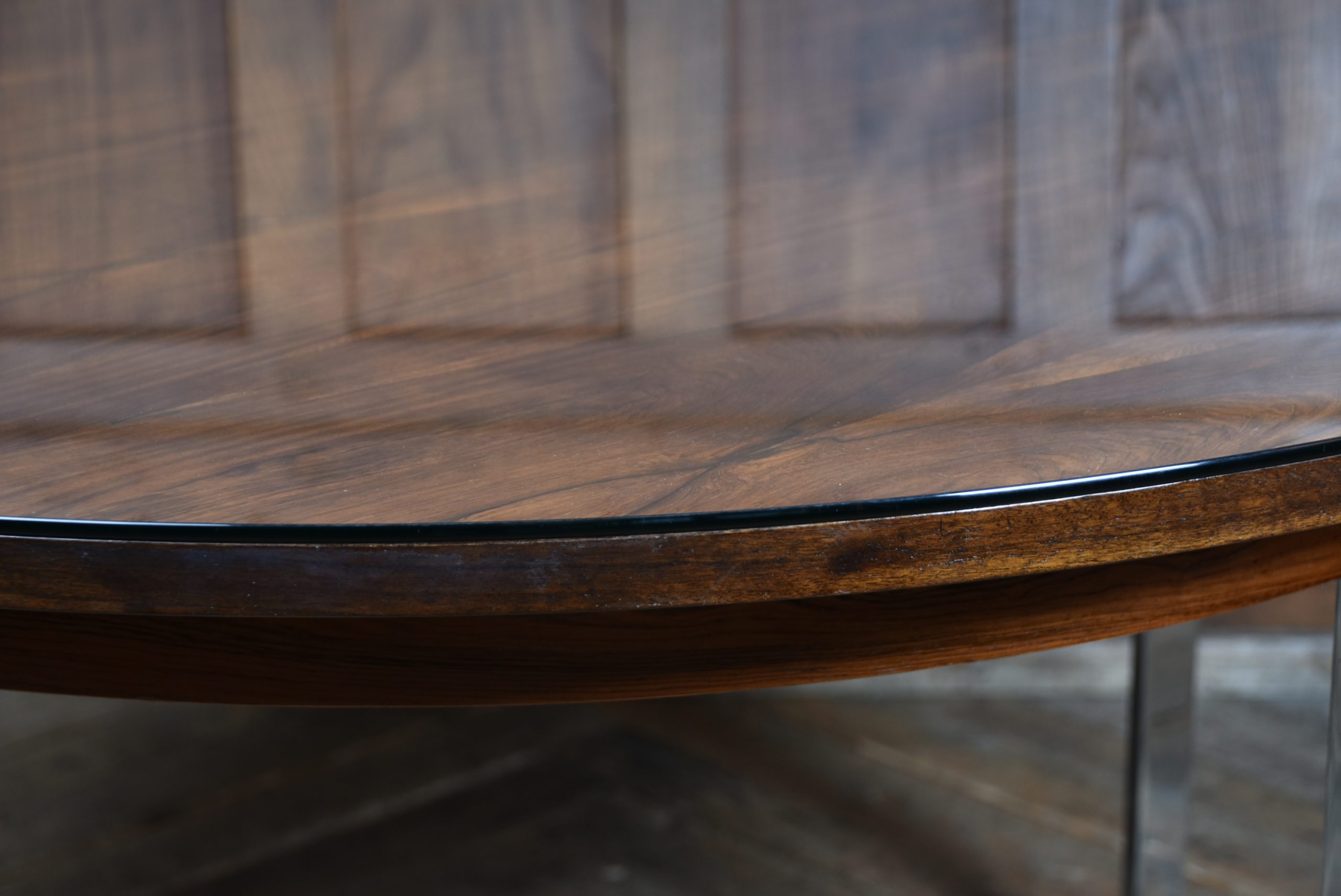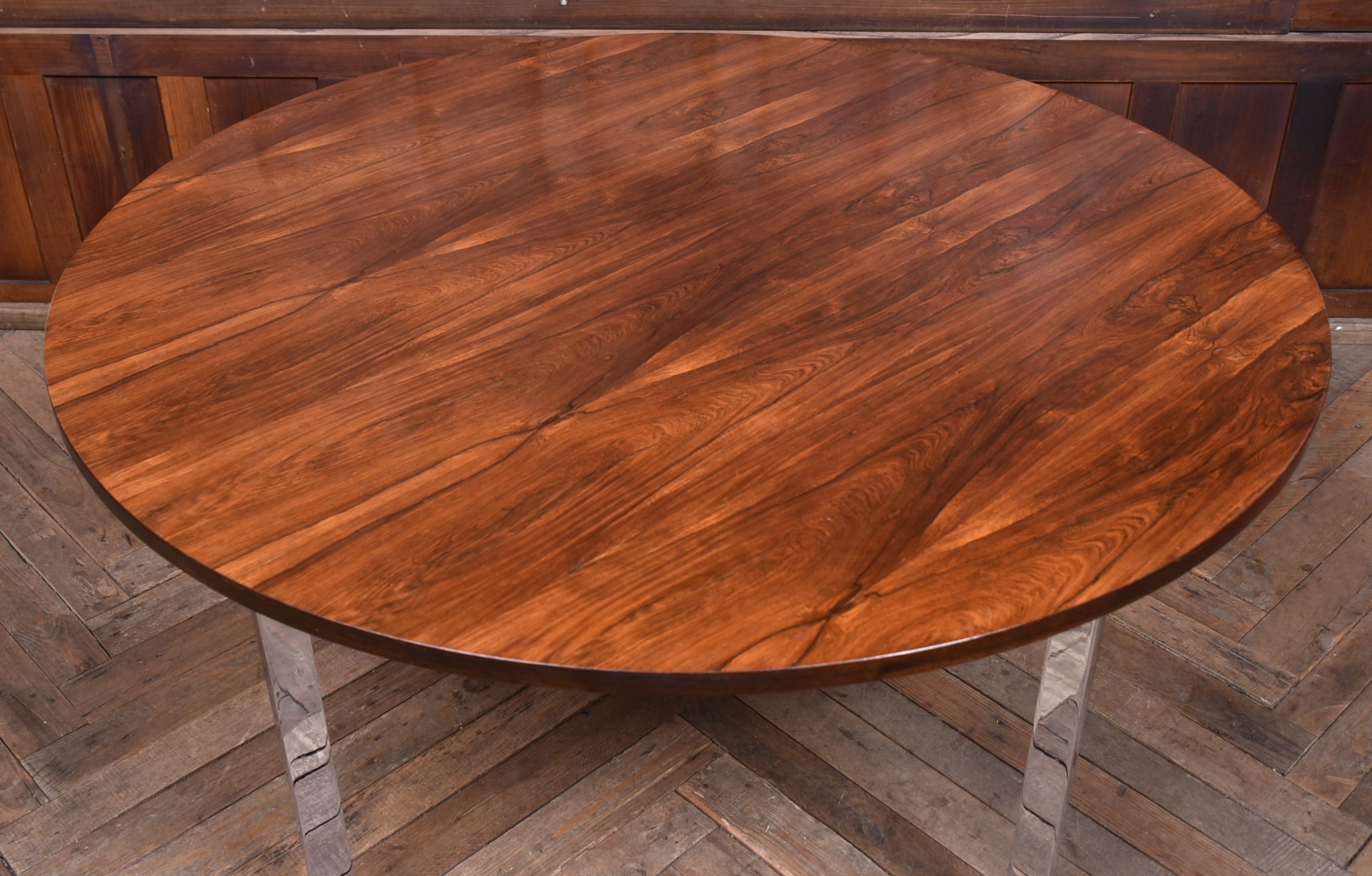 A superb 20th‑century dining table, beautifully preserved and full of character. The rosewood top shows a gorgeous depth of grain and is safeguarded by a glass protector, all supported by four polished chrome legs that give it a clean, modern feel.