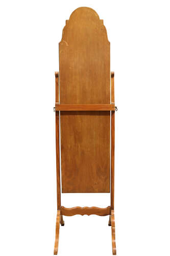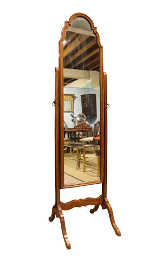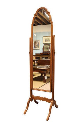 An early 20th-century cheval mirror, featuring an arched mirror plate set within a shaped wooden frame, raised on a swivelling stand with turned side supports and cabriole-style feet united by a shaped stretcher.