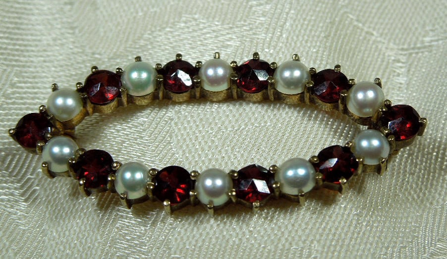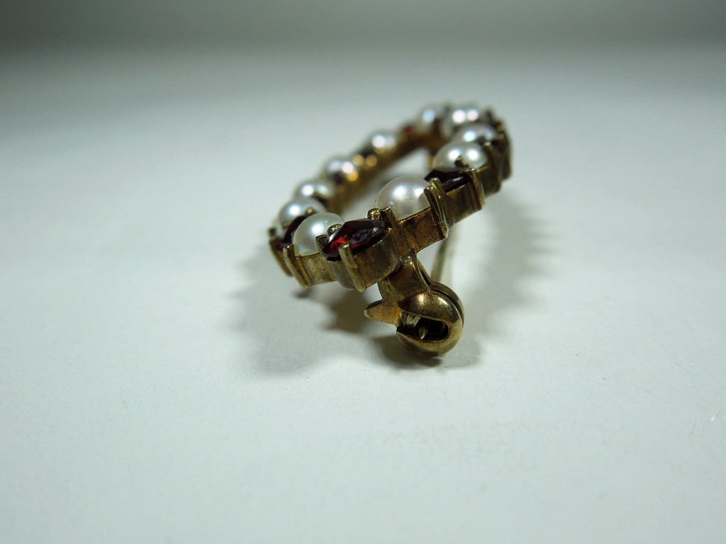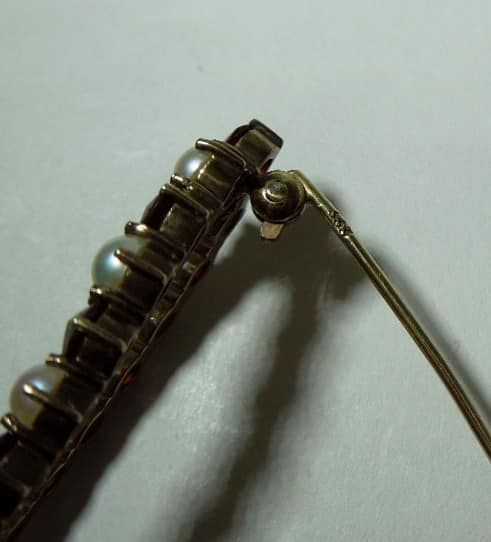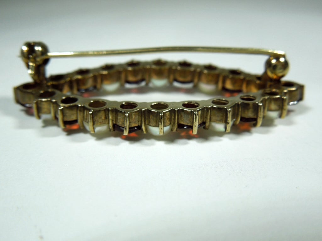 This marquise shaped Garnet and Pearl brooch is set in hallmarked 8ct Gold. The standard mark for 8ct is 333 which is stamped on the pin and means that the actual gold content is 33%. This actually makes the gold very durable as the higher the carat, the softer the metal.