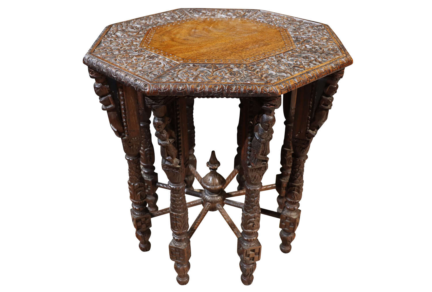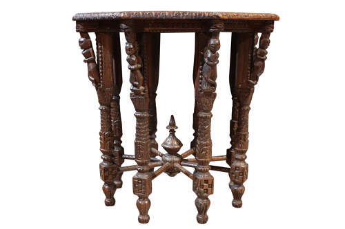 The octagonal top is finely worked with scrolling foliate motifs surrounding a central plain panel, framed by a deeply carved border with excellent depth and definition. Beneath, the table is supported on multiple turned and carved legs, each enriched with figural and geometric detailing, united by radiating stretchers centred on a turned finial, creating both structural strength and visual drama.