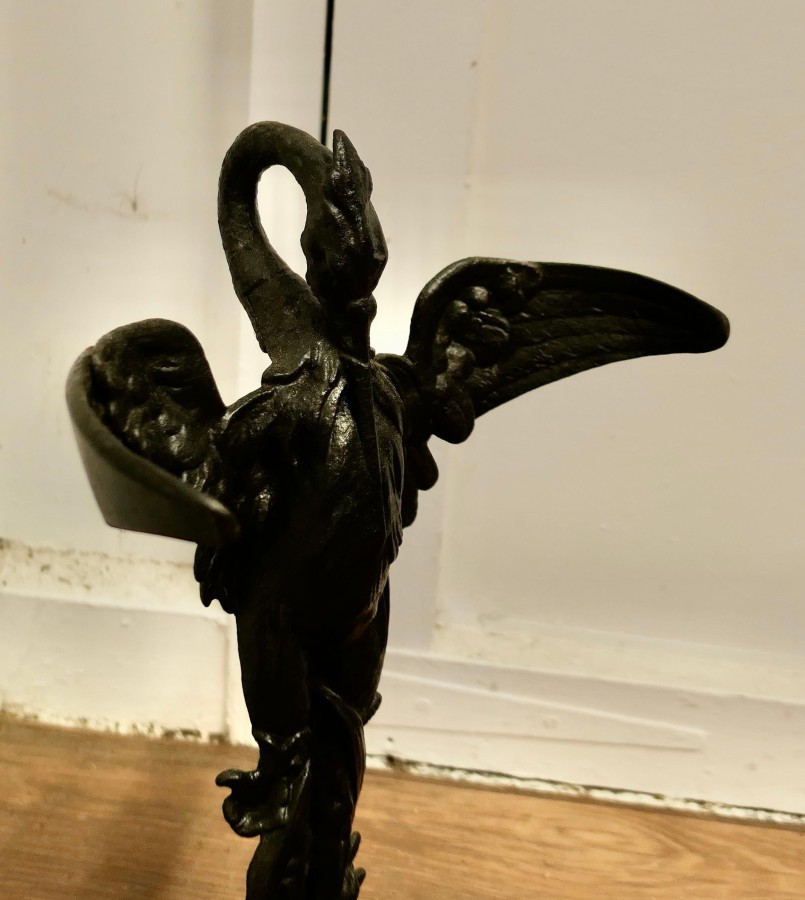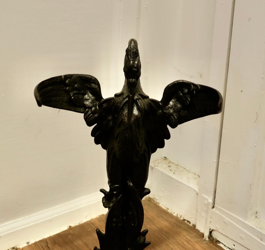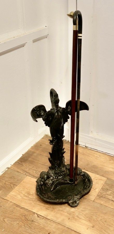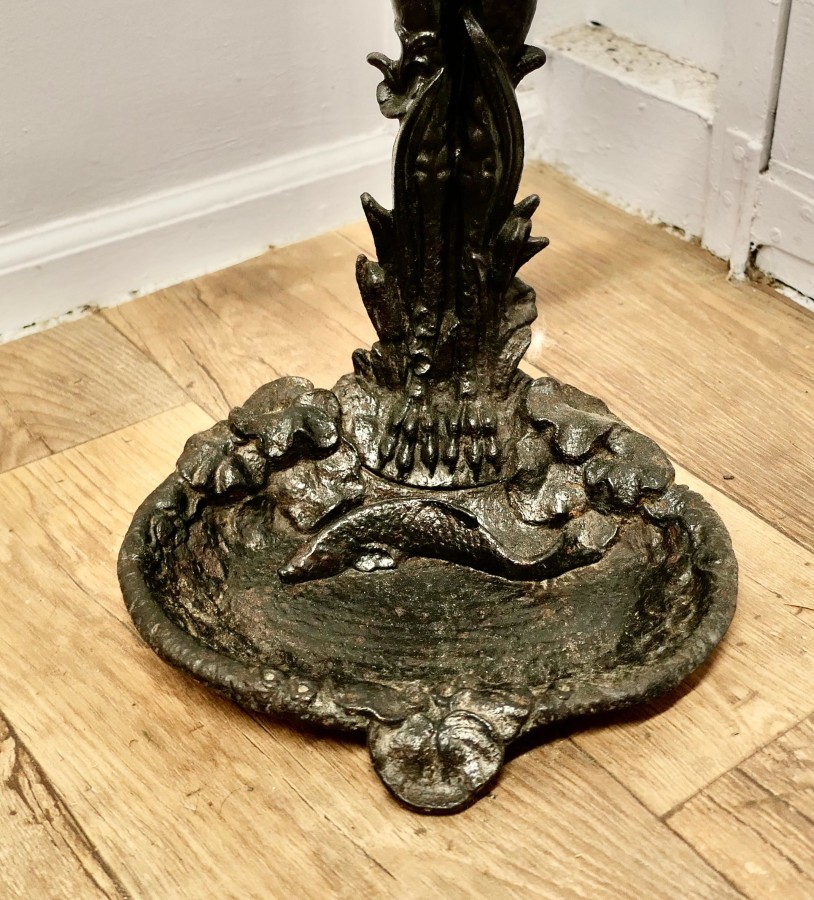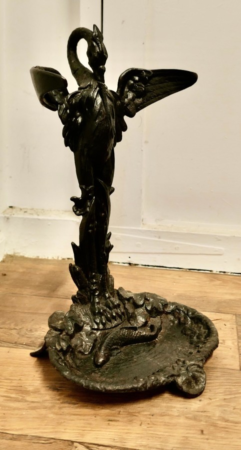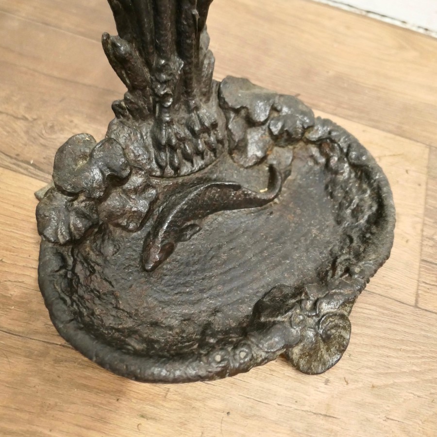 A 19th Century French Cast Iron Umbrella Stand. 19th Century French Cast Iron Umbrella Stand this is a beautifully detailed piece showing a stork standing over the water watching a fish in the pond below. The bird’s outstretched wings curve to hold the umbrellas upright and the pond forms a dish to collect water from dripping umbrellas. In good sturdy condition, with old black paint, the stand is 21” tall, and 12” x 12” SW190 Manufacture Date : 1900 Materials : Iron