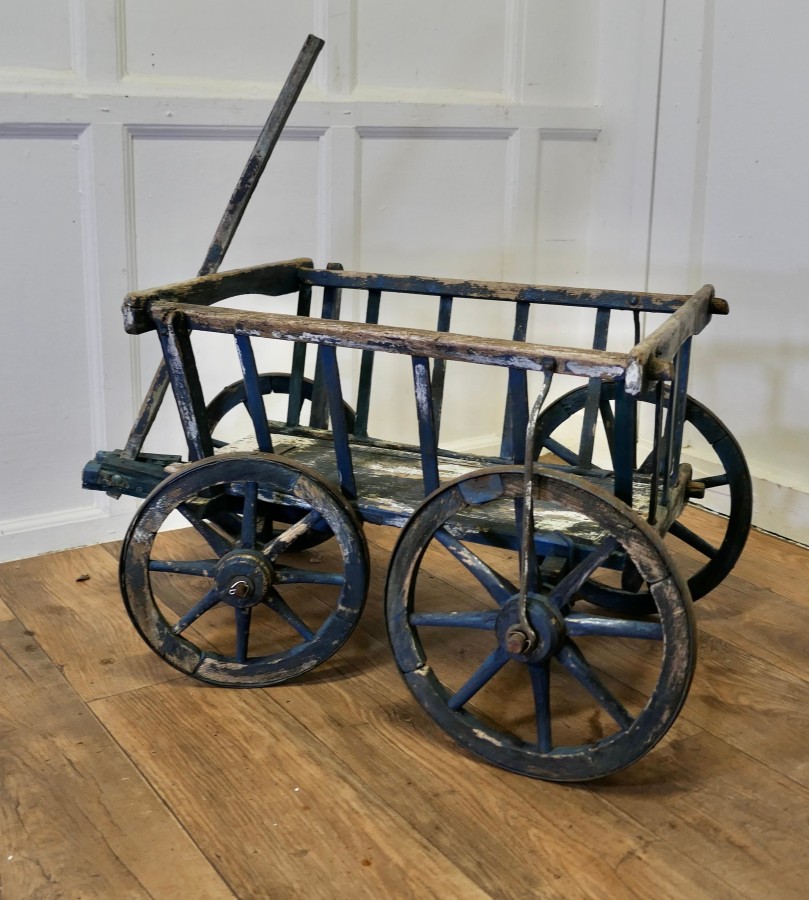A 19th Century Market Garden Hand Cart or “Dog Cart” The cart or Barrow is made in pine it is in good sound condition, it has been stored indoors and so not had to suffer harsh weather The cart has big iron bound wheels and very easy to manoeuvre with its long wooden handle This is a sturdy thing, the finish is a bit shabby but a very useful piece and work very well as a Garden Barrow or even as a shop or market display piece The length of the cart is 36” and it is 24” wide and 20” high, TSC199 Manufacture Date : 19th century Materials : Pine