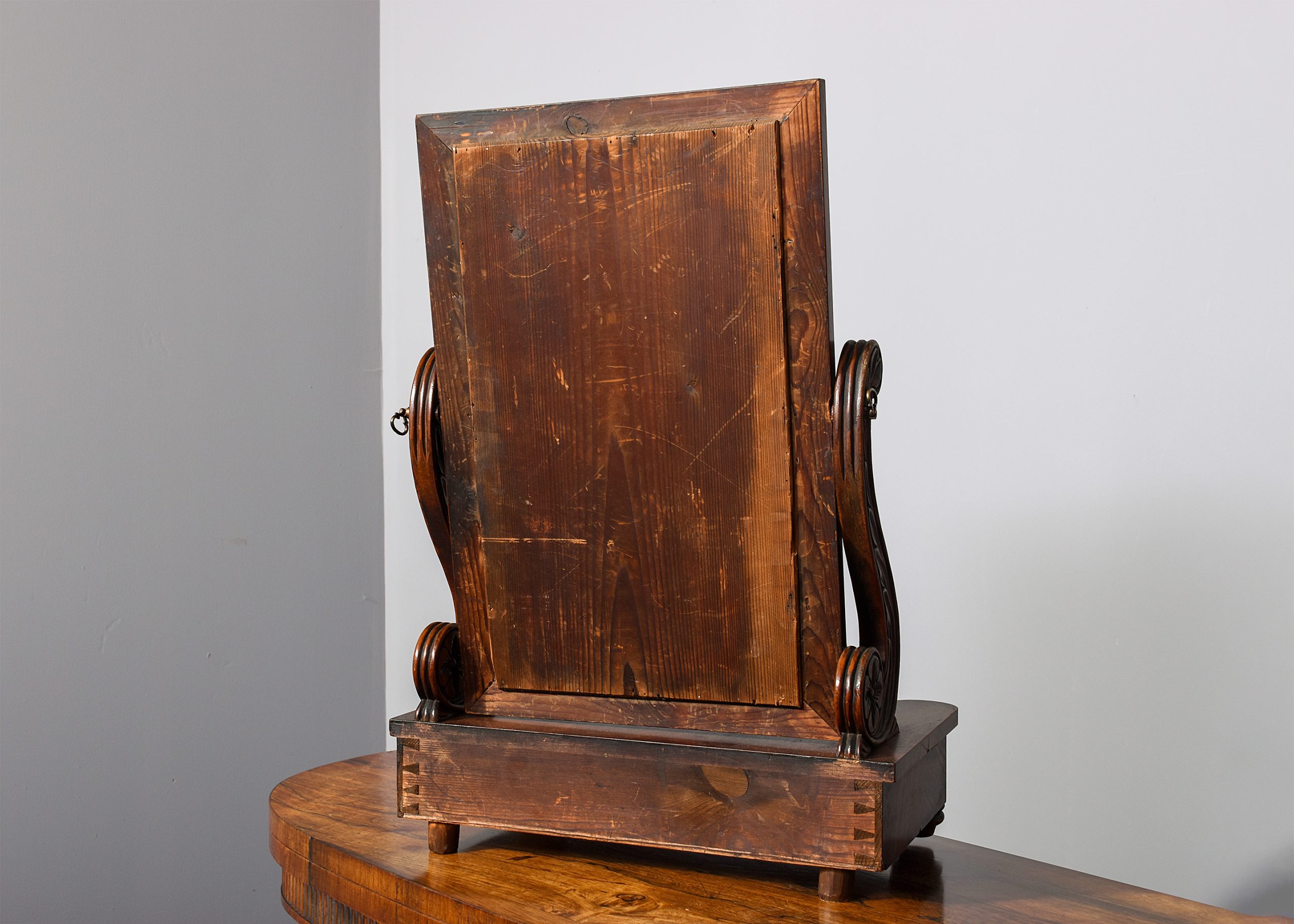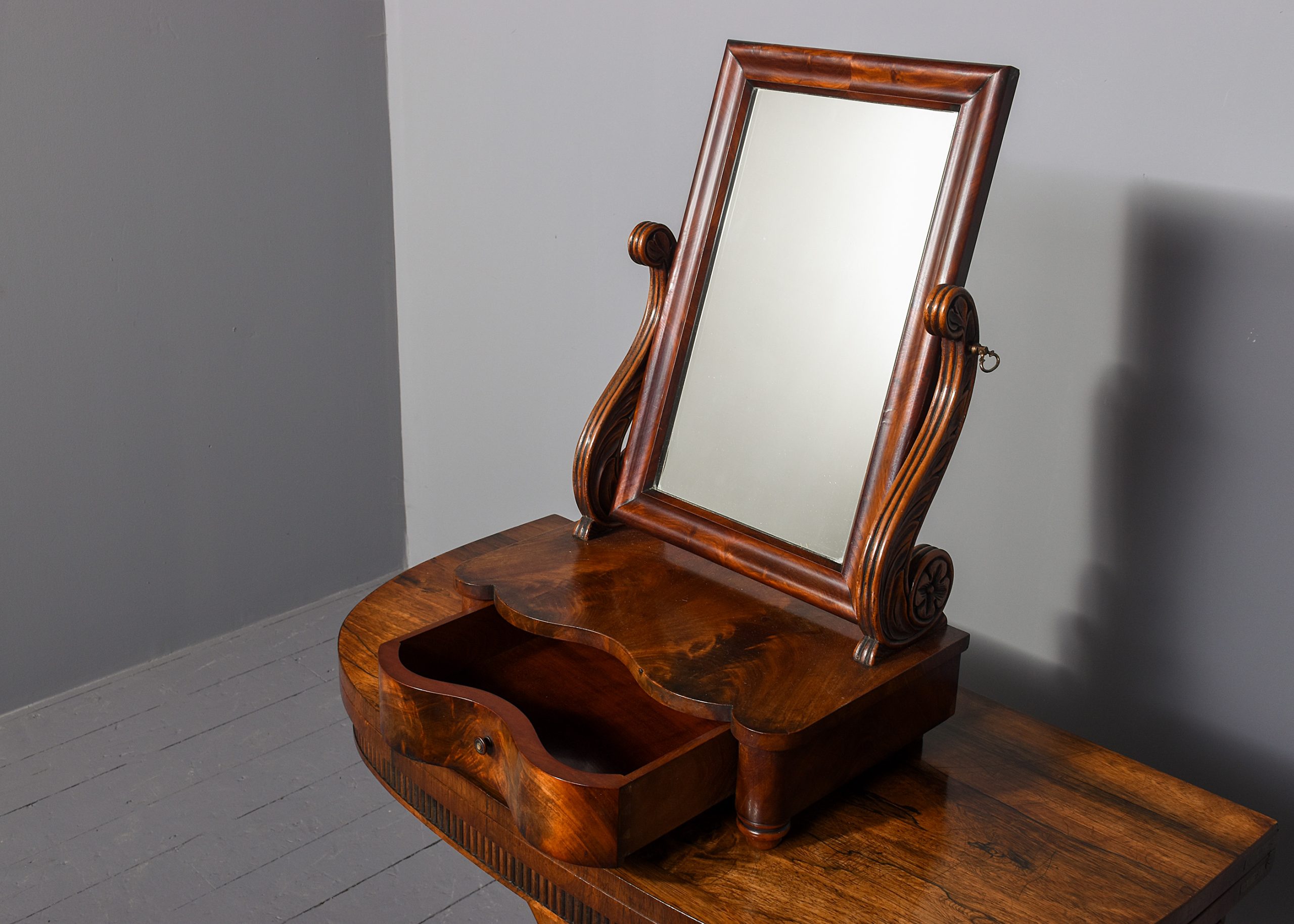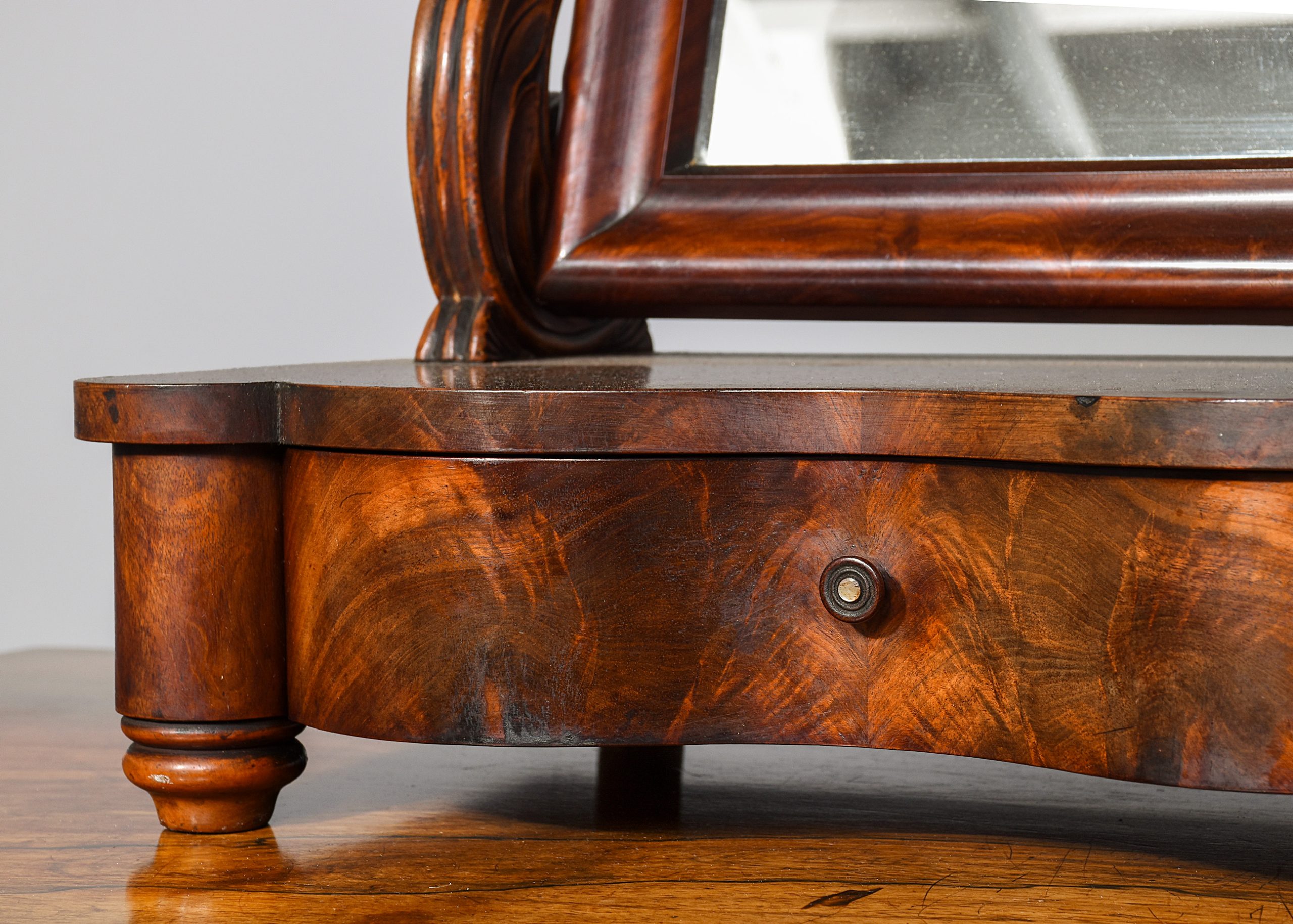 Circa 1840. A Biedermeier influence early 19th Century flame mahogany dressing mirror. The rectangular mirror within a moulded frame, its glass plate in good condition, and supported on two acanthus and rosette carved supports with brass axe head handles above a flame mahogany base with a shaped front drawer with turned knob handle, flanked by columns and all on short turned feet.