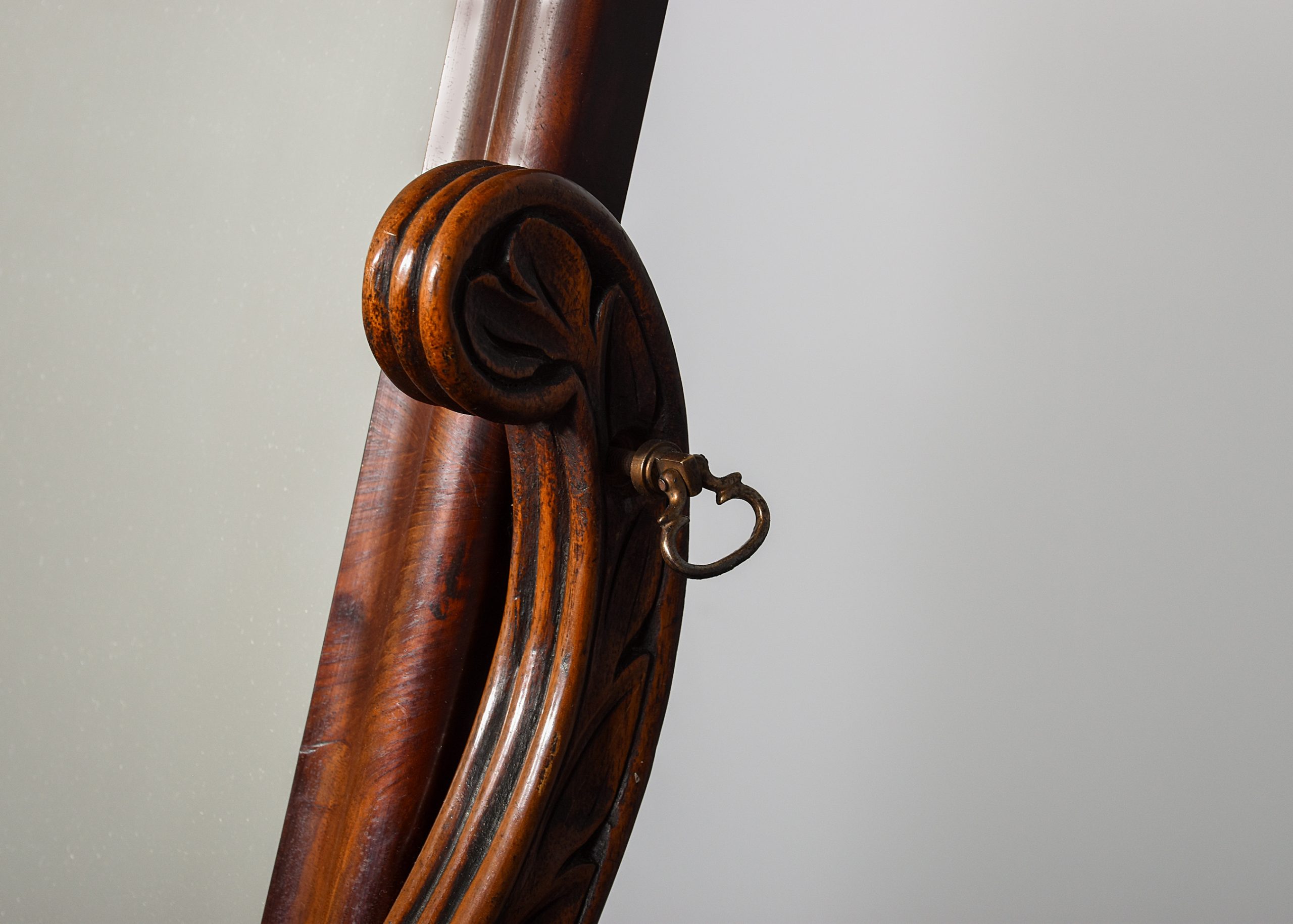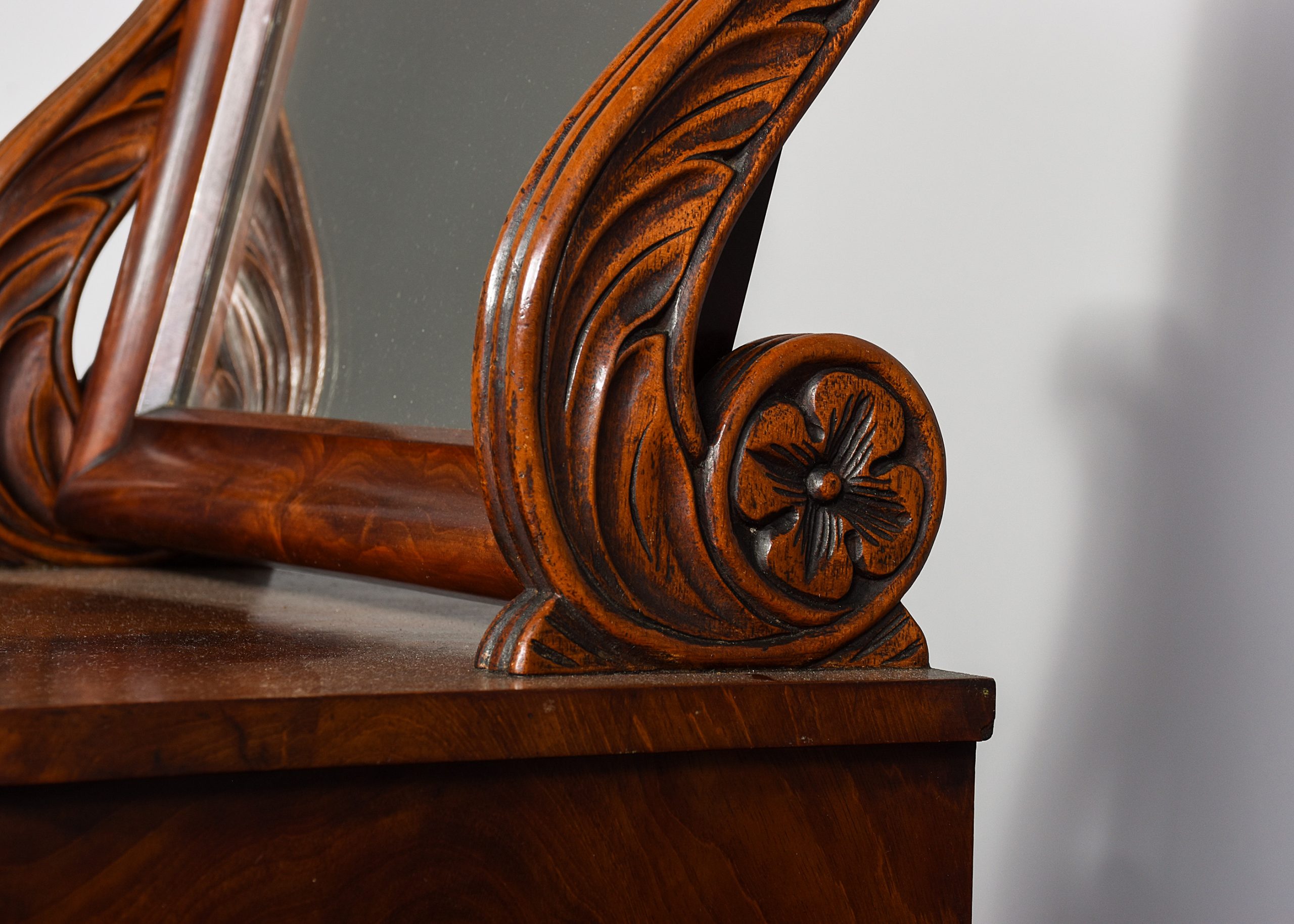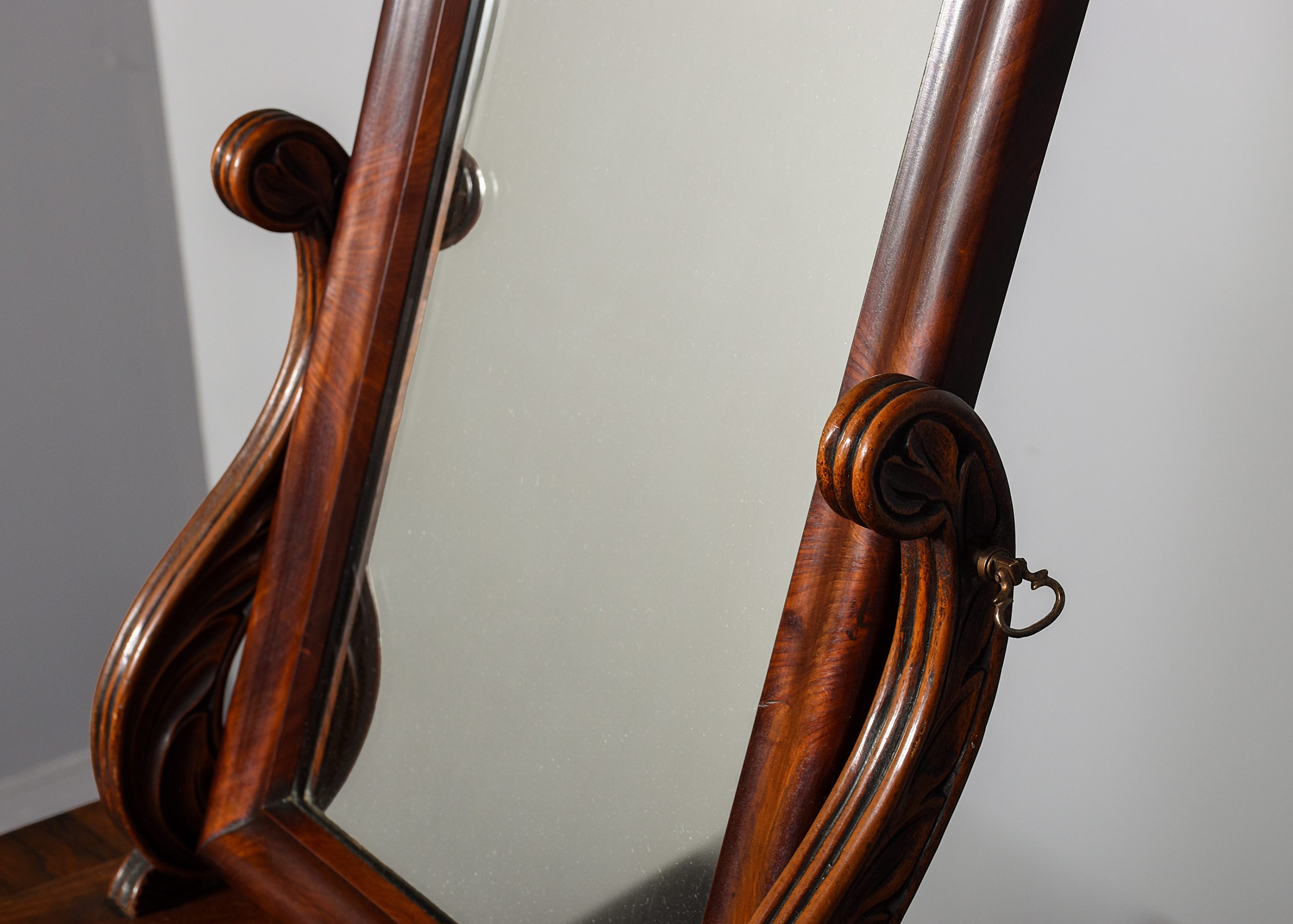 Circa 1840. A Biedermeier influence early 19th Century flame mahogany dressing mirror. The rectangular mirror within a moulded frame, its glass plate in good condition, and supported on two acanthus and rosette carved supports with brass axe head handles above a flame mahogany base with a shaped front drawer with turned knob handle, flanked by columns and all on short turned feet.