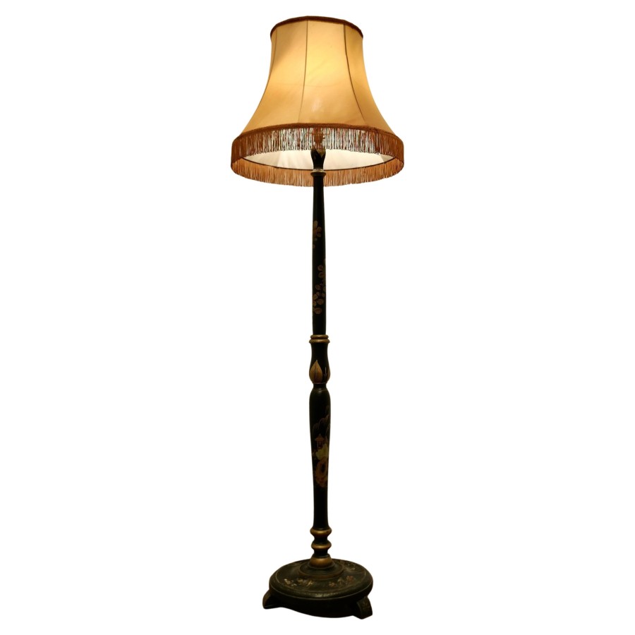 A Black Lacquer and Gold Decorated Standard Lamp This is a fine quality Chinoiserie lamp it stands on a turned round wooden base which has gold and coloured floral decoration as has the turned upright which has more scenes of flowers The lamp has its original shade, this is in a Dark Gold fabric, this can be included if requested, it has a small tear at the back which is not easily seen, the lamp is in good working condition The lamp is 62” high and the base is 14” in across TSW18 Manufacture Date : 1920 Materials : Lacquer