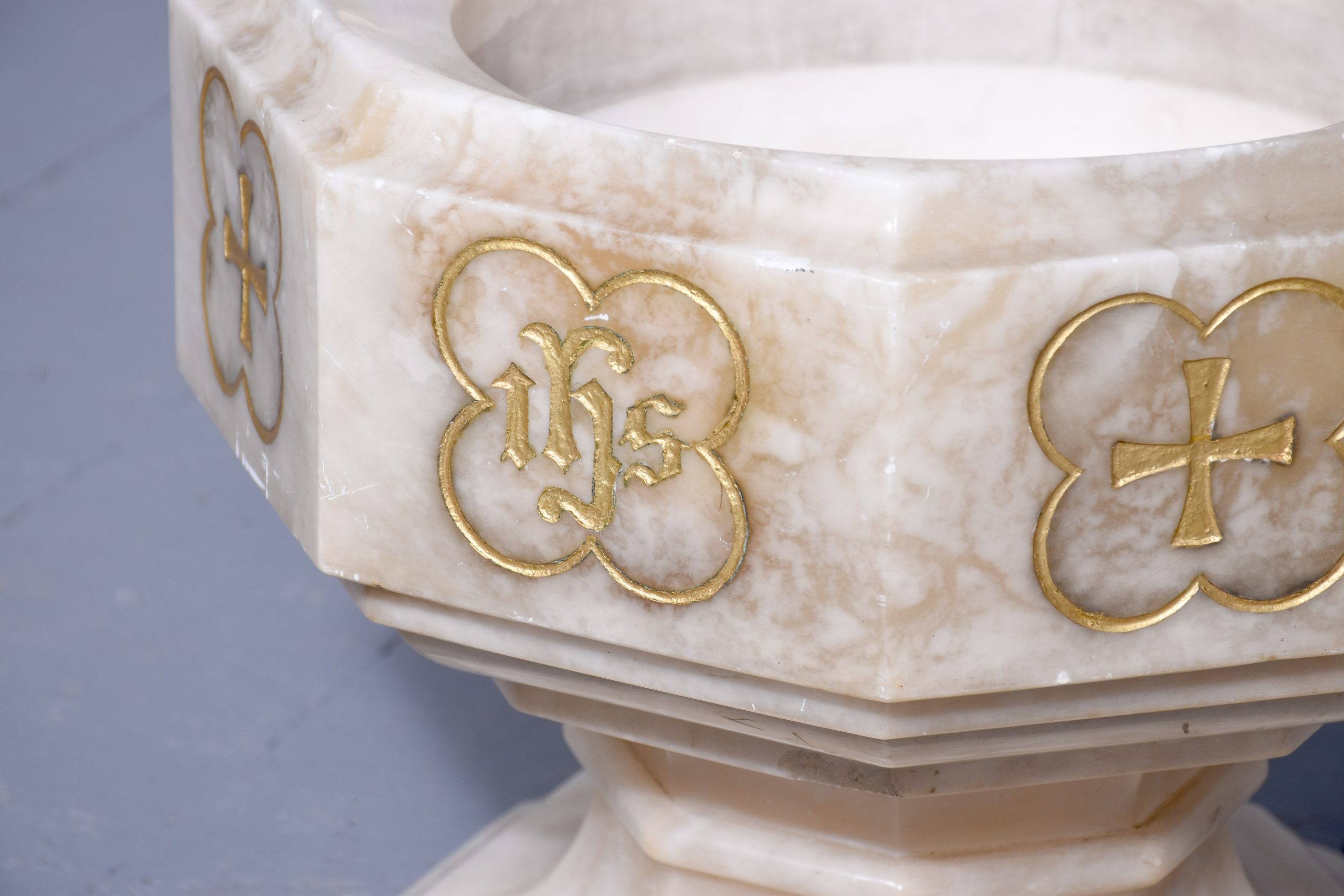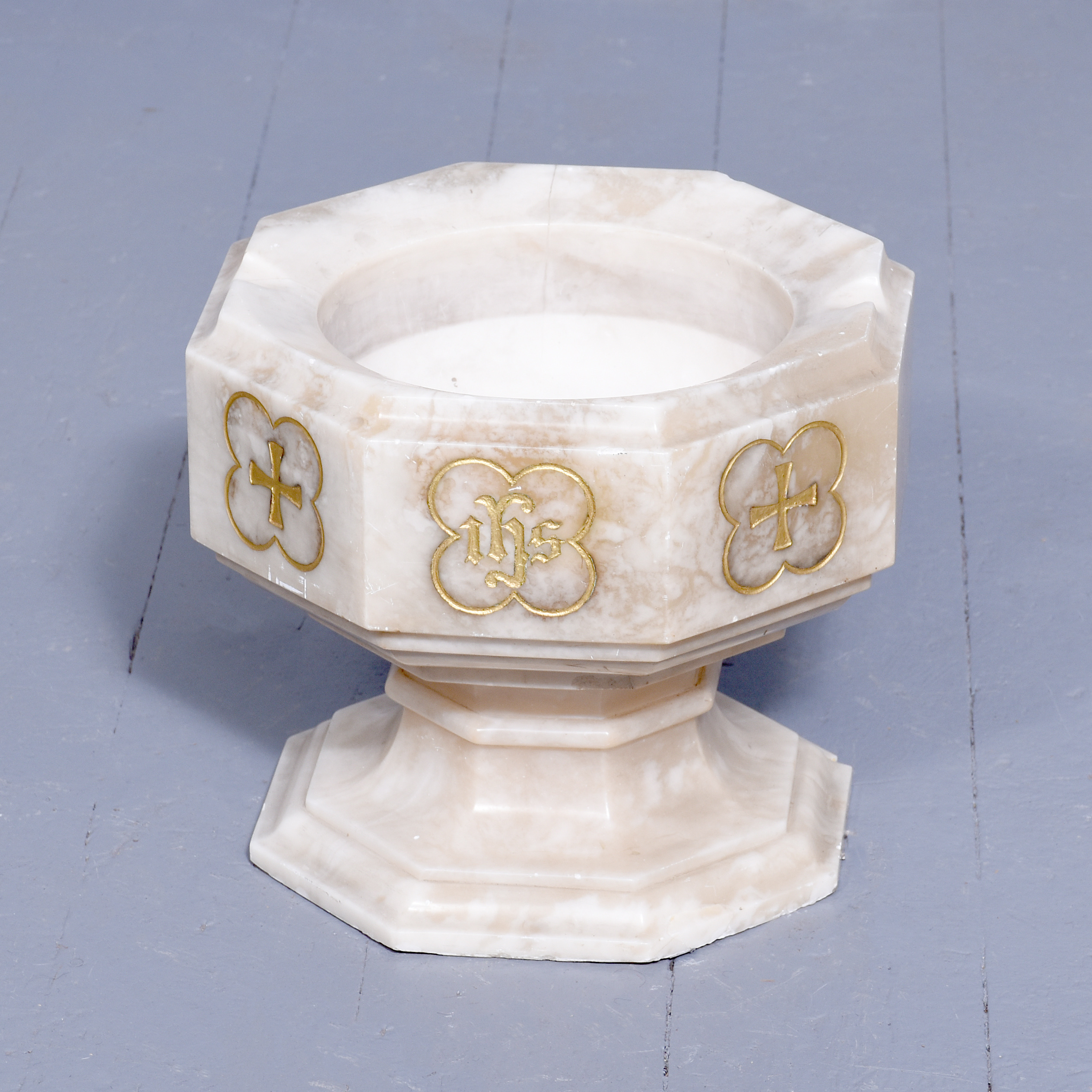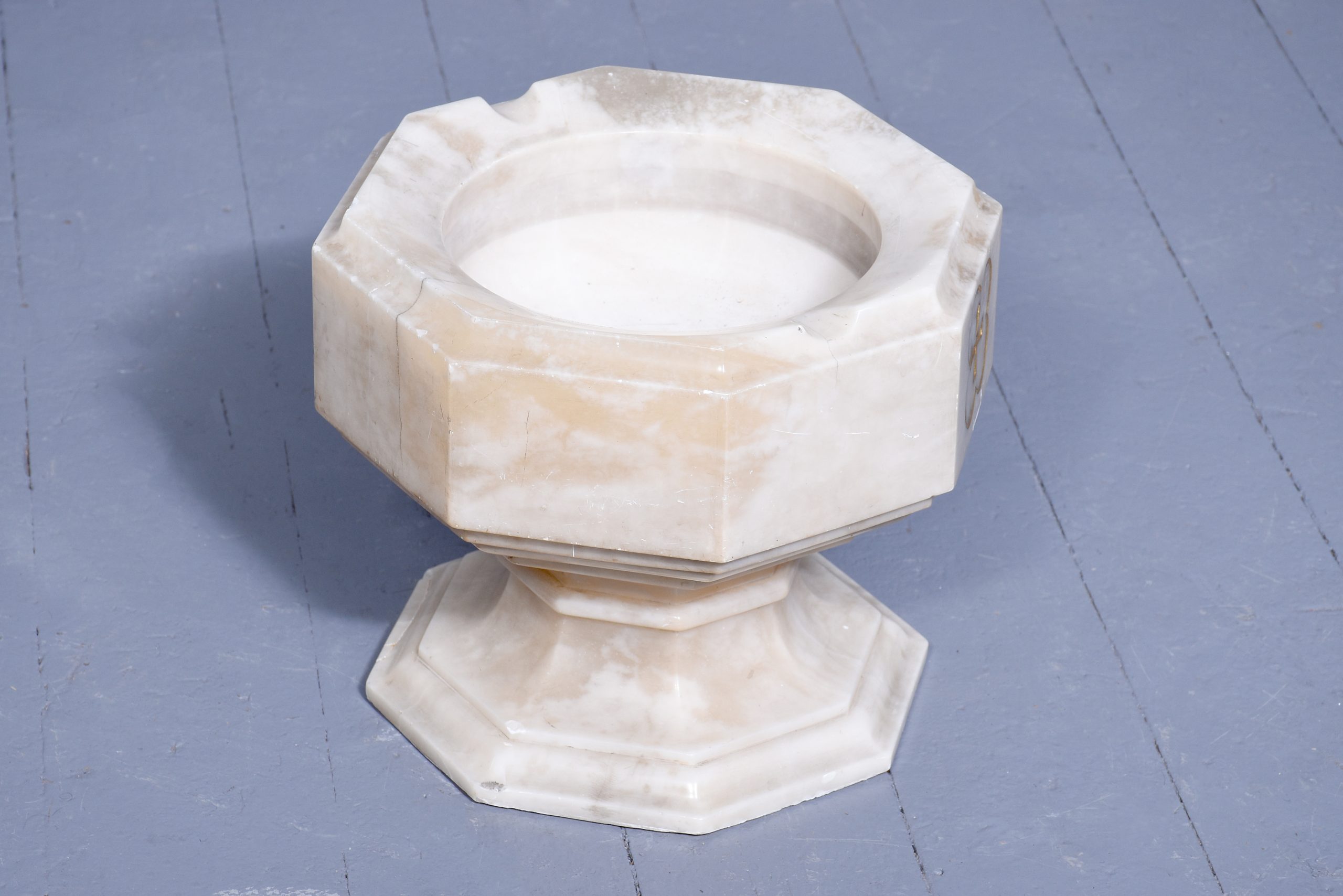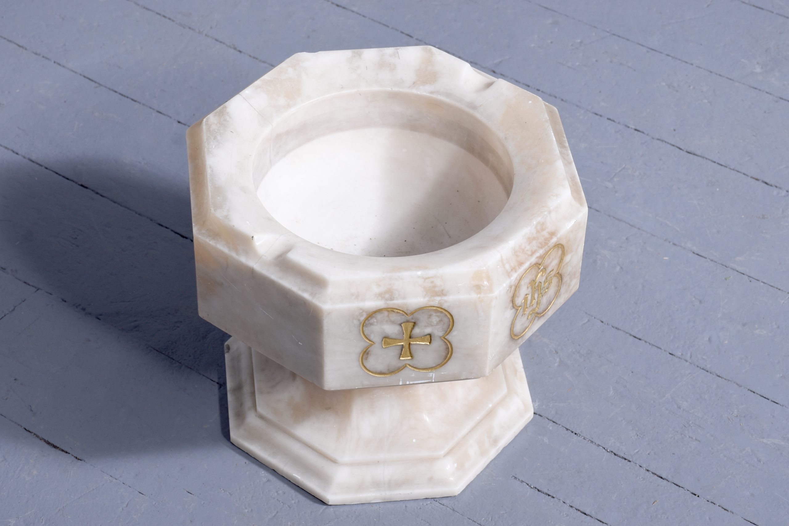 Circa 1920. A stylish carved alabaster font, the octagonal shaped body with a raised sloping fore-edge hollowed to the centre, three of the faces are carved and gilded, supported on a faceted stem, resting on a flat base with moulded edge. Could be used for keys or fruit.
