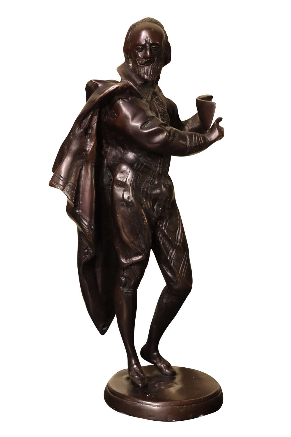 Shakespeare is shown standing in period dress, his cloak draped over one shoulder and his pose conveying both movement and quiet authority. The modelling of the figure is detailed, with careful attention paid to the facial features, beard, and the folds of the costume, giving the piece depth and visual interest from all angles. The surface displays a rich, dark bronze patination, which adds warmth and highlights the sculptural detail.