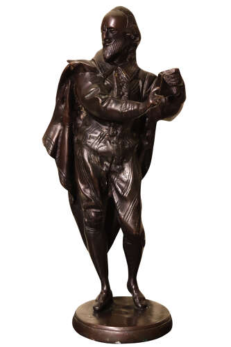 This finely modelled cast bronze figurine depicts William Shakespeare and is a well-executed decorative sculpture with strong presence and character. Standing 32 cm tall and weighing approximately 2.8 kilograms, the piece has a pleasing sense of solidity and balance, enhanced by its circular bronze base.