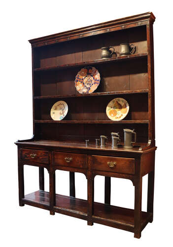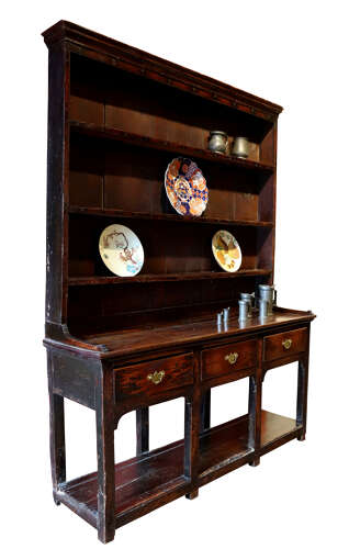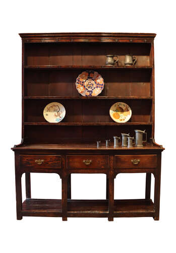 A wonderfully honest and substantial Welsh oak dresser, late 18th century, displaying all the charm and integrity expected of a true country house piece. The upper rack survives in original form, with triple fixed shelves and wide backboards, showing a rich, dry, age-darkened surface.